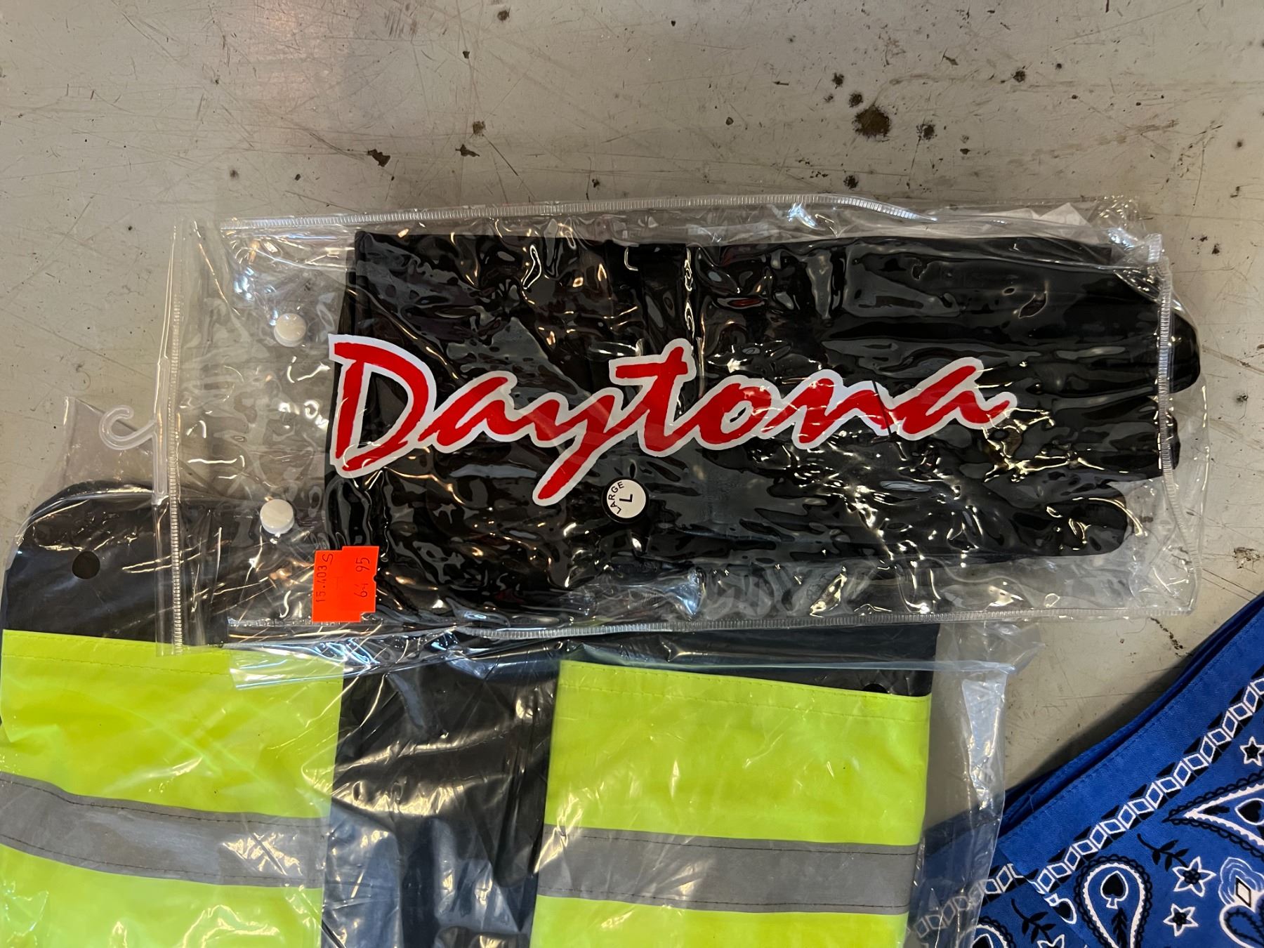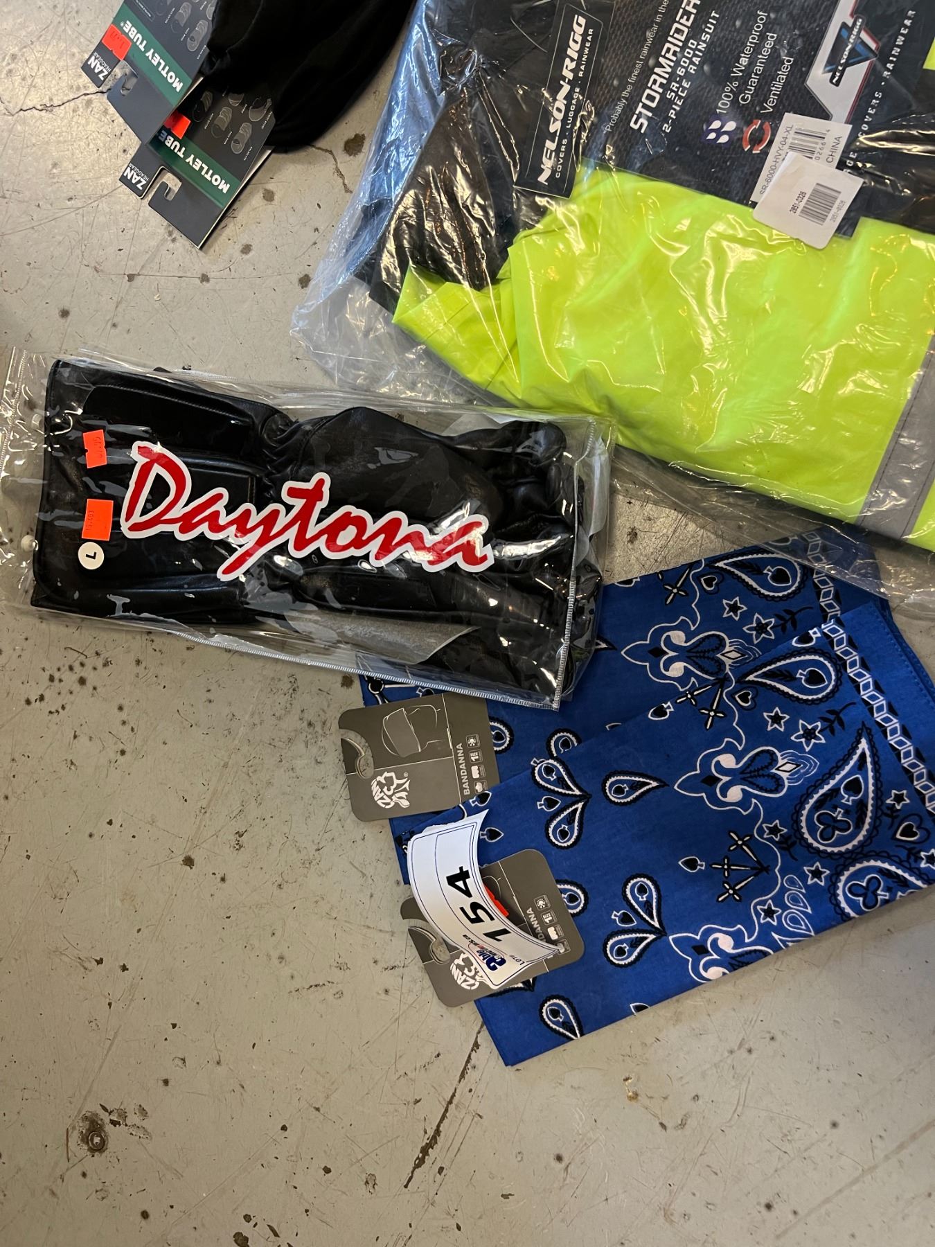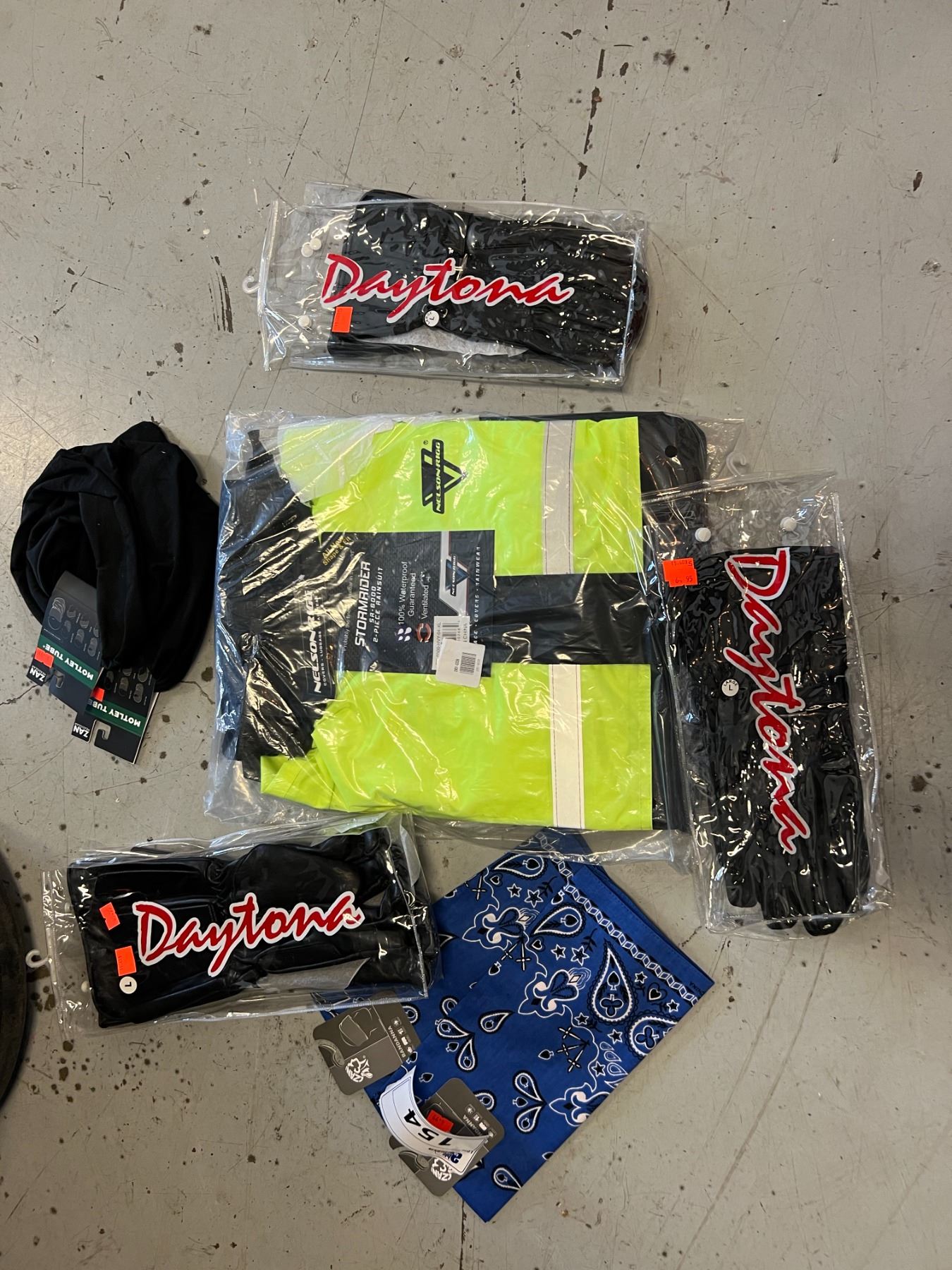 STORMRIDER SR6000 2 PIECE RAIN SUIT (XL), 2 X MOTLEY TUBE BANDANAS, 2 X BLUE BANDANAS, 2 X PAIRS DAYTONA MEDIUM LENGTH RIDING GLOVES (SIZE L), 1 PAIR DAYTONA LEATHER LONG LENGTH RIDING GLOVES (SIZE L)
