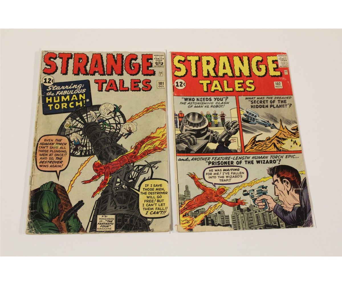 STRANGE TALES #101 & 102 (1962) 2 KEY ISSUES #101 - HUMAN TORCH BEGINS BY KIRBY, #102 - 1ST APP. WIZARD. LOWER GRADE COPIES - #101 - COVER DETATCHED, # 102 - BOTTOM CORNER MISSING THRU BOOK, DOES NOT AFFECT STORY. BOTH ARE COMPLETE & SUPPLE.