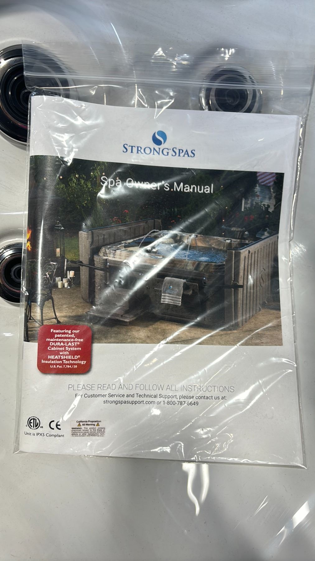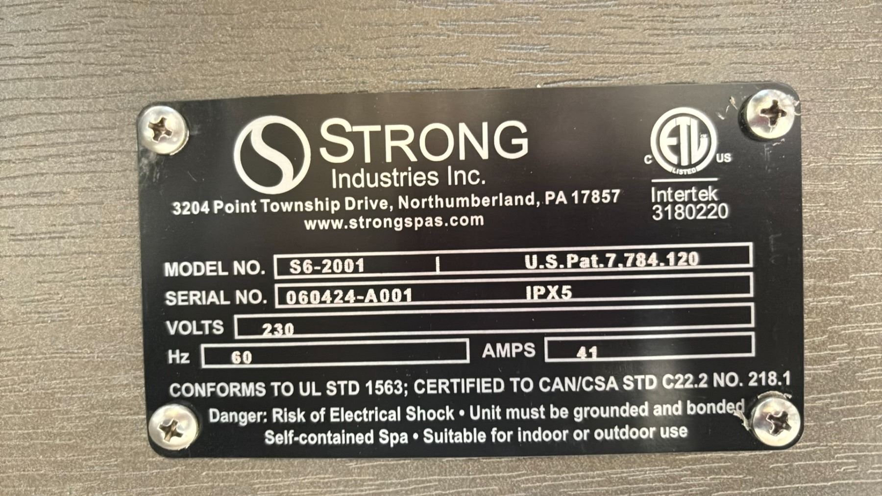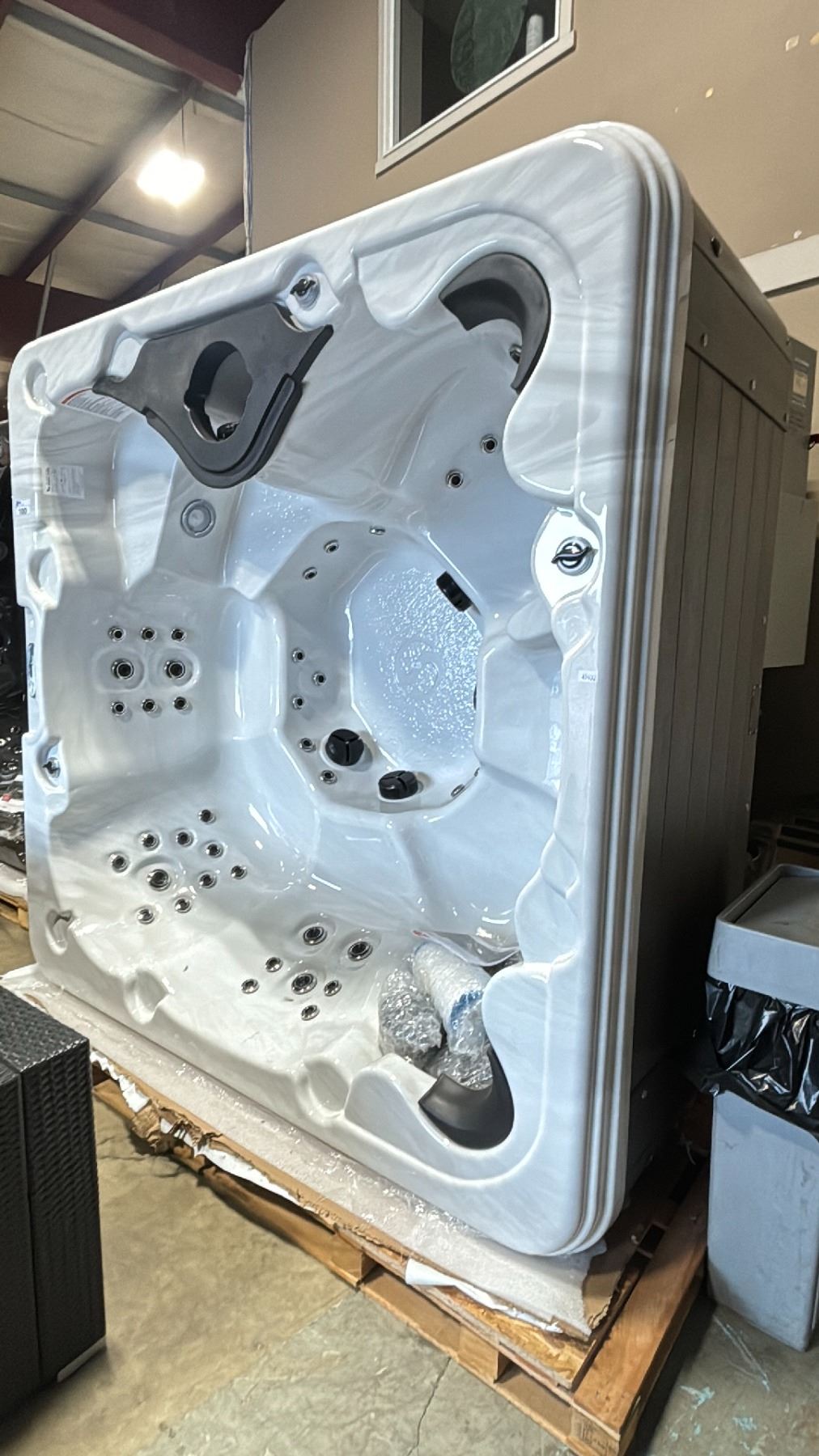 STRONG SPAS VIENNA EMBARK SERIES E70, SEATING CAPACITY 5 NON-LOUNGER, 70 TWO TONE STAINLESS STEEL JETS, OUTERBANKS GREY / STERLING SILVER COLOR DIMENSIONS; 85 X 85 X 36", 2 X 5BHP PUMPS, 240V, SCONCES, UNDERWATER LED, "S" LED CONTROLS, LED WATERFALL, OZONE AND SOFT COVER INCLUDED