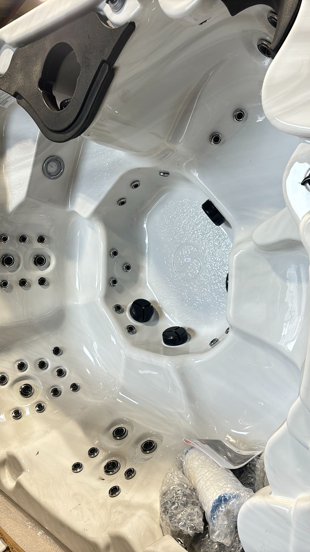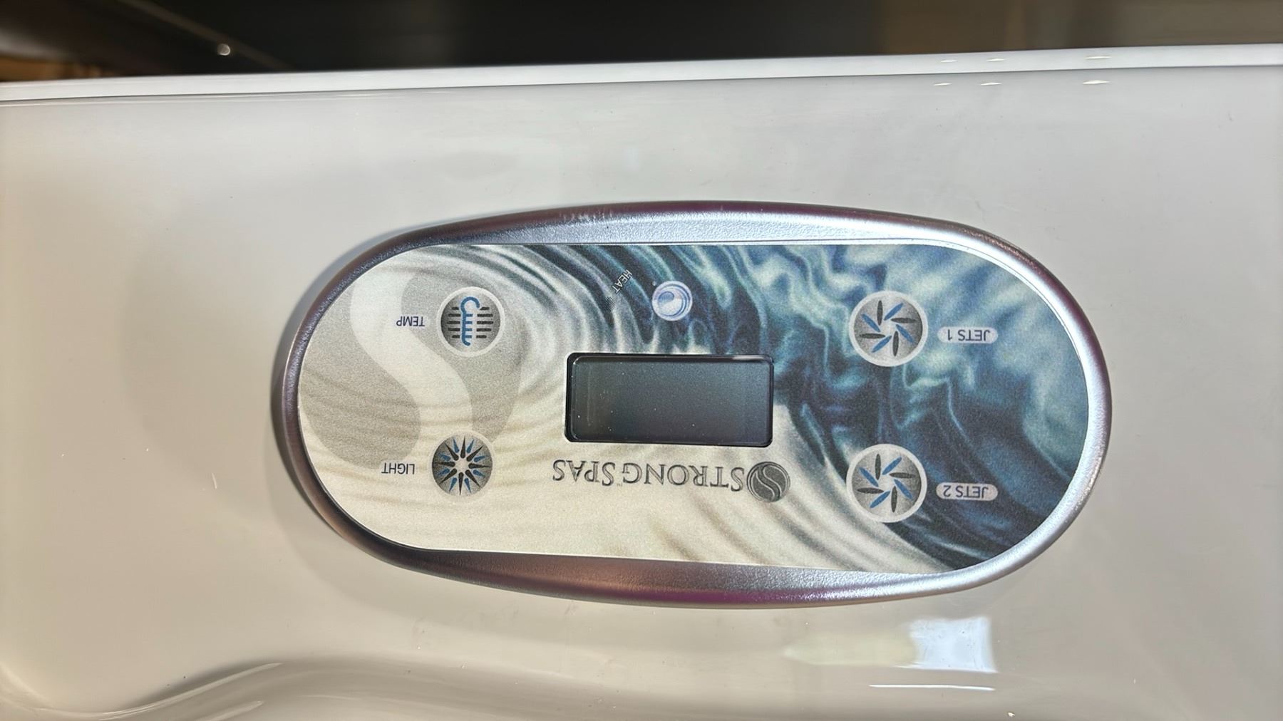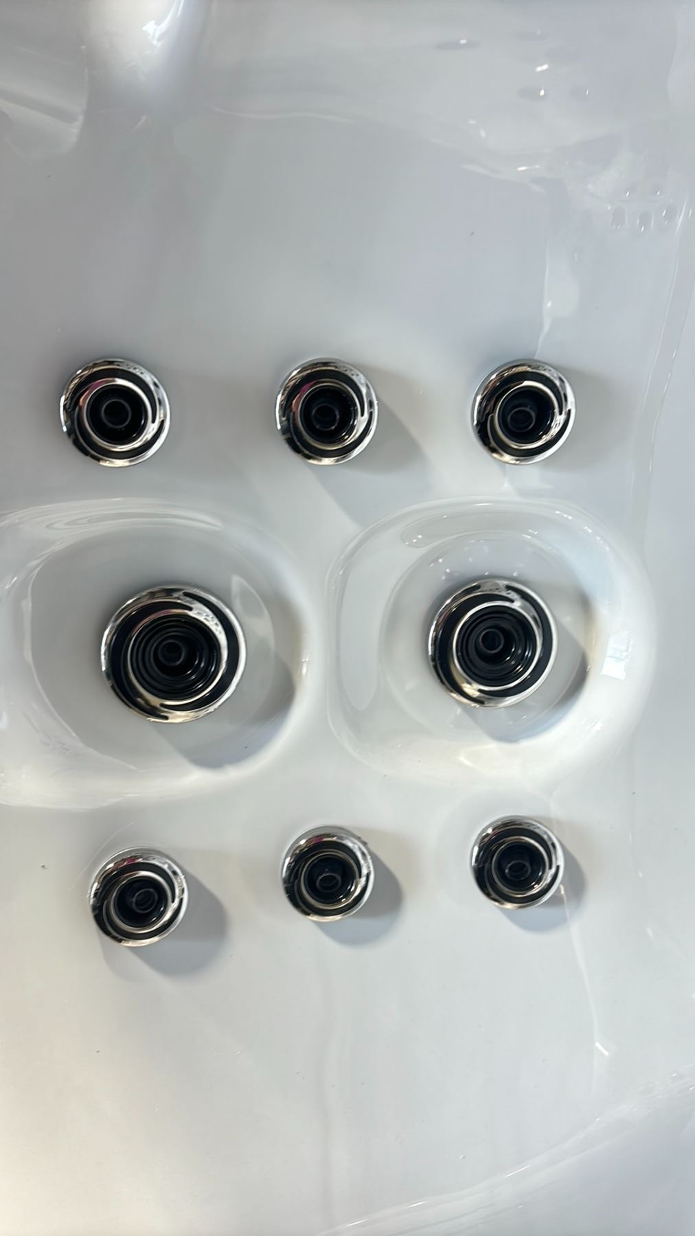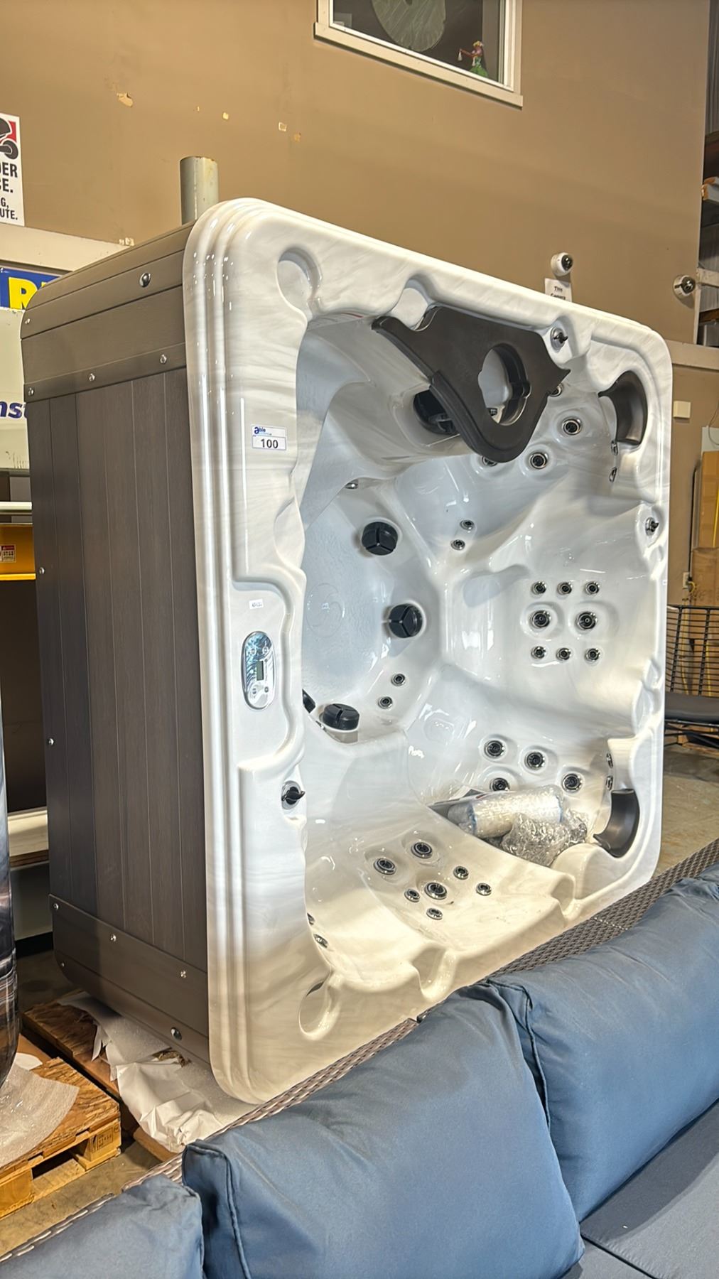 STRONG SPAS VIENNA EMBARK SERIES E70, SEATING CAPACITY 5 NON-LOUNGER, 70 TWO TONE STAINLESS STEEL JETS, OUTERBANKS GREY / STERLING SILVER COLOR DIMENSIONS; 85 X 85 X 36", 2 X 5BHP PUMPS, 240V, SCONCES, UNDERWATER LED, "S" LED CONTROLS, LED WATERFALL, OZONE AND SOFT COVER INCLUDED
