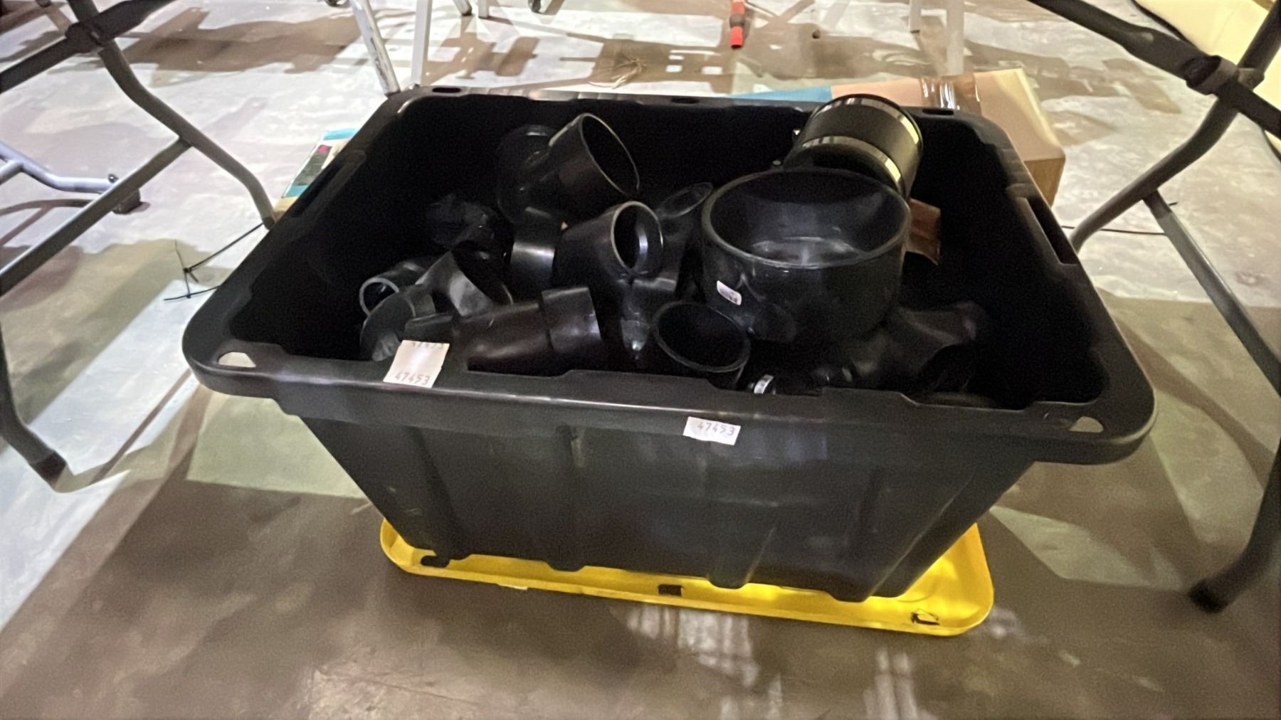 STRONGBOX 102L BIN WITH LID FILLED WITH ASSORTED PLASTIC PVC PIPE CONNECTORS