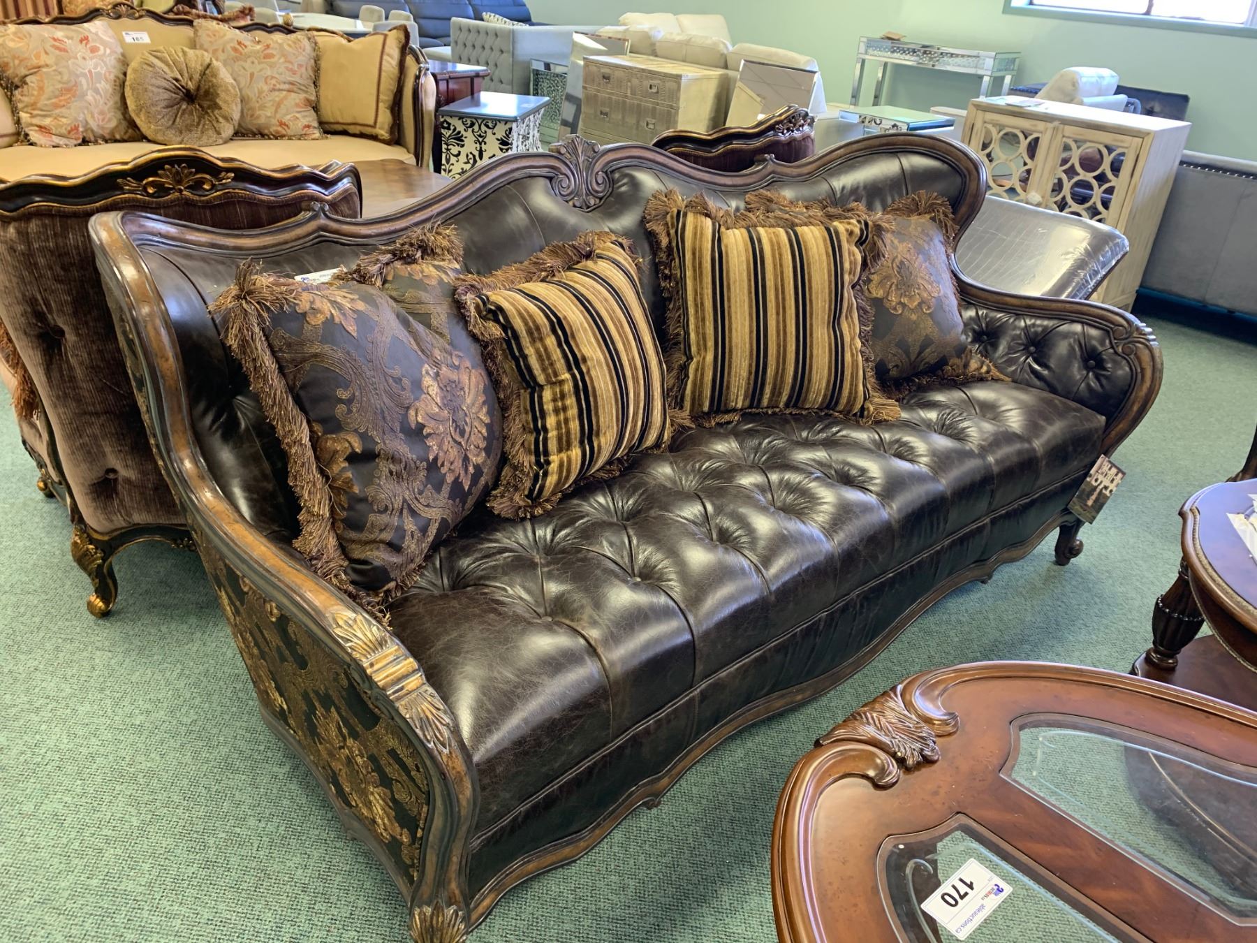 STUDDED BROWN LEATHER & WOOD CURVED BACK 3 SEAT SOFA WITH CUSHIONS
