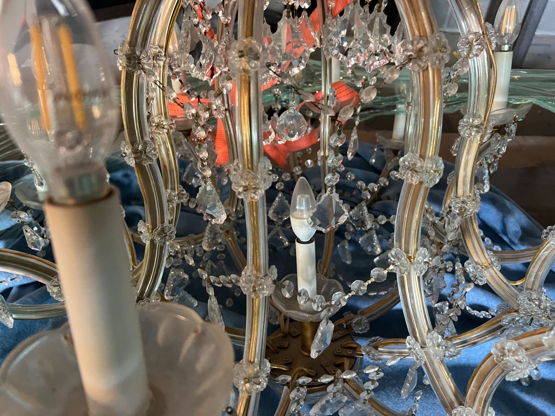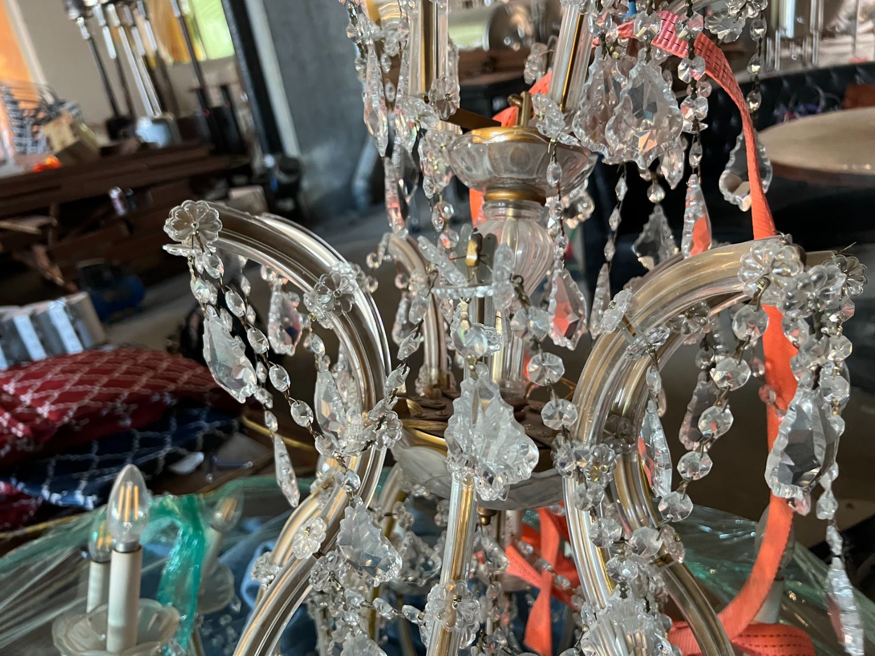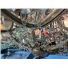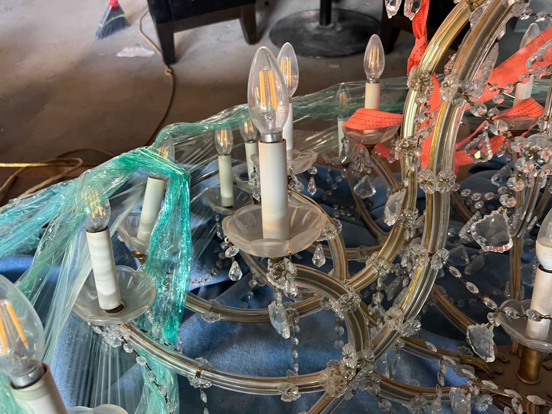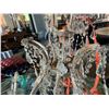 STUNNING CRYSTAL CHANDELIER. 24 CANDELABRAS. LED LIGHTS. APPROX 45" AROUND AND 3' TALL PLUS CORD AND DANGLY PIECES.
