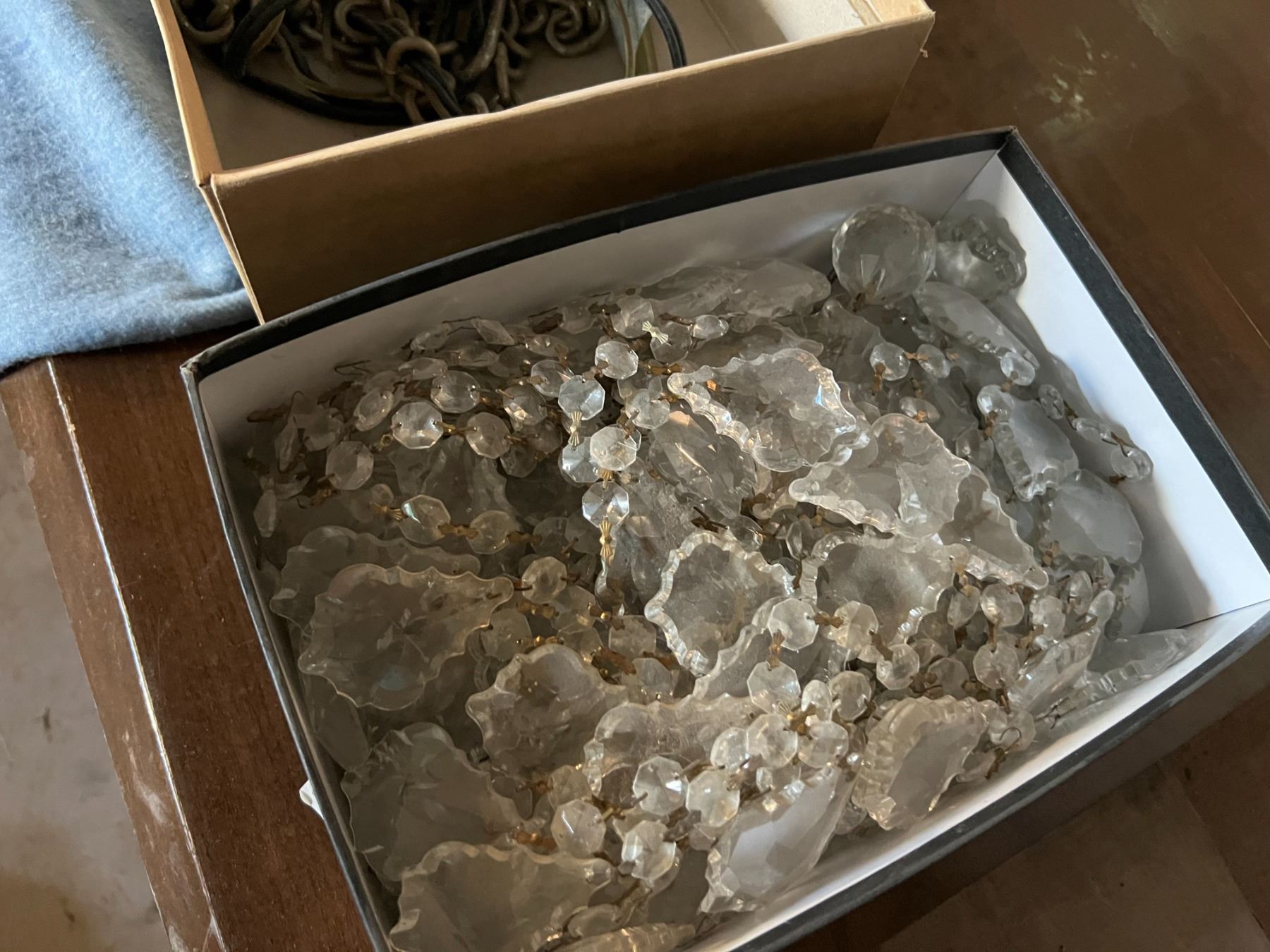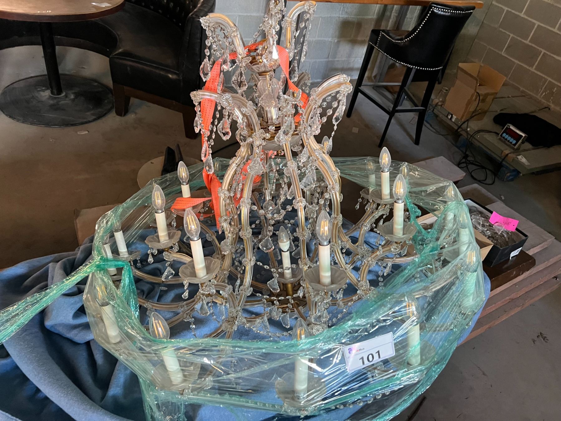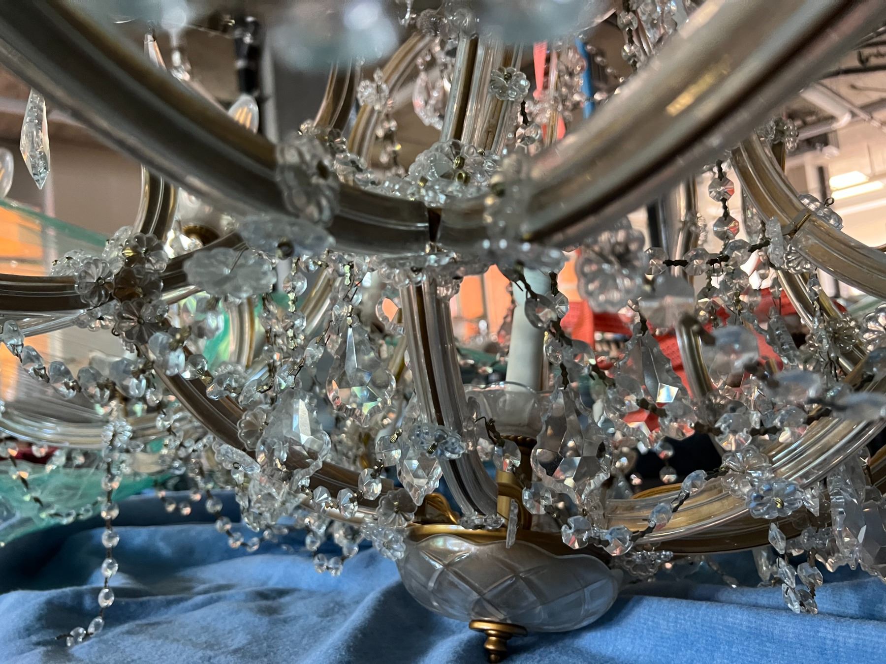 STUNNING CRYSTAL CHANDELIER. 24 CANDELABRAS. LED LIGHTS. APPROX 45" AROUND AND 3' TALL PLUS CORD AND DANGLY PIECES.