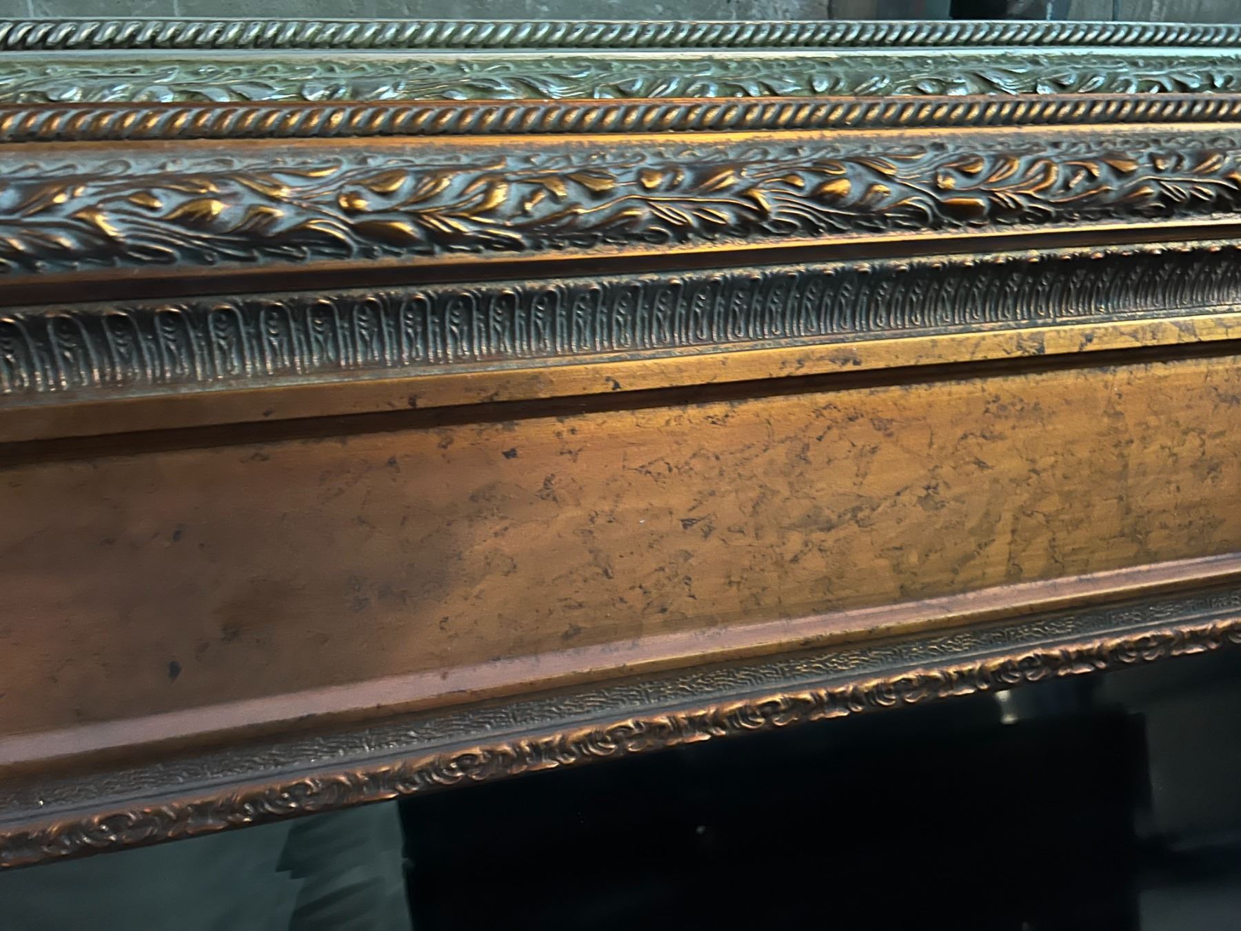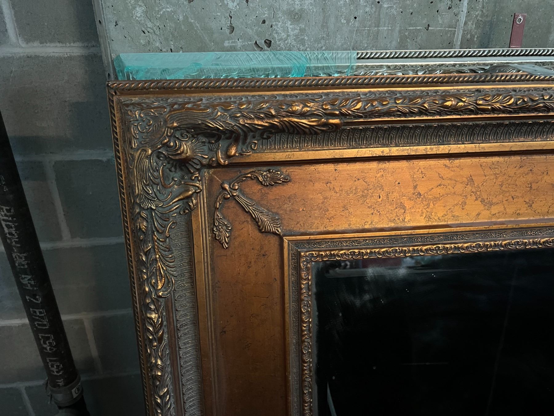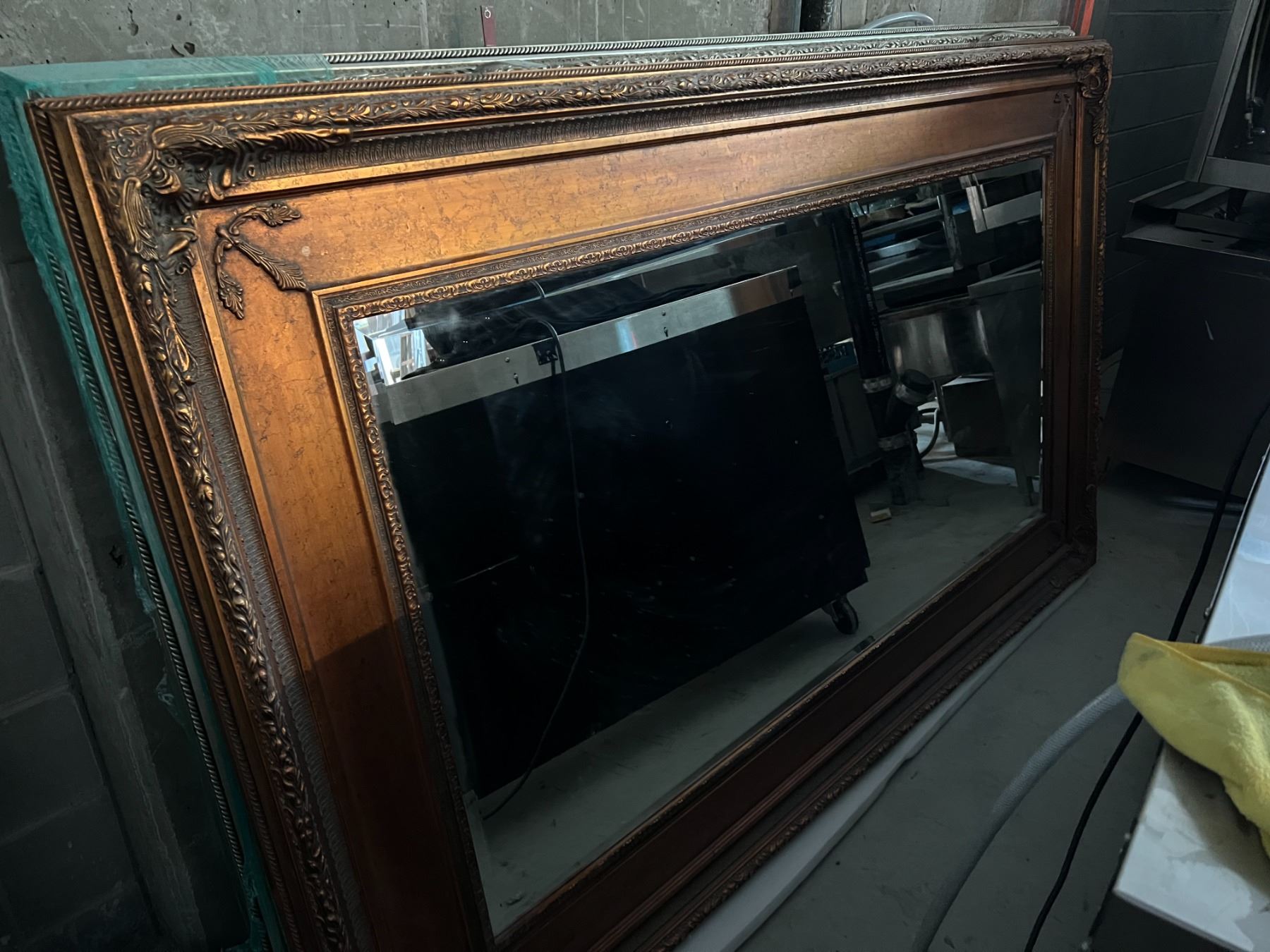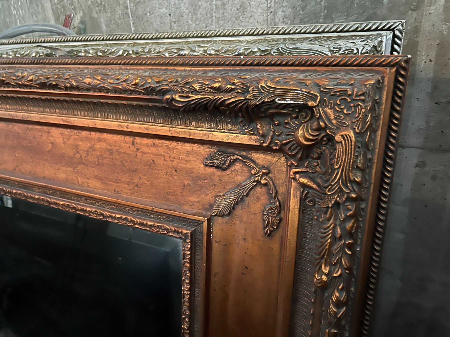 STUNNINGLY GORGEOUS BEVELED GLASS MIRROR WITH COPPER COLOURED DECORATIVE FRAME. OVERALL 92"X57". MIRROR ITSELF IS 6'X3'. HEAVY-POSSIBLY OVER 200 LBS