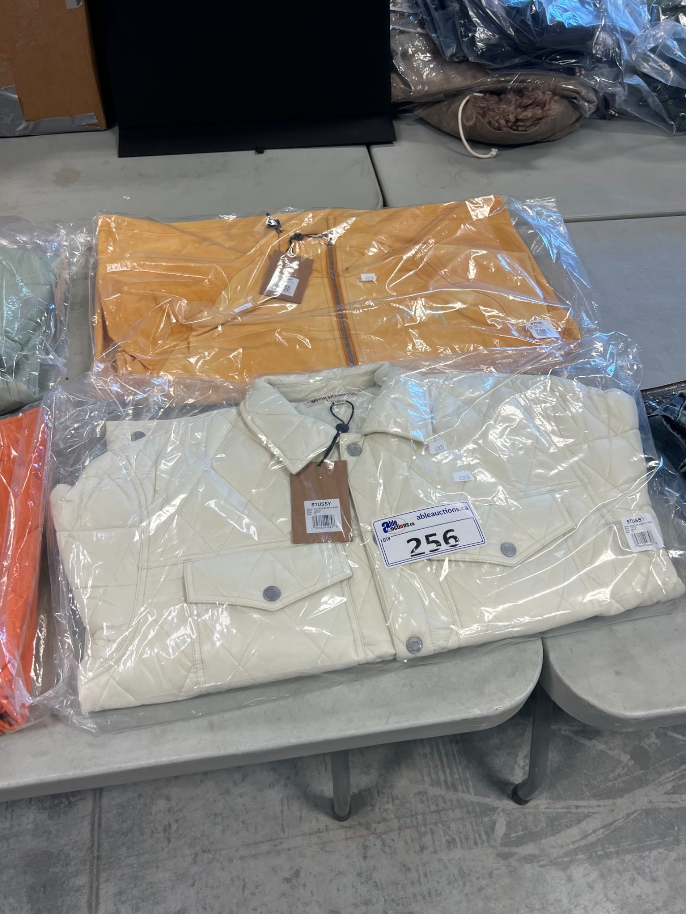 STUSSY SIZE M QUILTED NYLON RANCH JACKET BONE, AND STUSSY SIZE M WAVE DYE BEACH SHELL MUSTARD
