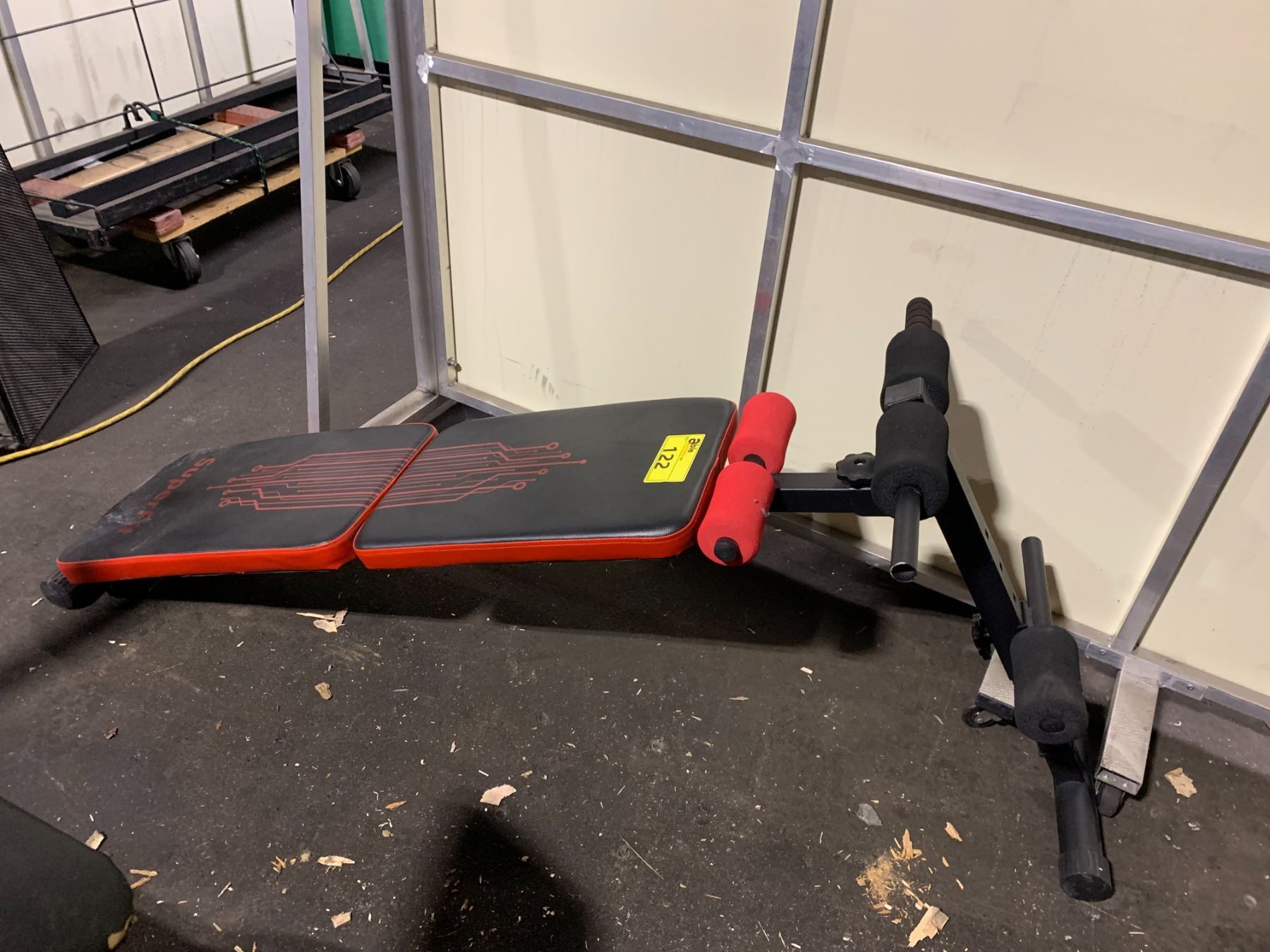 SUPER FIT COMMERCIAL BLACK/RED ADJUSTABLE BENCH & A BIN OF ASSORTED POWER MEDICINE BALLS