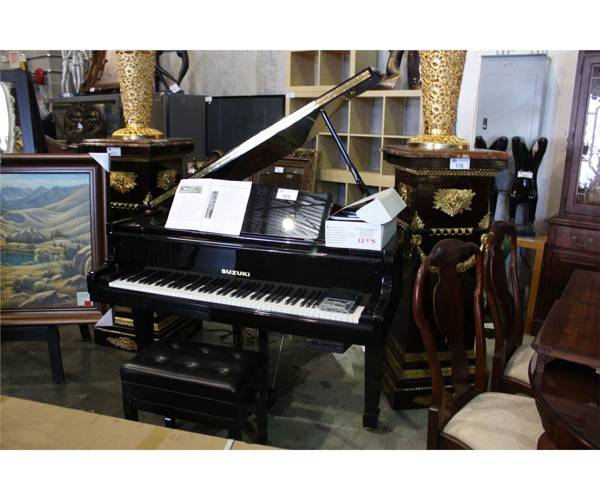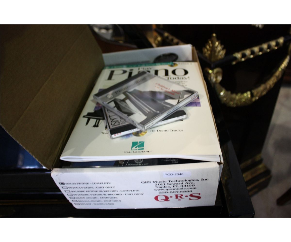 SUZUKI BABY GRAND PLAYER PIANO WITH BENCH AND BOX FULL OF MUSIC CDS (APPROX 7YEARS OLD)