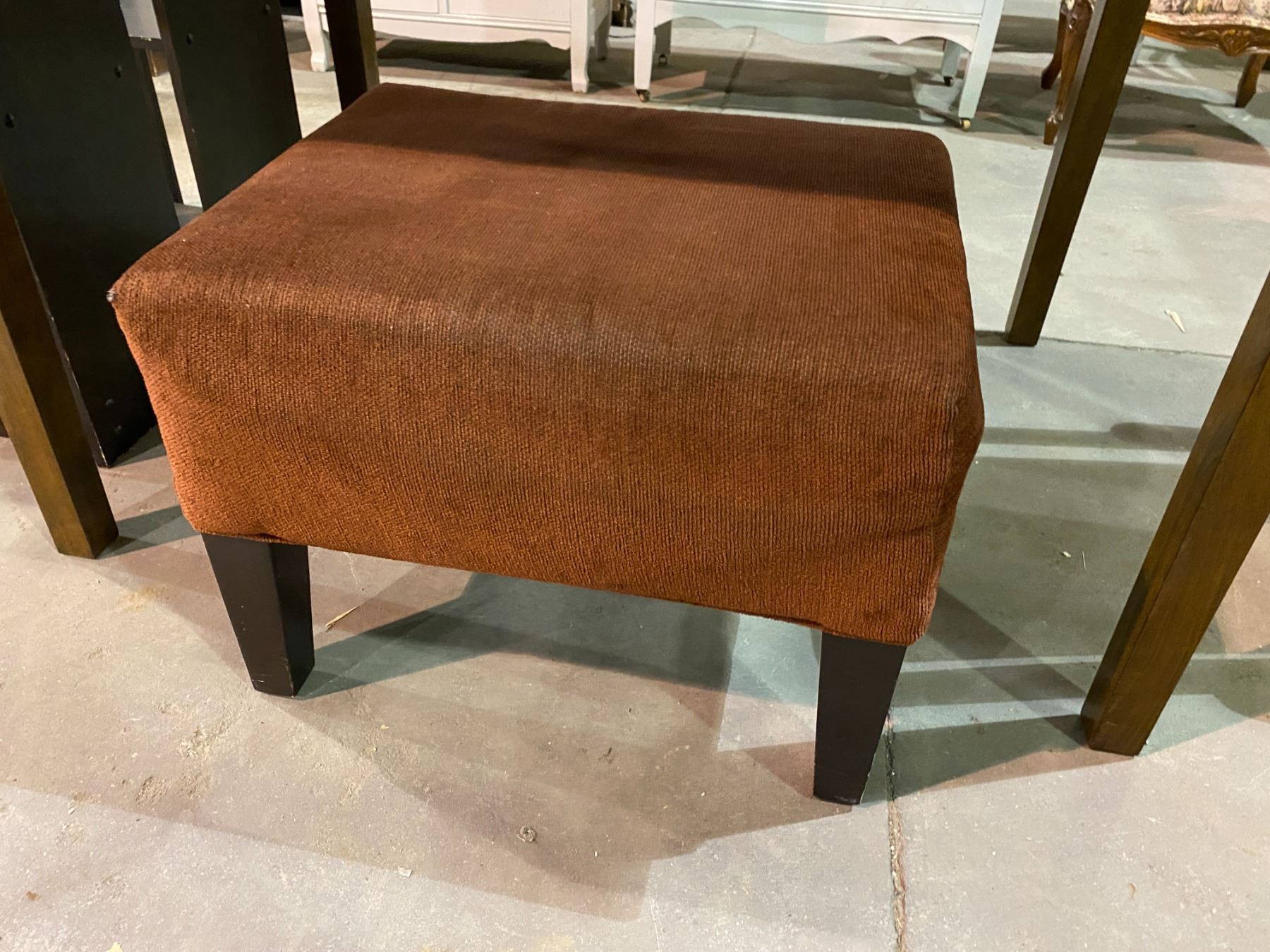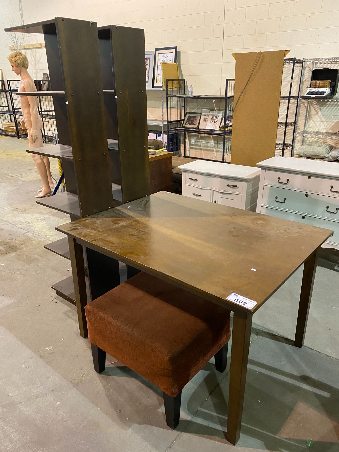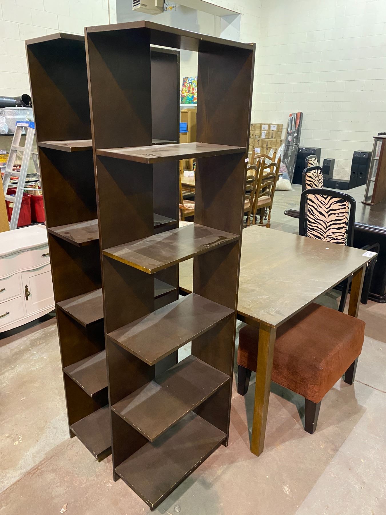TABLE 48 X 36", 2 BOOK SHELVES 71 X 20" & OTTOMAN