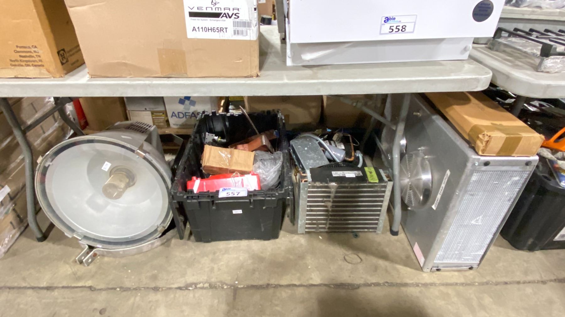 TABLE BOTTOM OF ASSORTED ELECTRICAL COMPONENTS, CONDENSER, COOLER FAN, & HEAT LAMP *BINS INCLUDED*