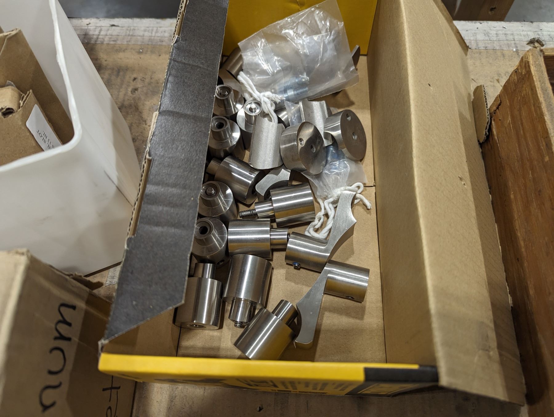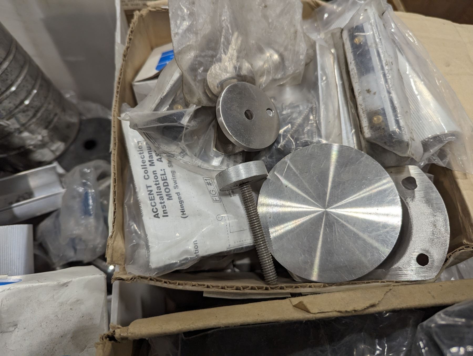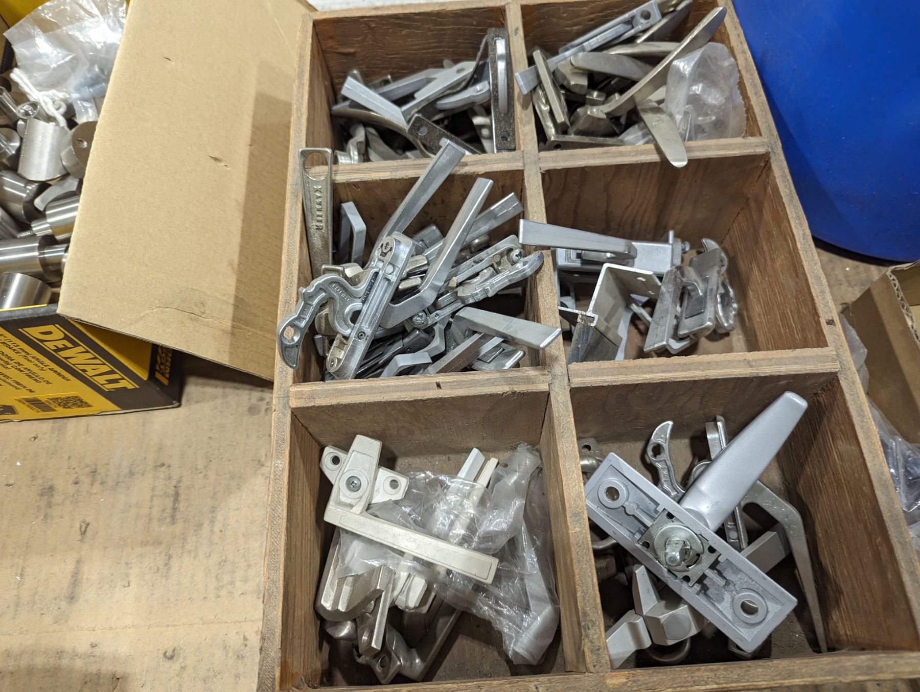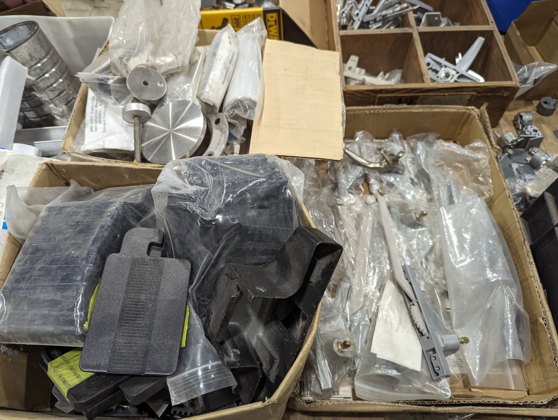 TABLE LOT OF ASST SPECIALTY DOOR HARDWARE, CRL SHOWER DOOR HARDWARE, ROTO OPERATORS, HINGES, VENT HANDLES, SS STANDOFFS, DROP PLATES, ETC