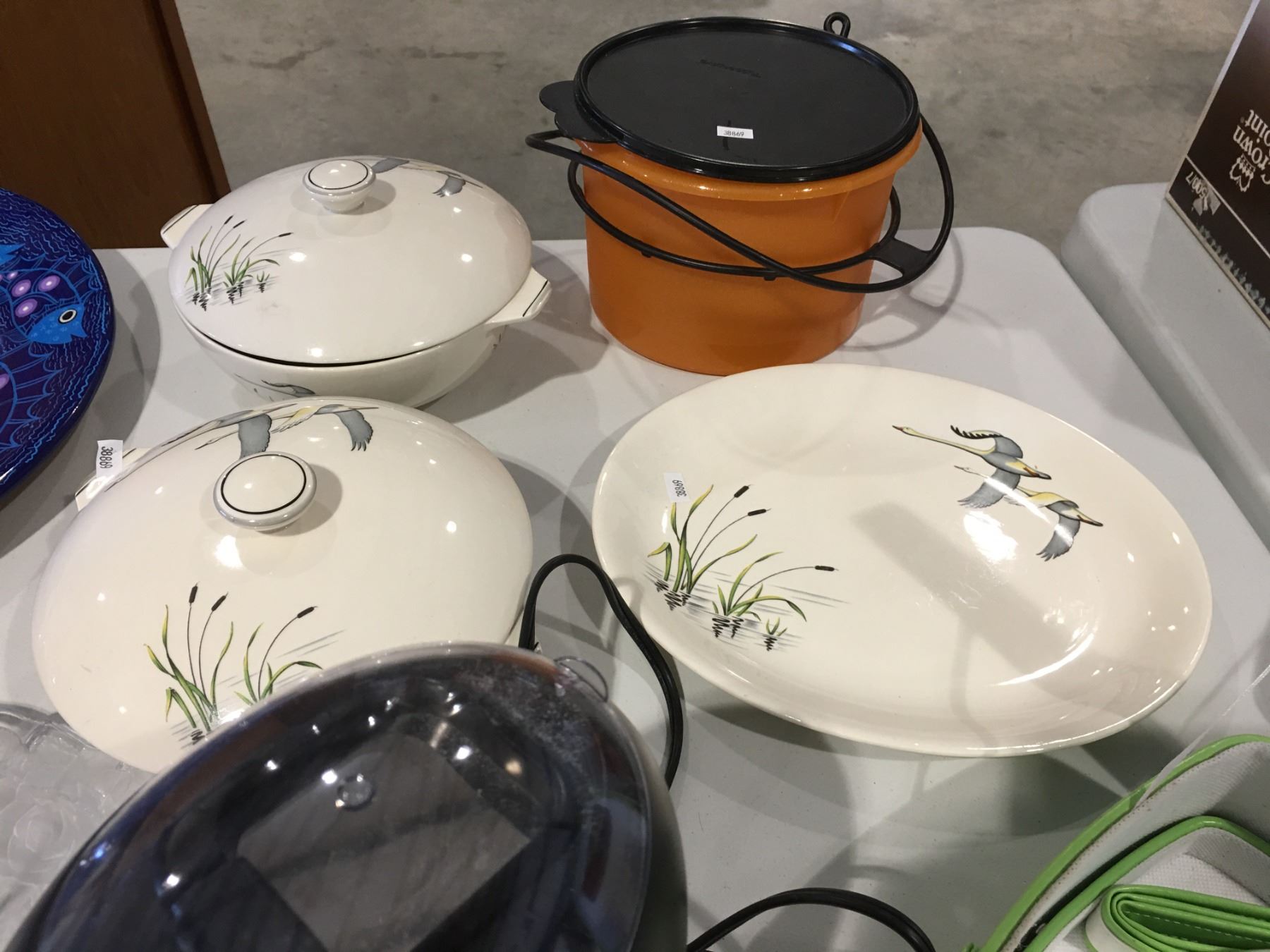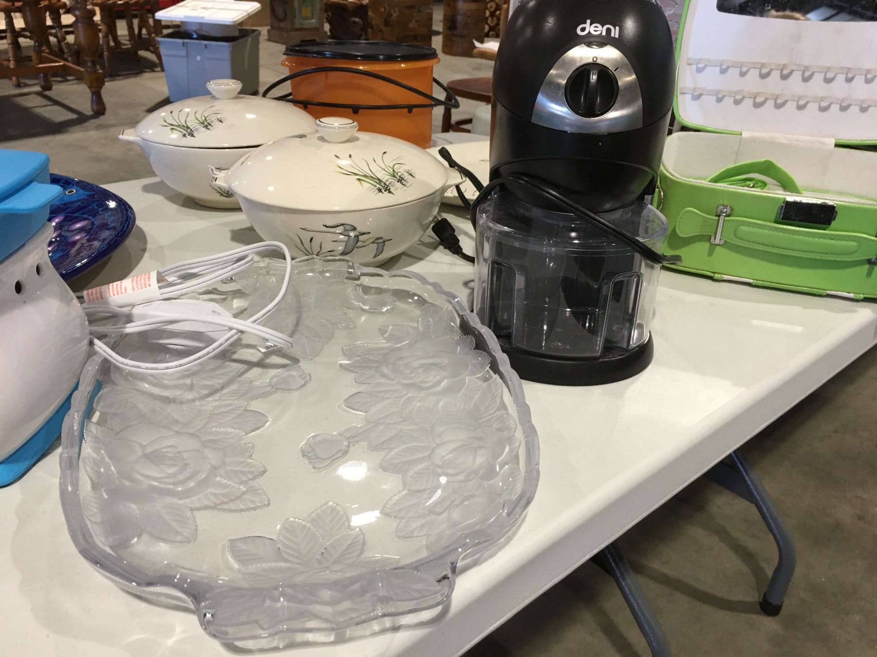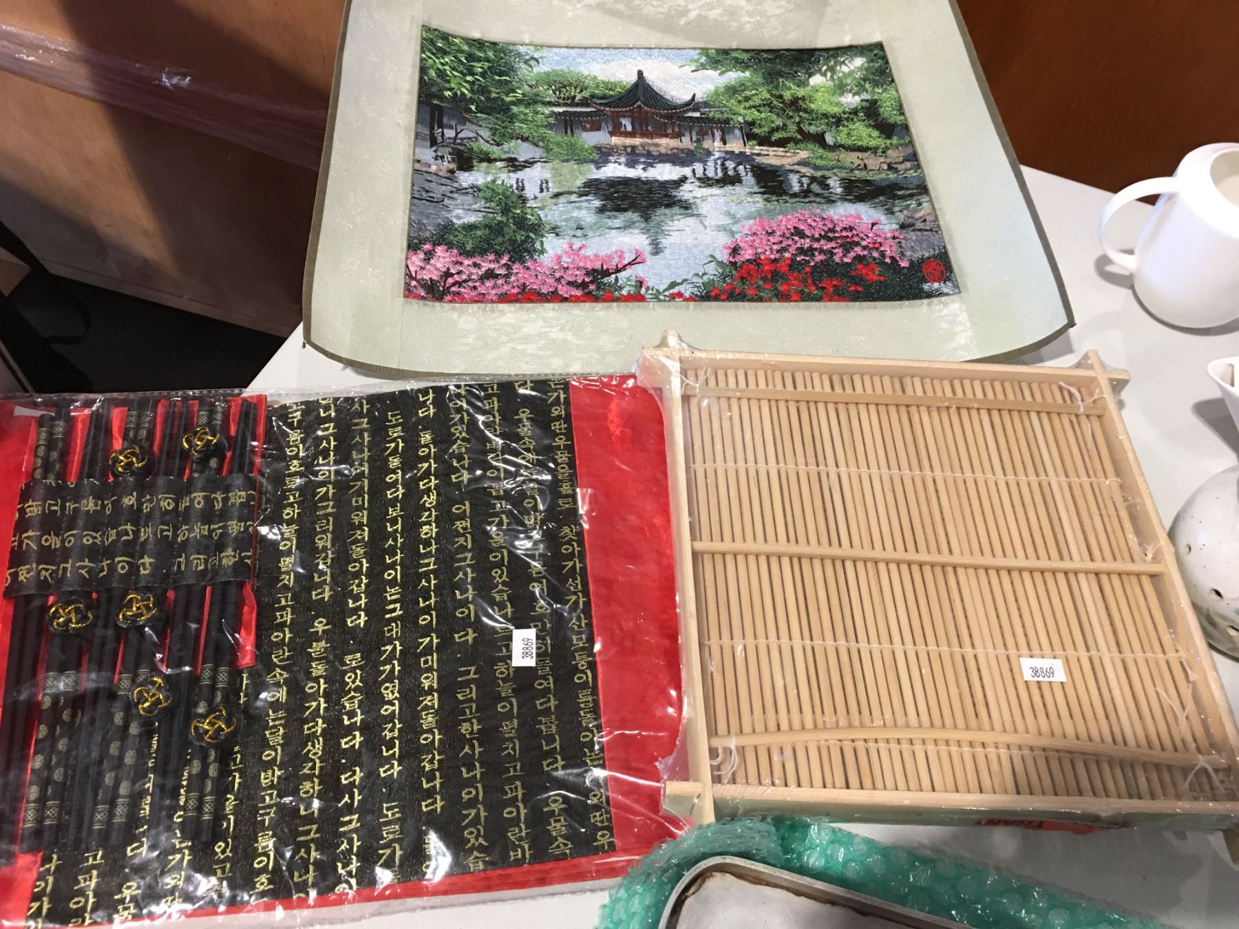 TABLE LOT OF ASSTD HOUSEHOLD ITEMS INCLUDING 2 X ALFRED MEAKIN COVERED BOWLS & PLATTER/MEXICAN WALL & BOWL/ VELATA ELECTRIC CHEESE FONDUE/STOR-DRY AIR CIRCULATOR/DENI COFFEE GRINDER/ MAXWELL & WILLIAMS FINE BONE CHINA ORIENTAL TEAPOT WITH MATCHING CREAM & SUGAR/SET OF 3 BAMBOO TRAYS/NEW 6PCS CHOPSTICK & MATCHING PLACEMATS SET/ORIENTAL NEEDLE POINT PICTURE/MAT/ETCHED GLASS PLATTER & ROYAL WORCESTER EGG CODDLER