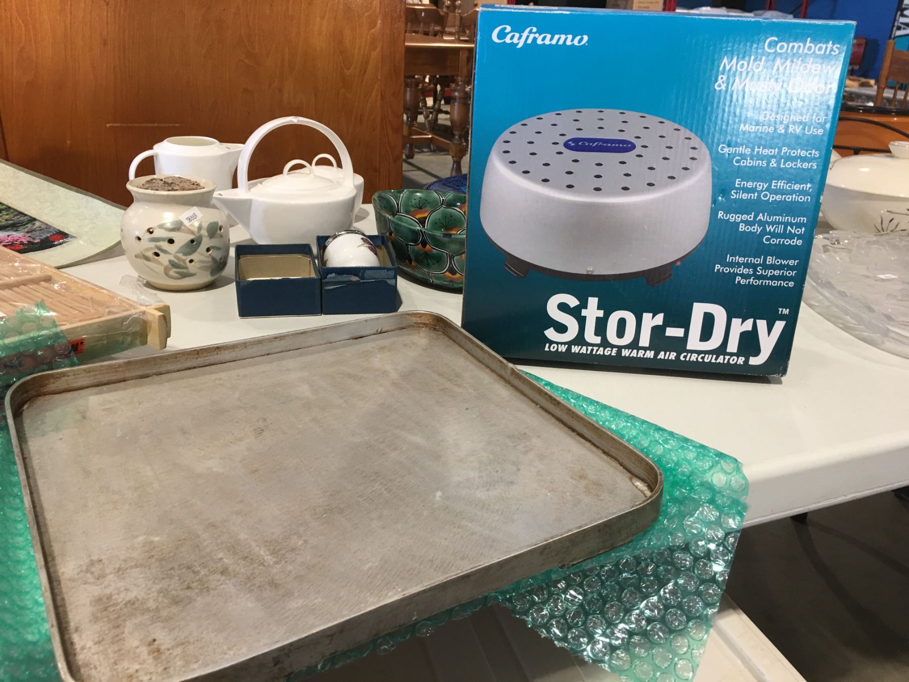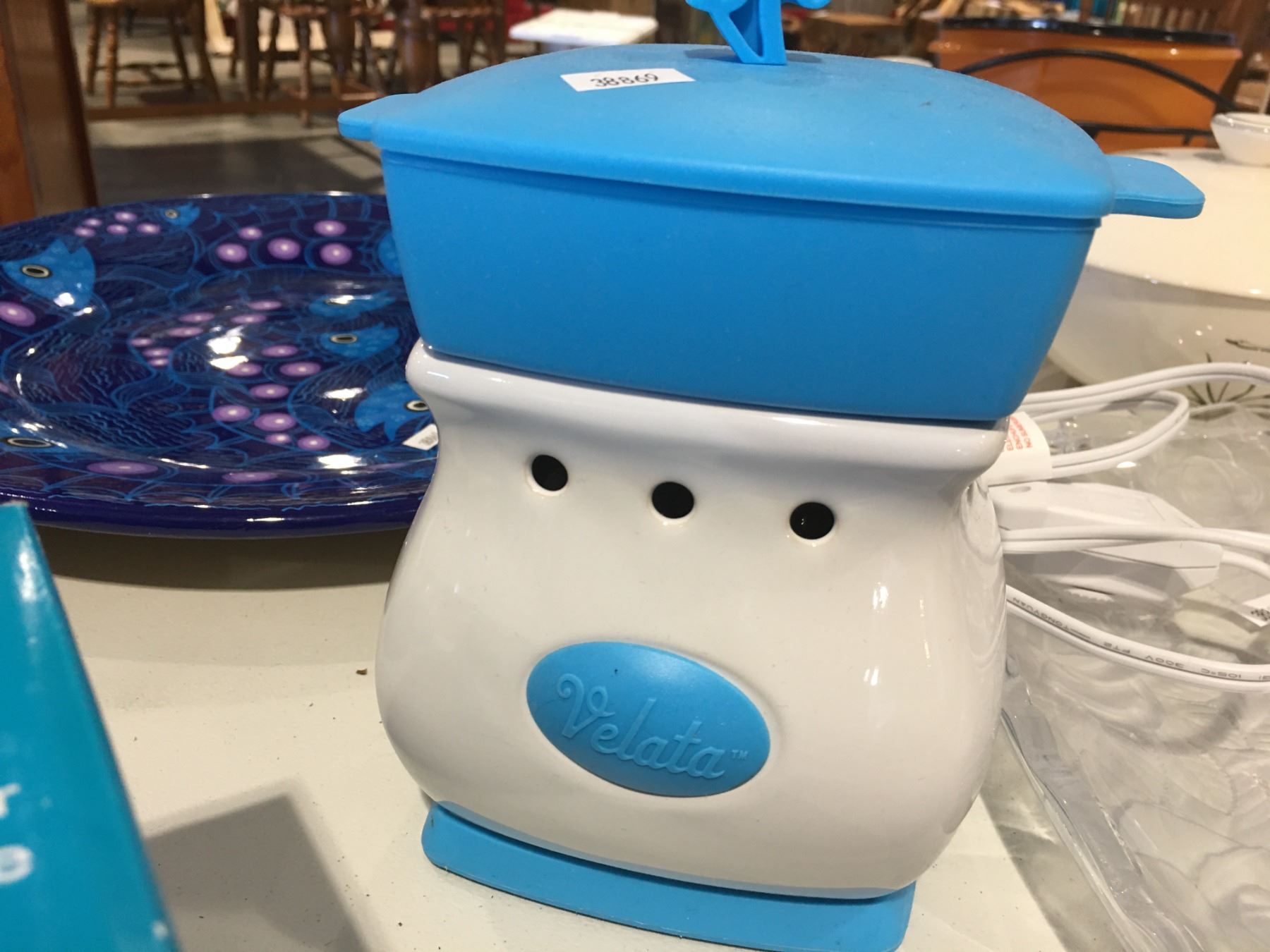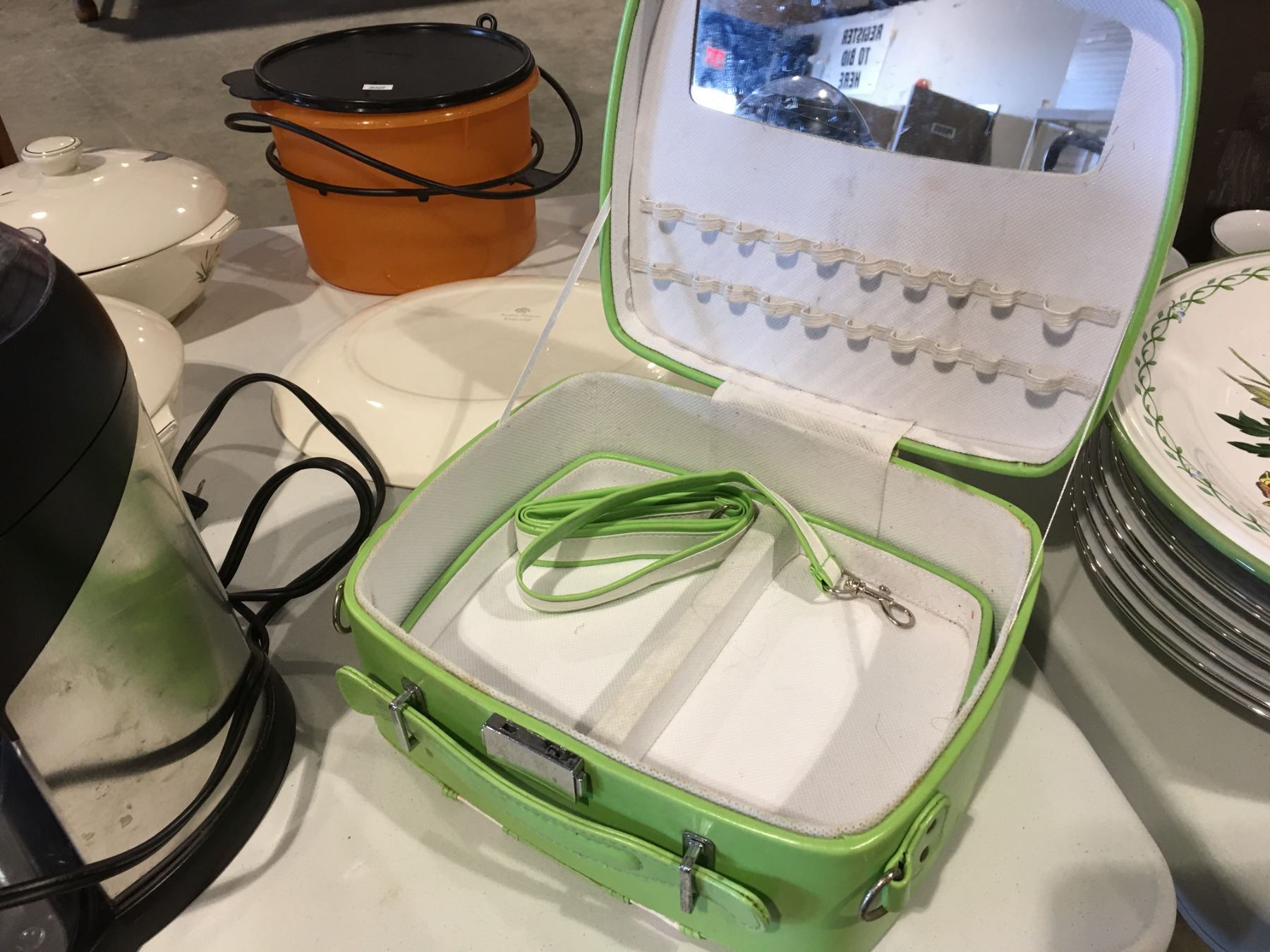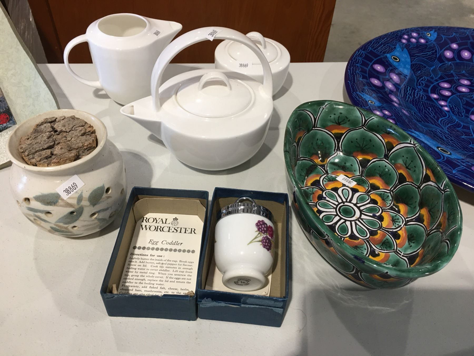TABLE LOT OF ASSTD HOUSEHOLD ITEMS INCLUDING 2 X ALFRED MEAKIN COVERED BOWLS & PLATTER/MEXICAN WALL & BOWL/ VELATA ELECTRIC CHEESE FONDUE/STOR-DRY AIR CIRCULATOR/DENI COFFEE GRINDER/ MAXWELL & WILLIAMS FINE BONE CHINA ORIENTAL TEAPOT WITH MATCHING CREAM & SUGAR/SET OF 3 BAMBOO TRAYS/NEW 6PCS CHOPSTICK & MATCHING PLACEMATS SET/ORIENTAL NEEDLE POINT PICTURE/MAT/ETCHED GLASS PLATTER & ROYAL WORCESTER EGG CODDLER