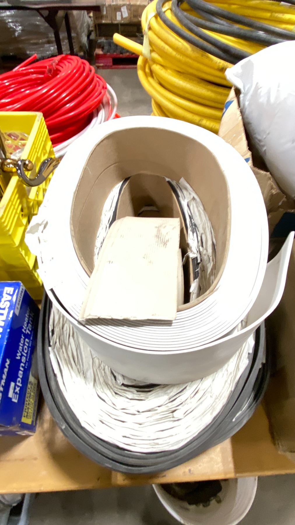 TABLE TOP OF ASSORTED CRATES OF PLUMBING, COMMERCIAL RUBBER BASEBOARD, EASTMAN EXPANSION TANK, & CABLES *BINS & CRATES INCLUDED*