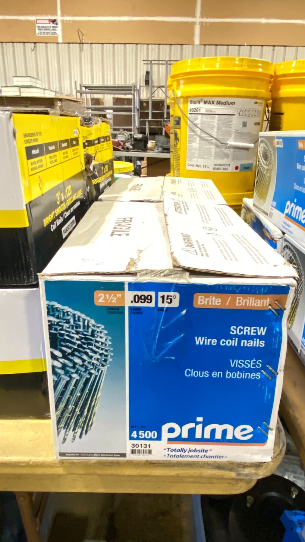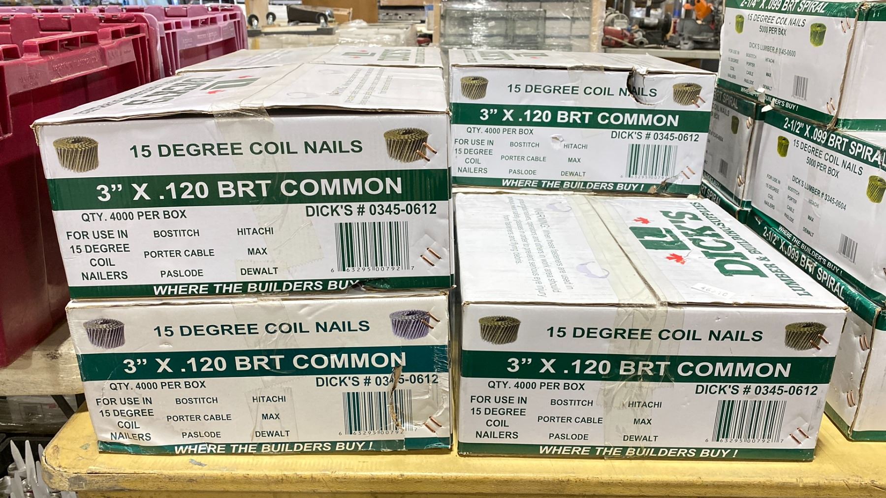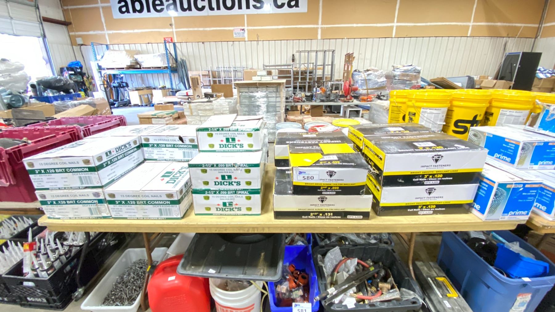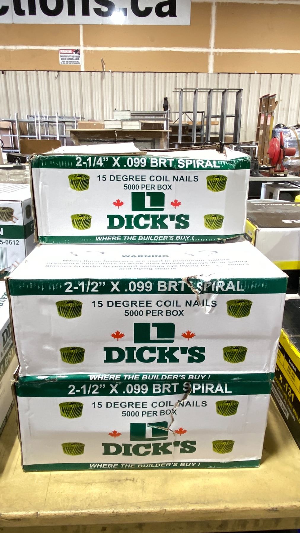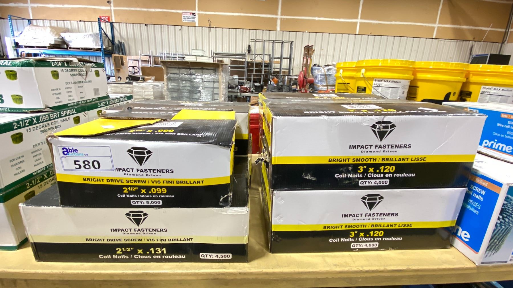 TABLE TOP OF ASSORTED IMPACT FASTENERS, PRIME, & DICK'S INDUSTRIAL COIL NAILS