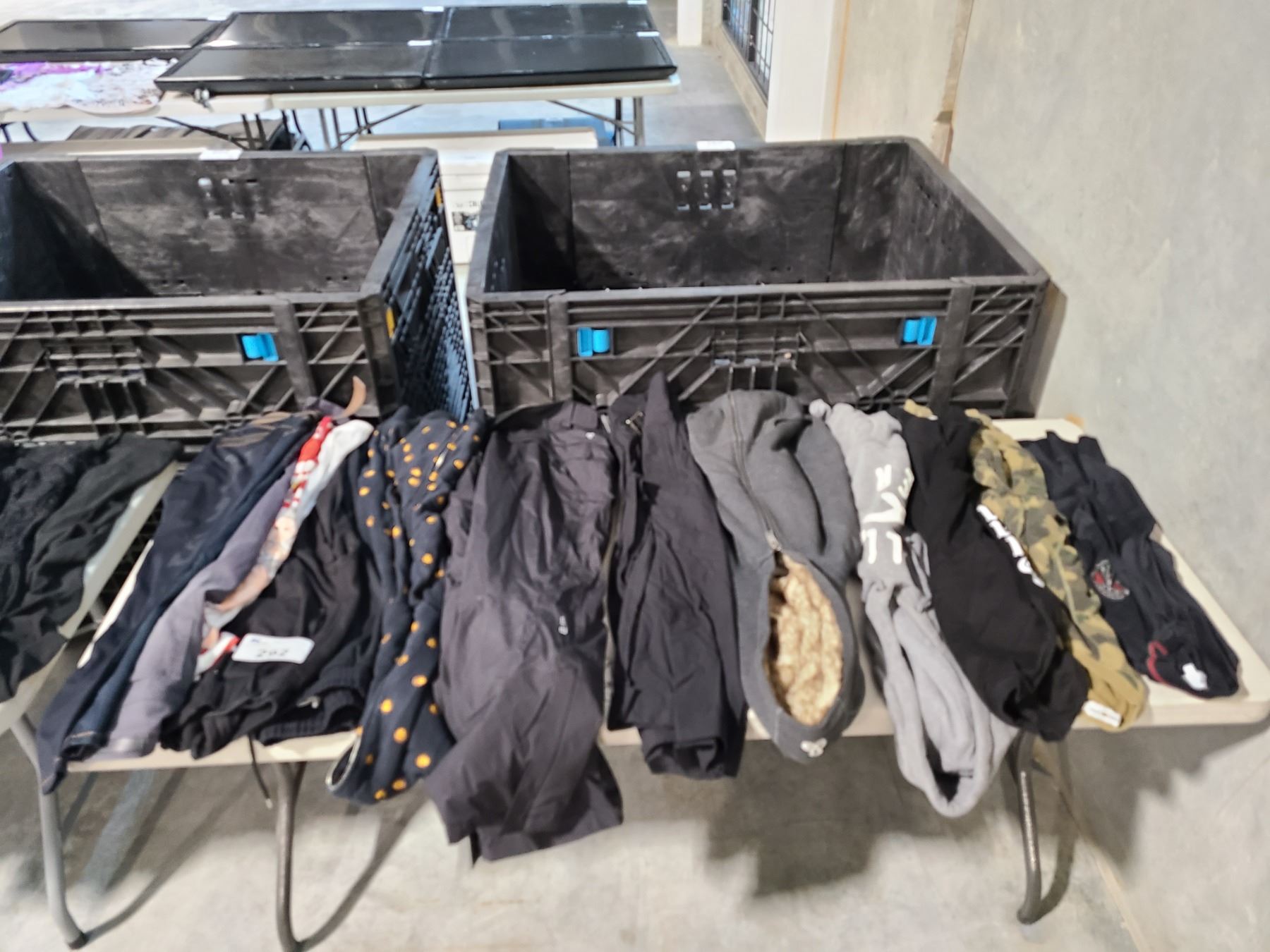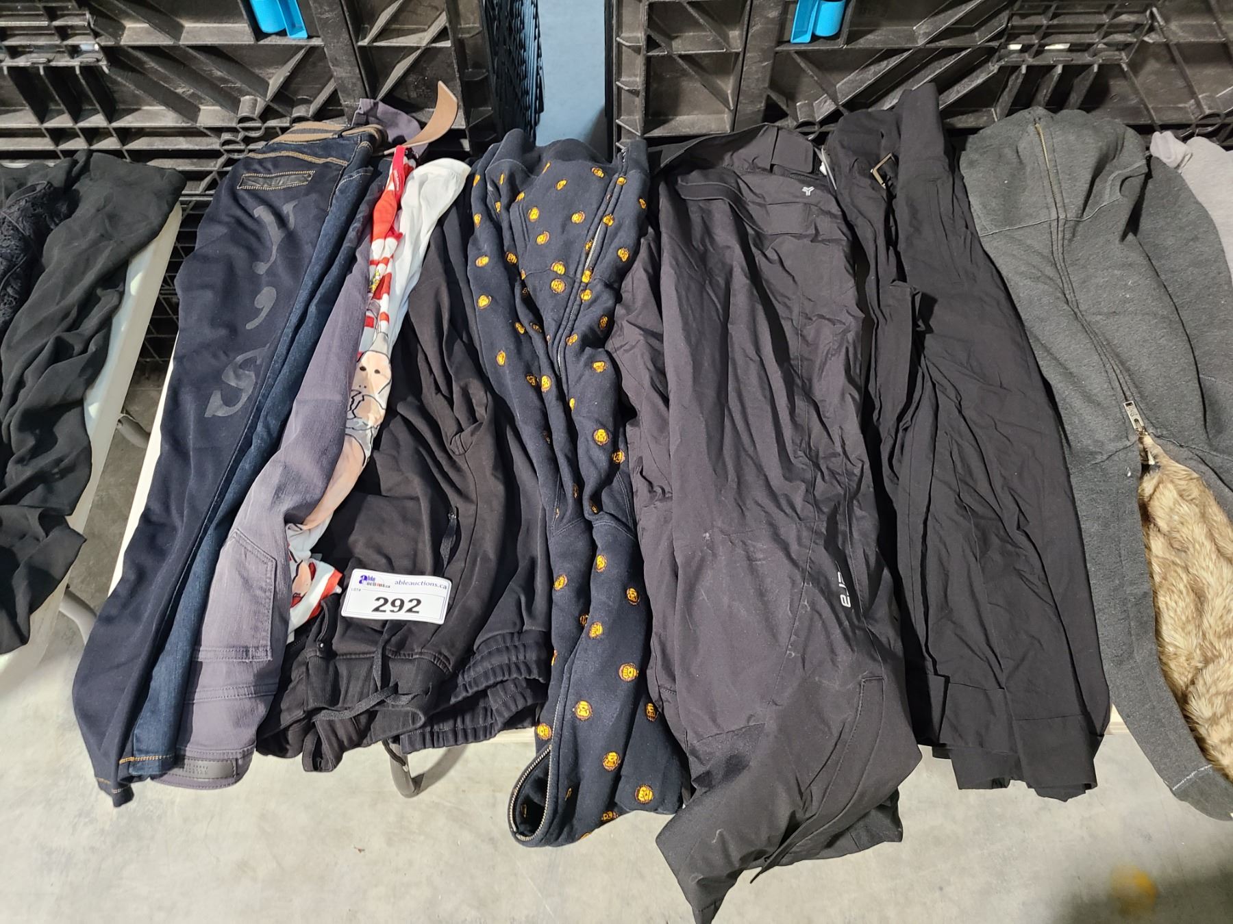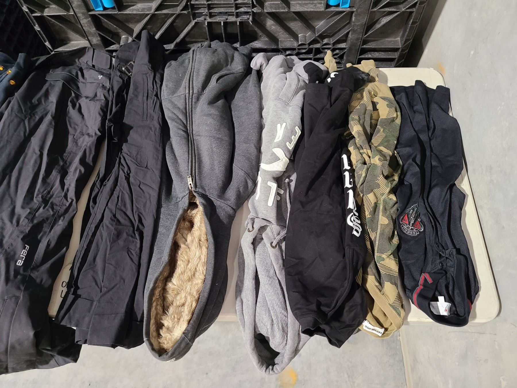 TABLE TOP OF ASSORTED NEW / USED DESIGNER JACKETS & CLOTHING