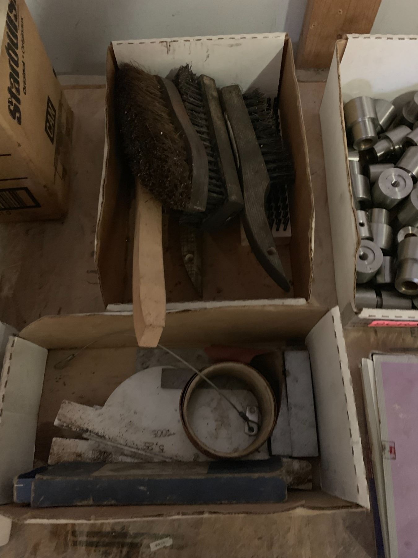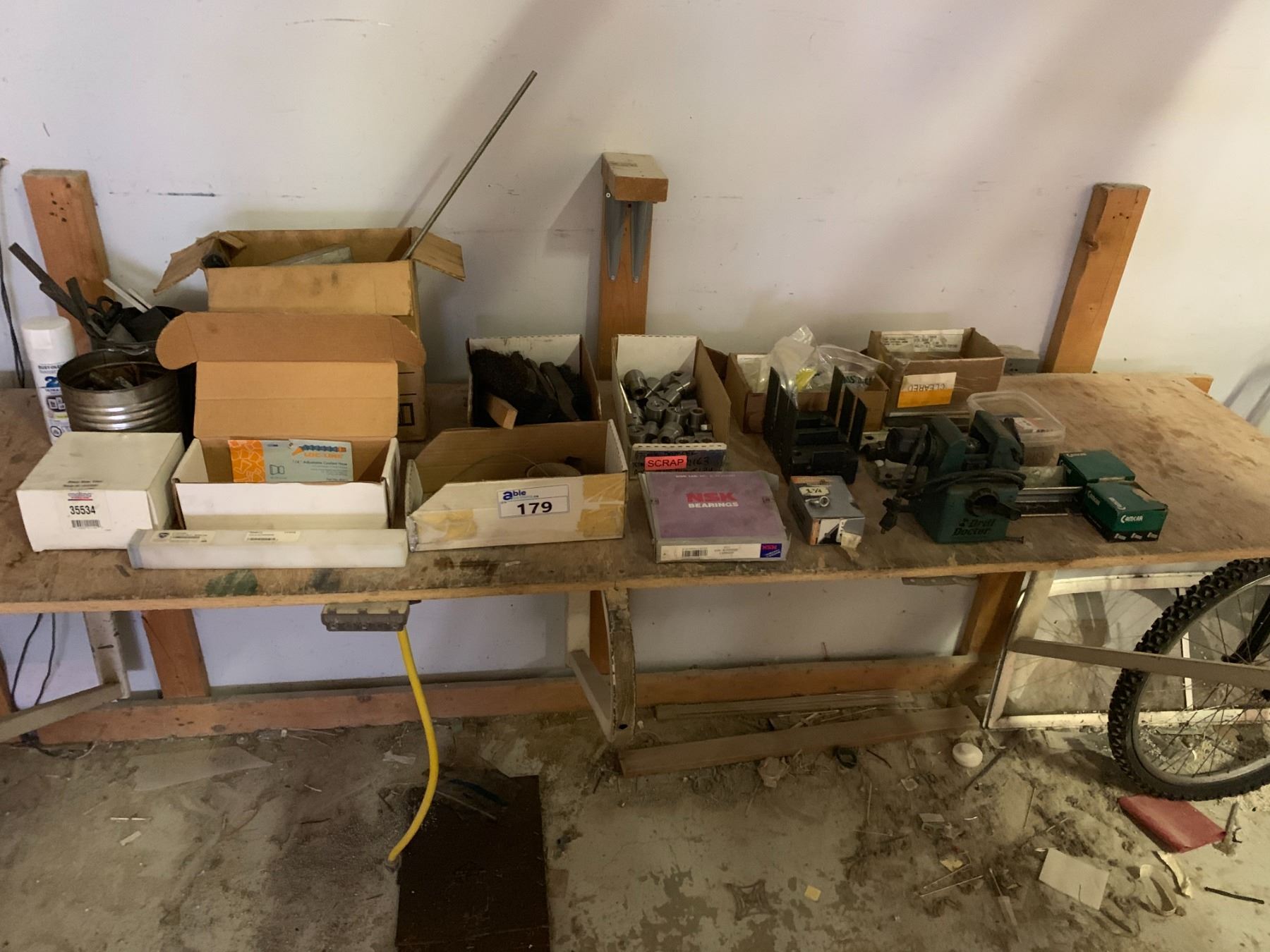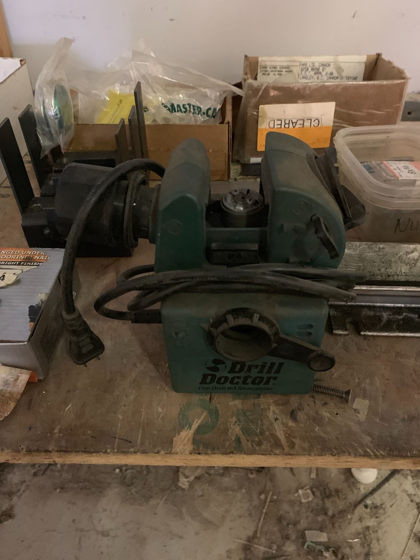 TABLE TOP OF ASSORTED SHOP TOOLS & MISCELLANEOUS- DRILL SHARPENER/BRUSHES/ETC/