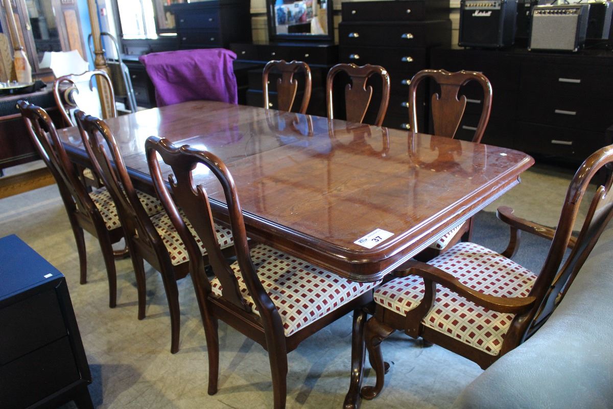 TABLE WITH 2 LEAVES AND 8 CHAIRS (SOME SCRATCHES ON TABLE)