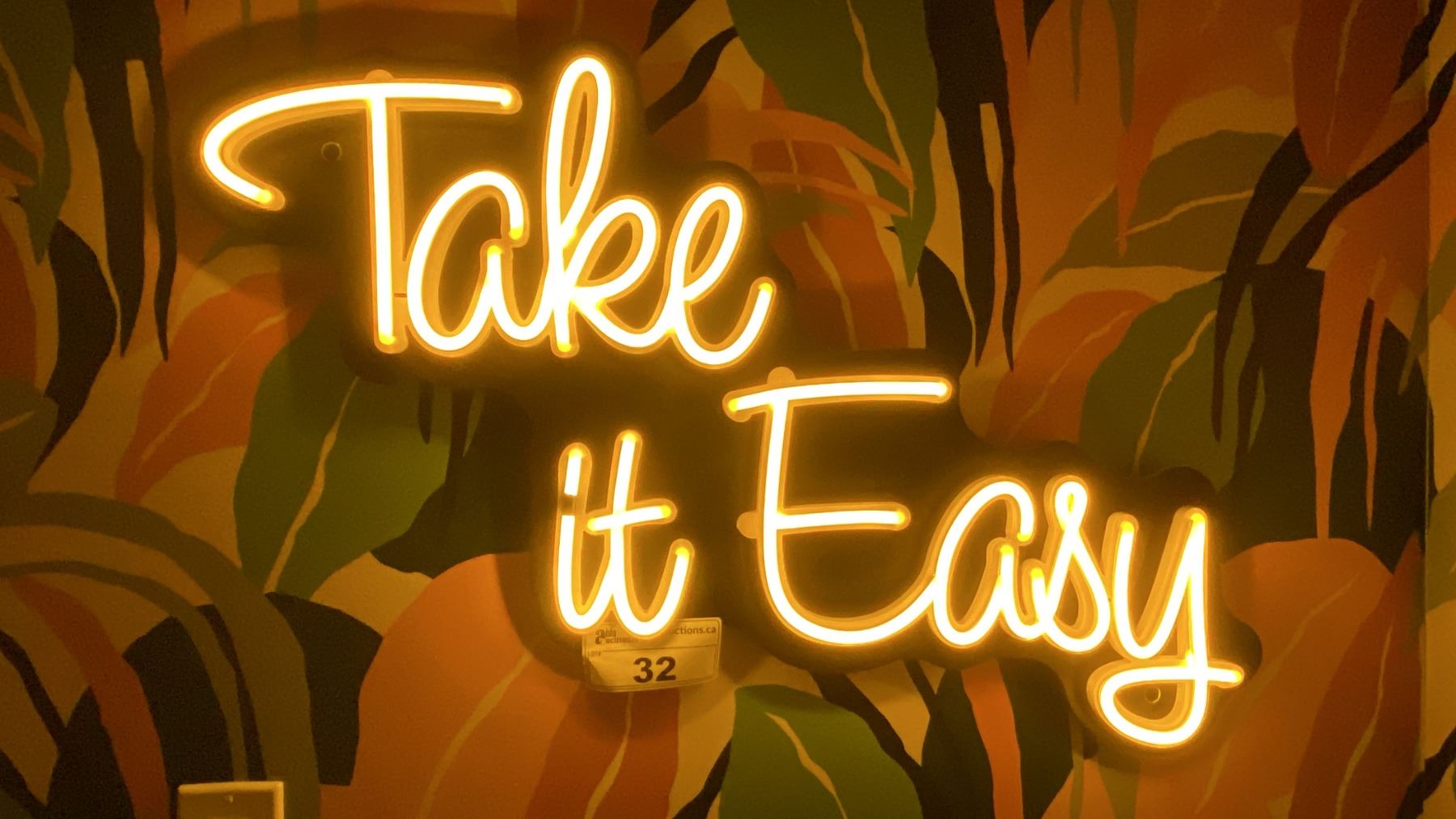 "TAKE IT EASY" LIGHTED SIGN - APPROX. 2 1/2FT ACROSS X 1 1/2FT WIDE *BUYER WILL REQUIRE TOOLS/HELP TO DISMANTLE*