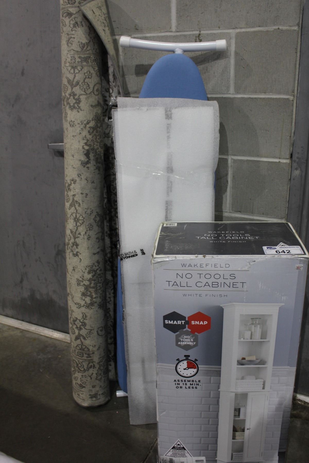 TALL CABINET, OVER THE DOOR MIRROR ORGANIZER, IRONING BOARD AND AREA RUG