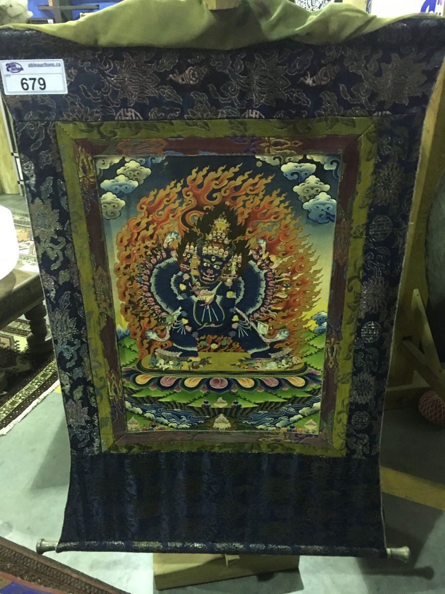 TAPESTRY SURROUND HAND PAINTED ON CANVAS EASTERN CULTURE DEITY APPROX 2FT X 4FT