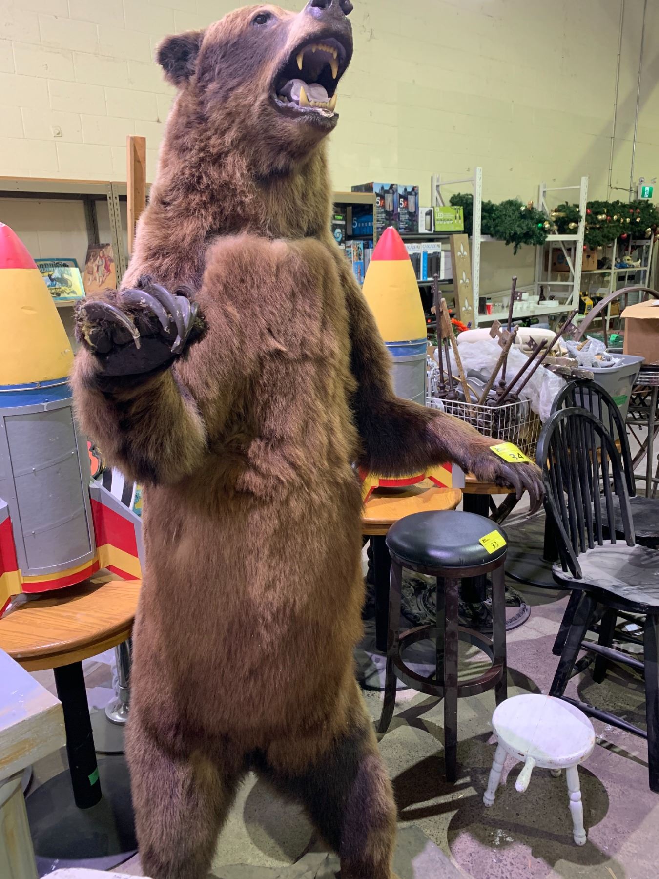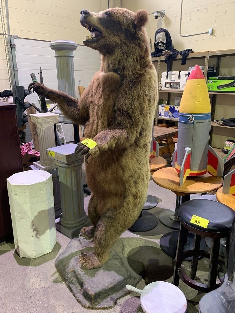 TAXIDERMY GRIZZLY BEAR ON STAND APPROX 7' TALL (SOME DAMAGE)