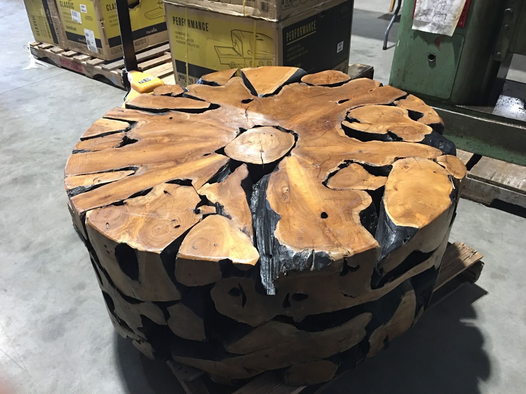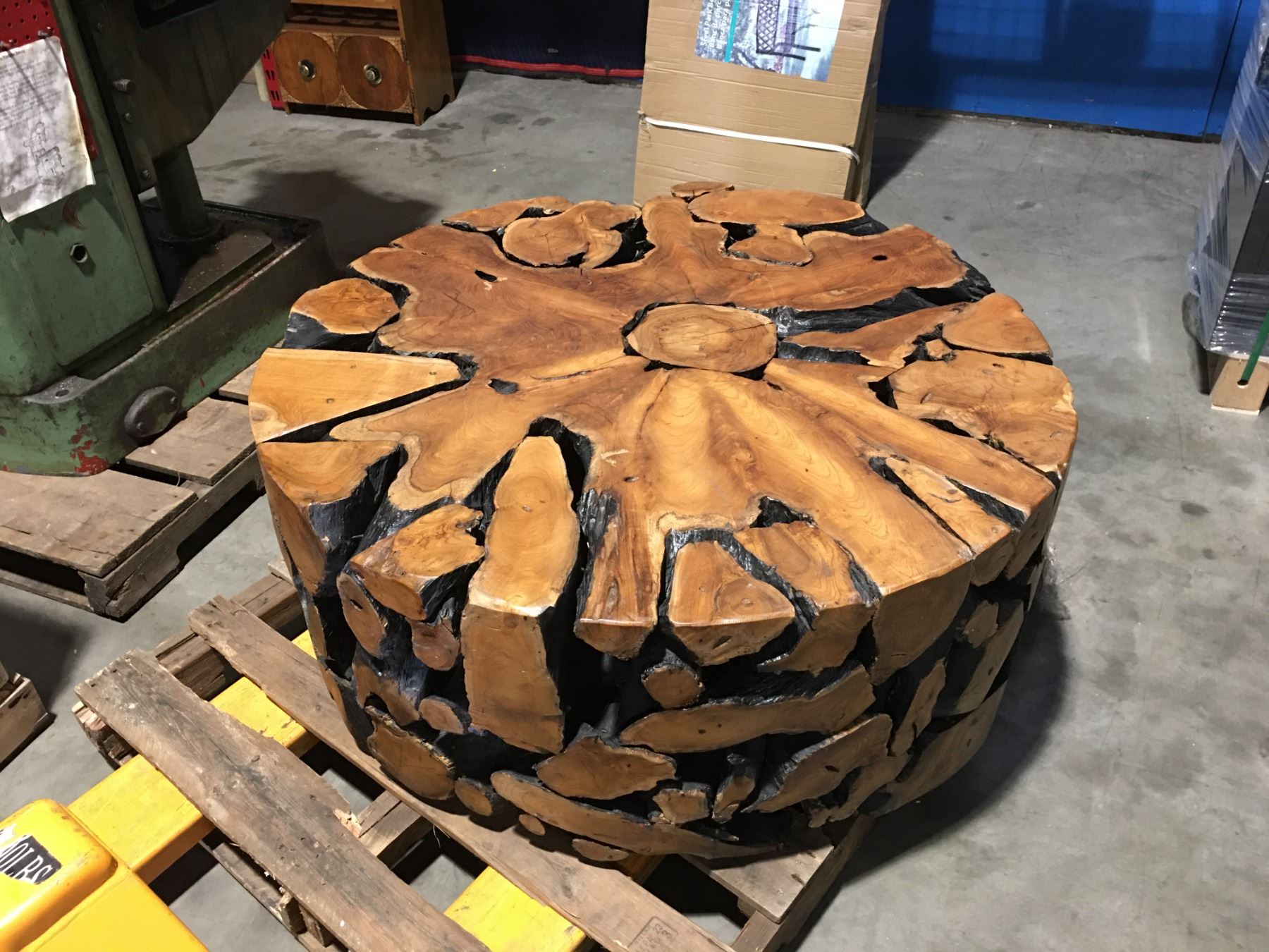 TEAK ROOT COFFEE TABLE 43" DIAMETER - MSRP $2666 (TOP HAS DAMAGE AS NOTED IN PHOTOS)
