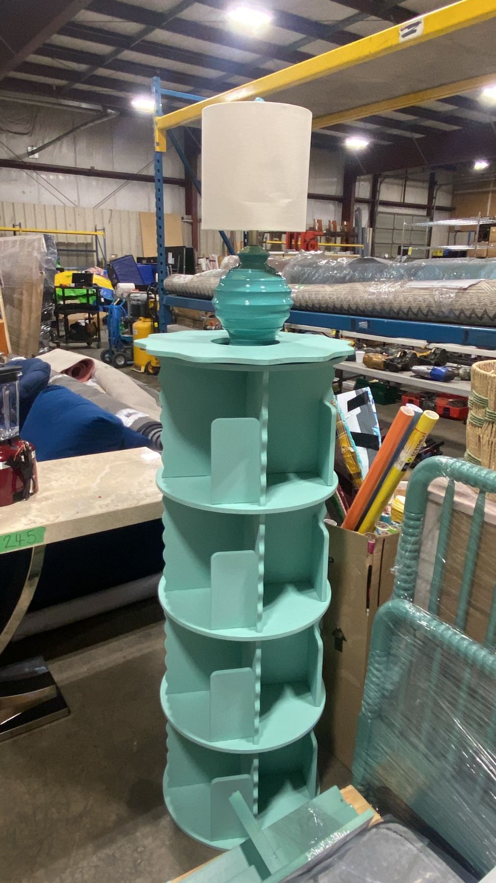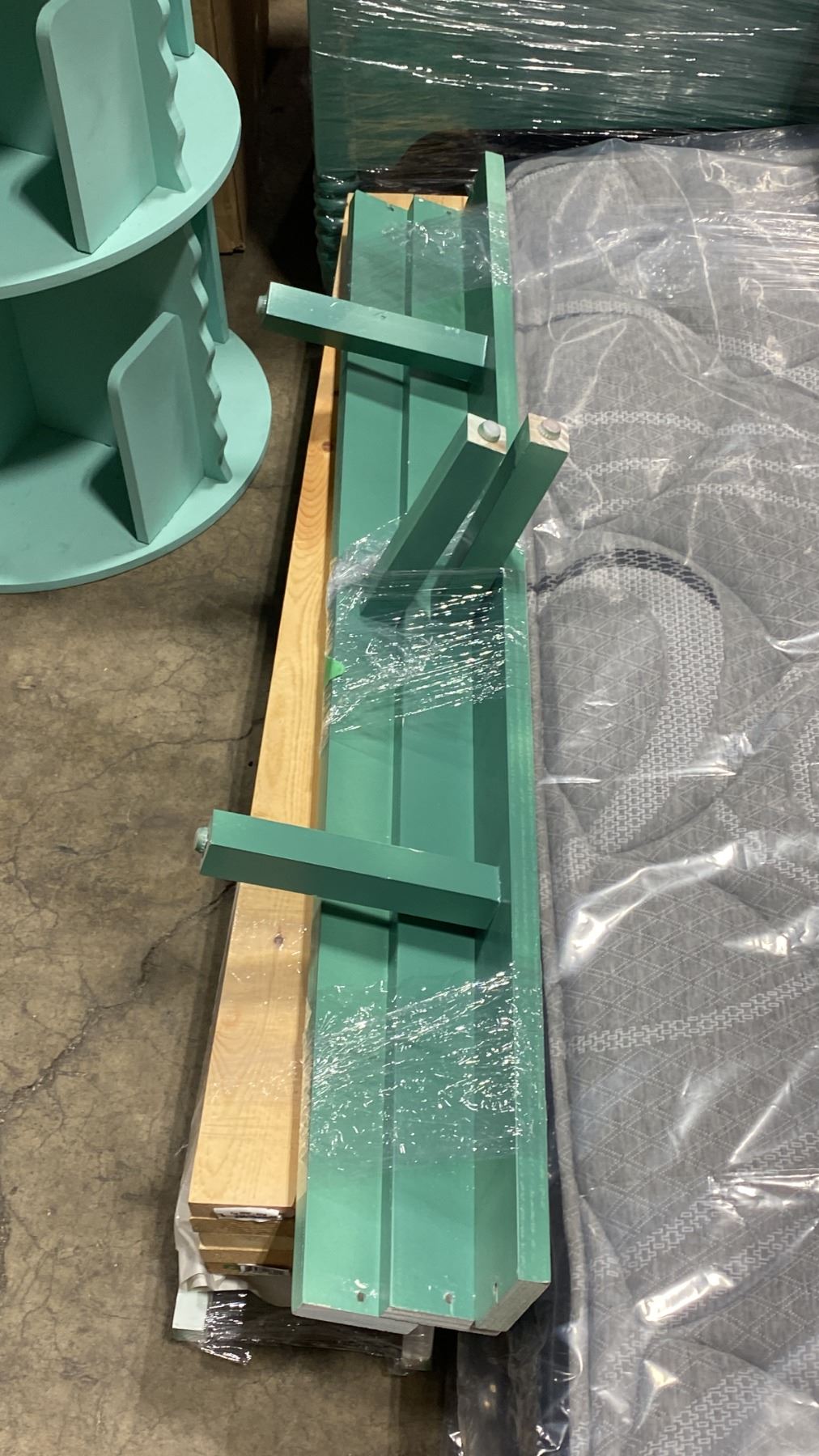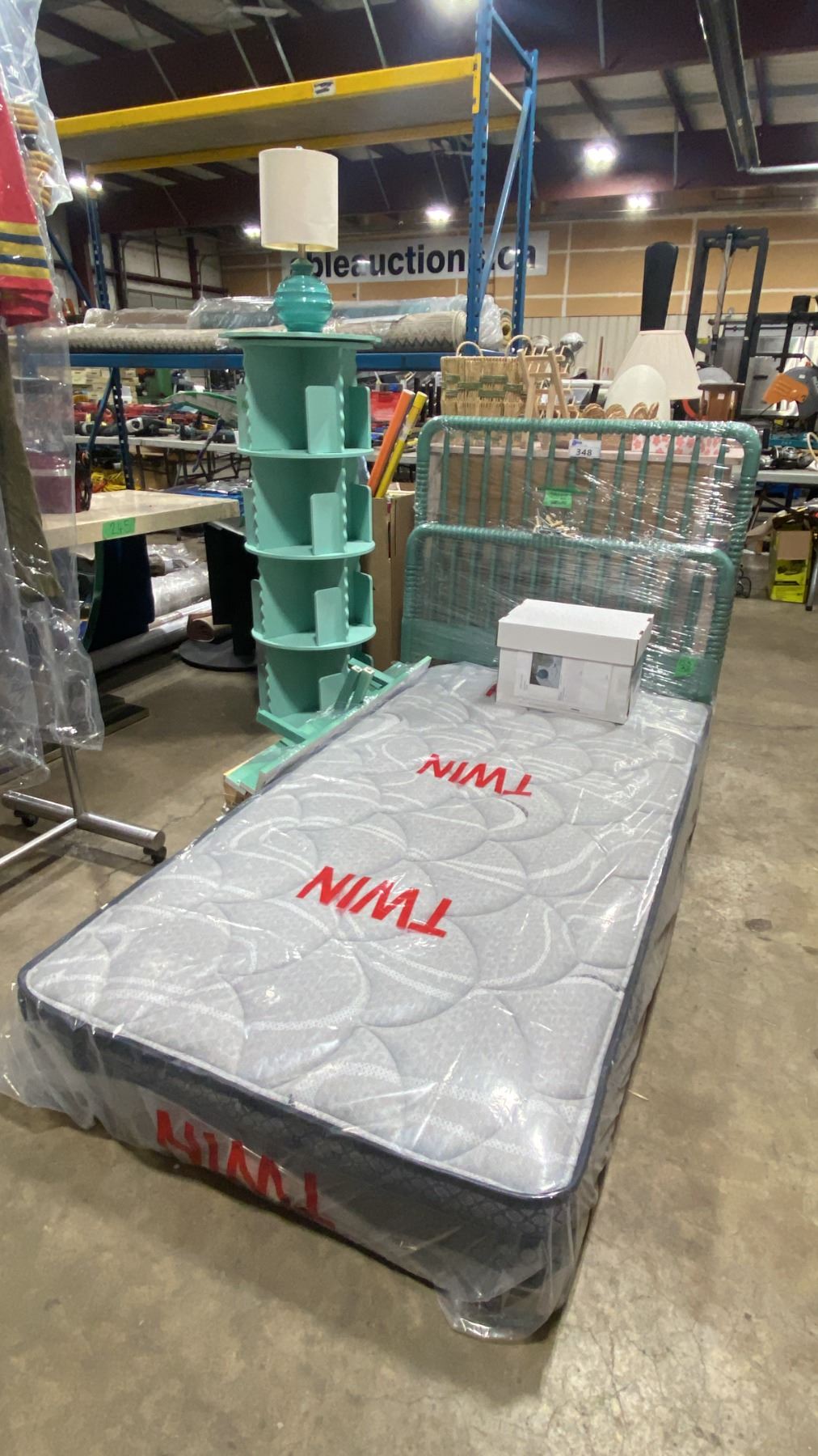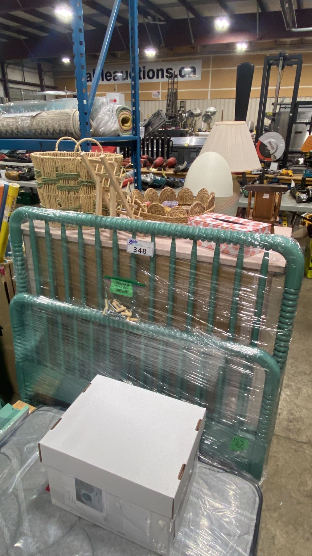 TEAL WOODEN BEDFRAME WITH MATTRESS, PAIR OF LAMPS & ROUND BOOKSHELF