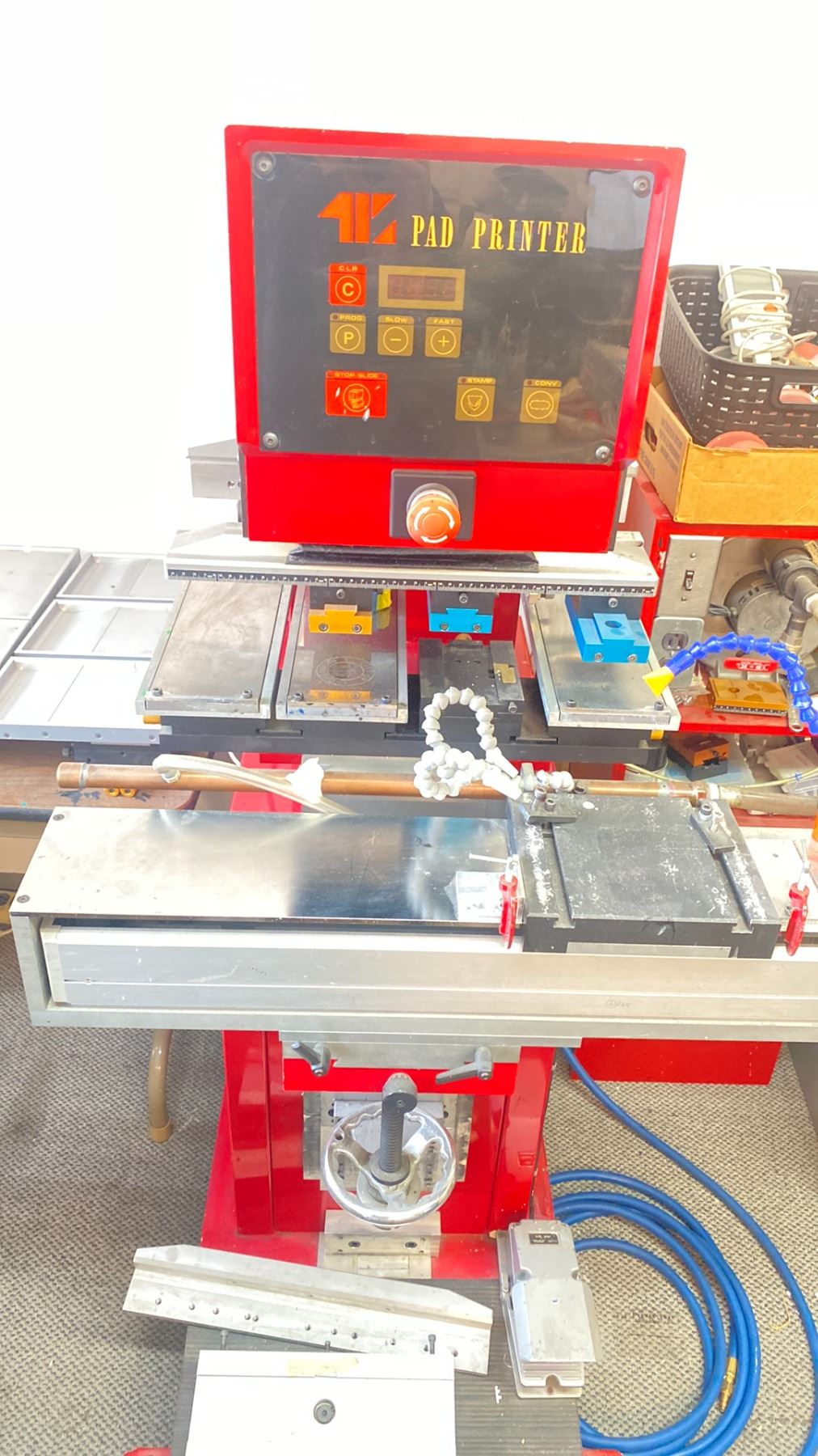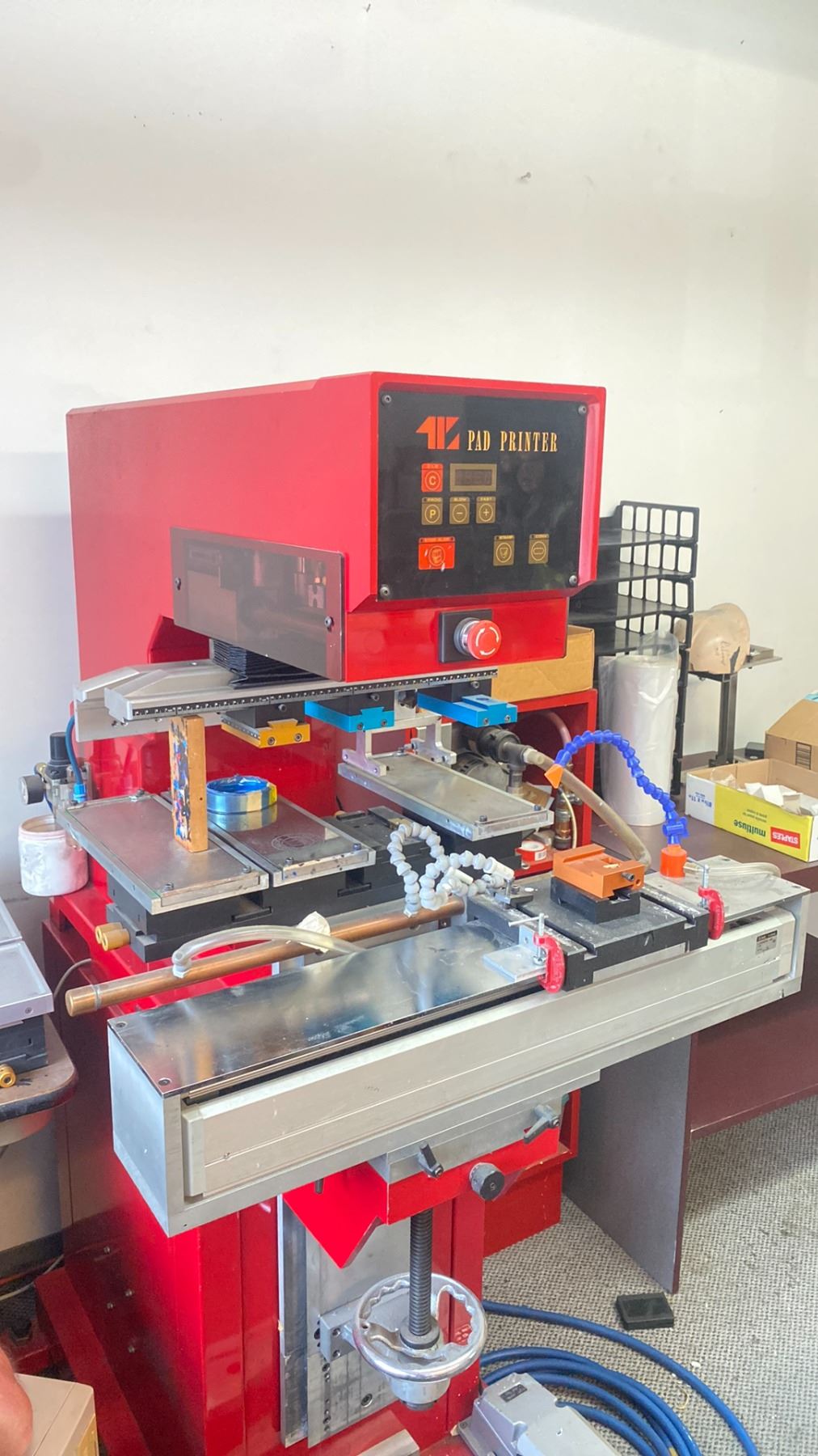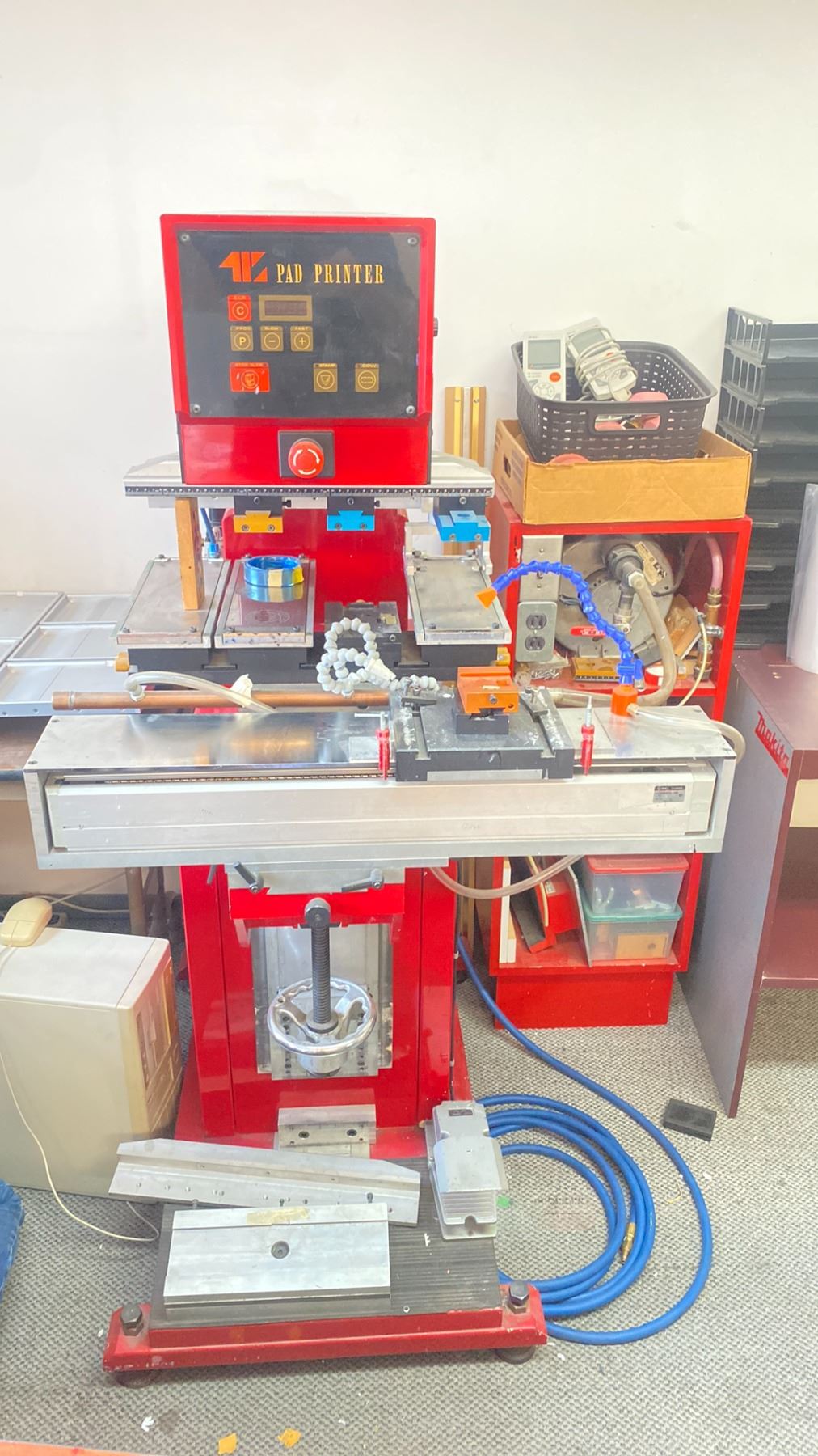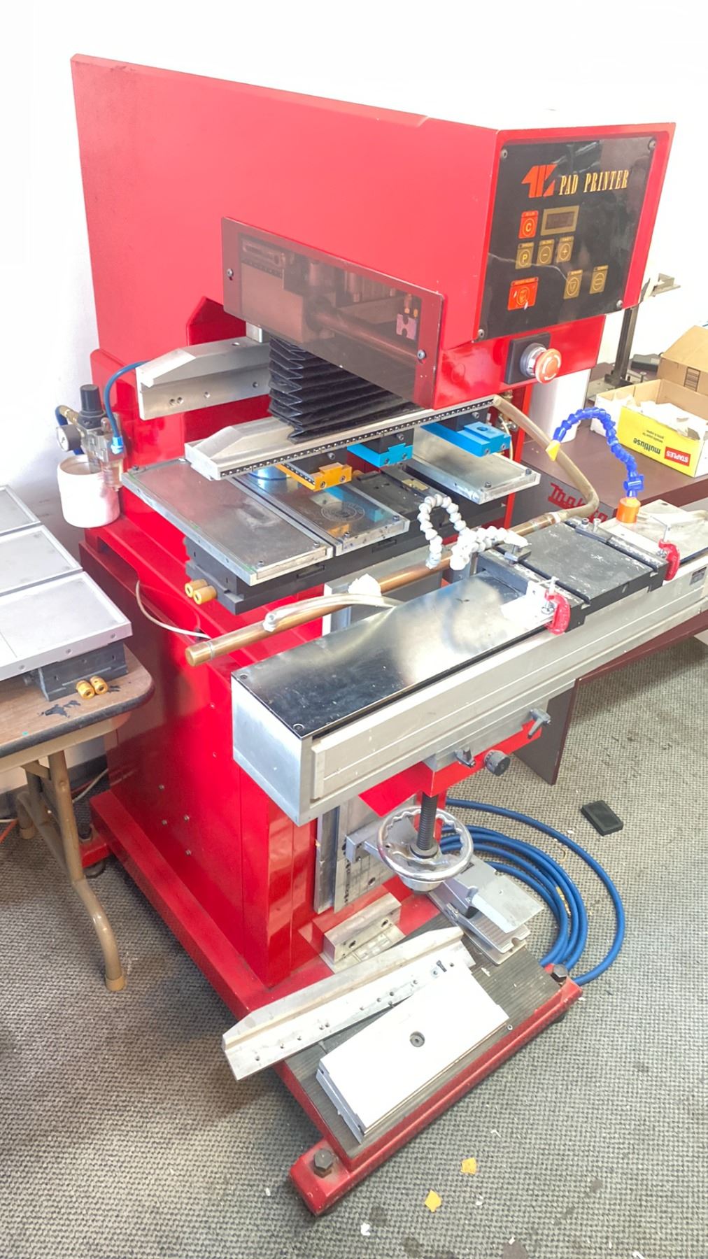 TECHNICAL INDUSTRIAL CO FOUR COLOR PAD PRINTER ( TIC - 301SC ) WITH A RED WOODEN SHELF OF ACCESSORIES/PARTS INCLUDING 90MM X 90MM INK CUPS ** LC1 DRIVING MODULE NEEDS REPAIR/ AVAILABLE LOCALLY **