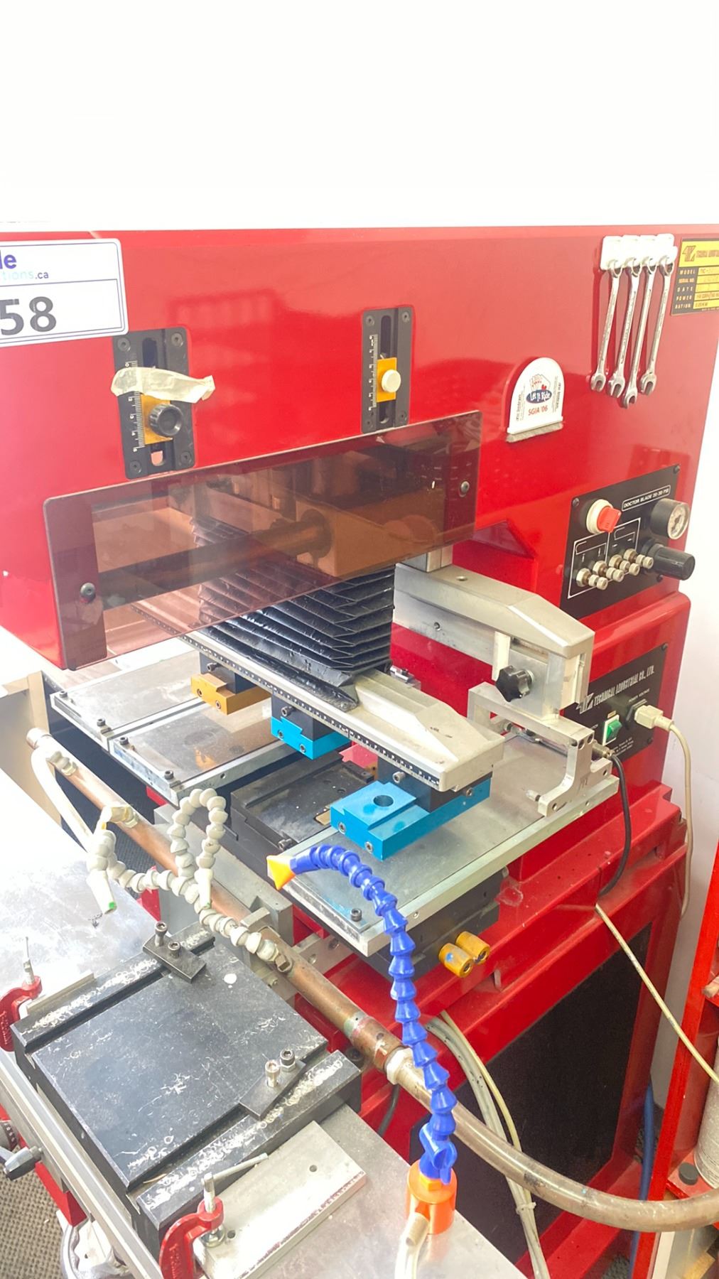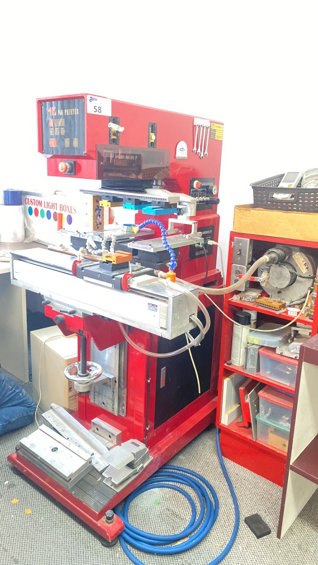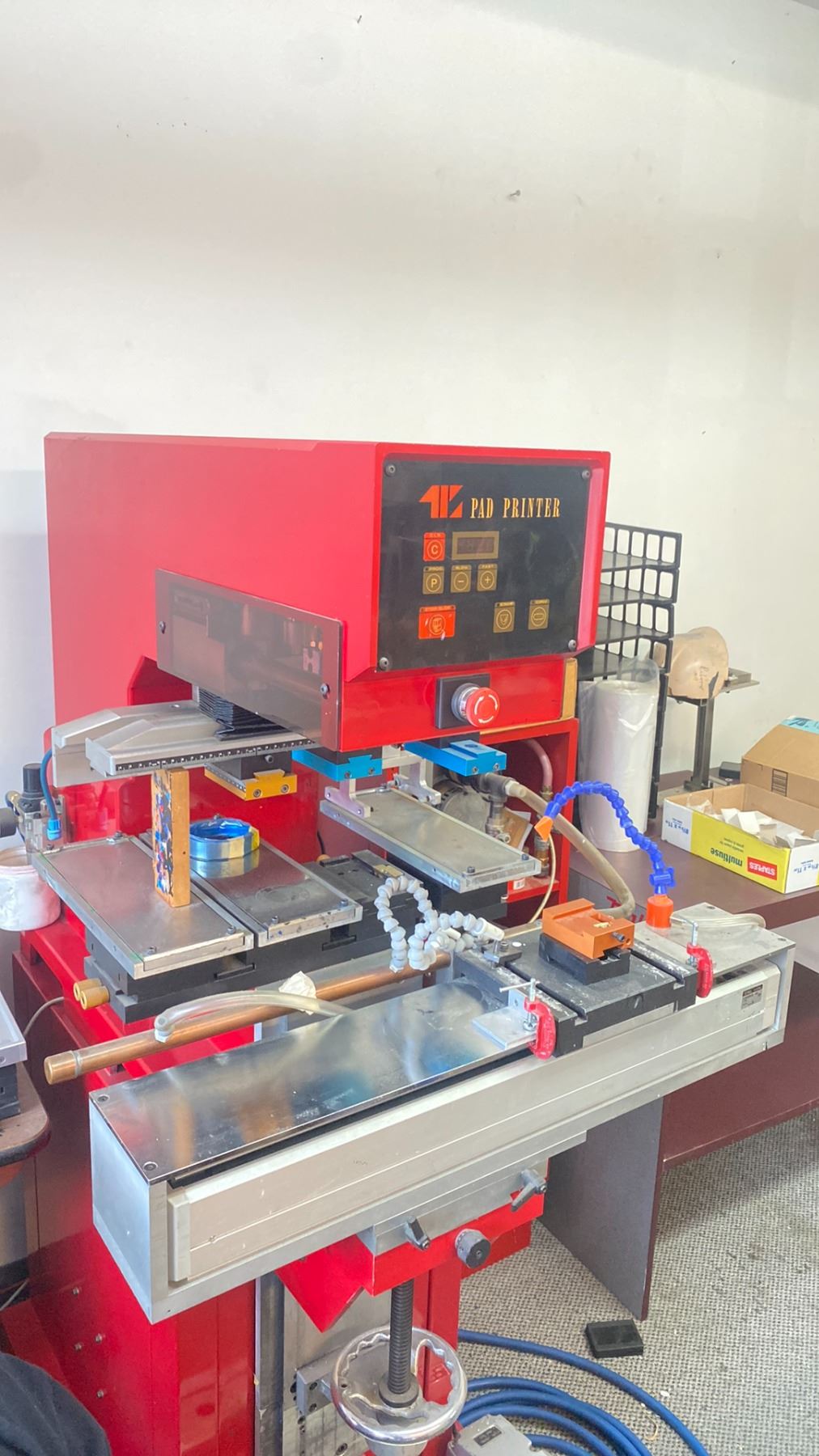 TECHNICAL INDUSTRIAL CO FOUR COLOR PAD PRINTER ( TIC - 301SC ) WITH A RED WOODEN SHELF OF ACCESSORIES/PARTS INCLUDING 90MM X 90MM INK CUPS ** LC1 DRIVING MODULE NEEDS REPAIR/ AVAILABLE LOCALLY **