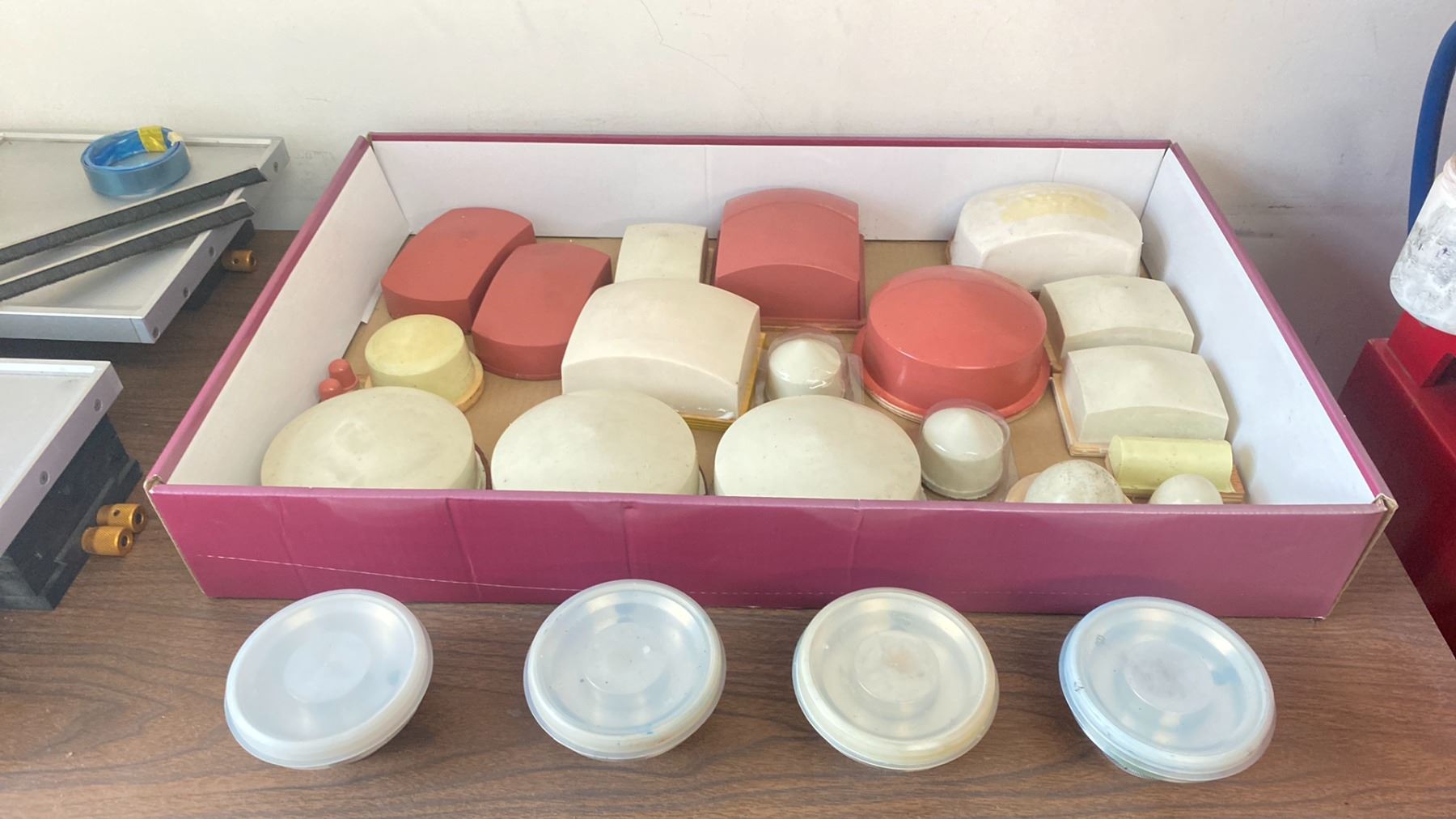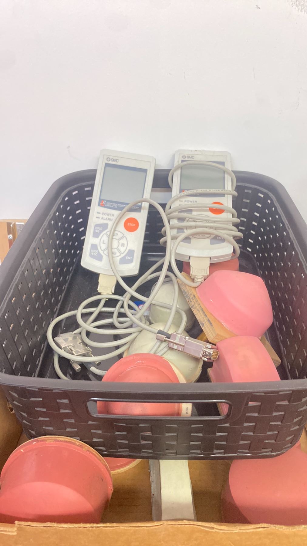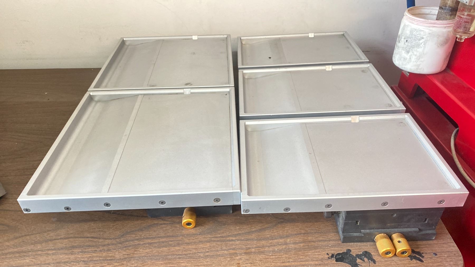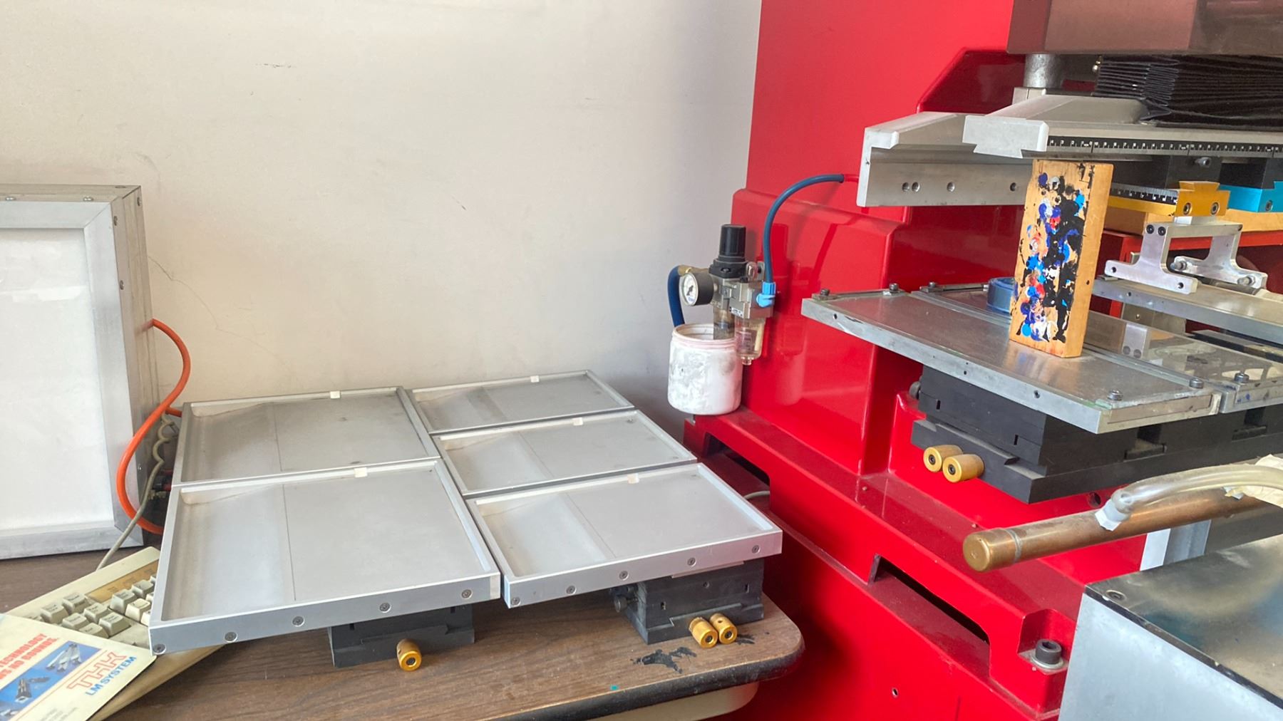 TECHNICAL INDUSTRIAL CO FOUR COLOR PAD PRINTER ( TIC - 301SC ) WITH A RED WOODEN SHELF OF ACCESSORIES/PARTS INCLUDING 90MM X 90MM INK CUPS ** LC1 DRIVING MODULE NEEDS REPAIR/ AVAILABLE LOCALLY **