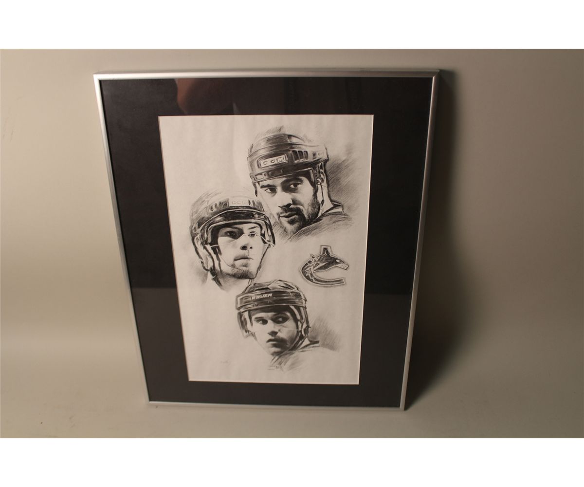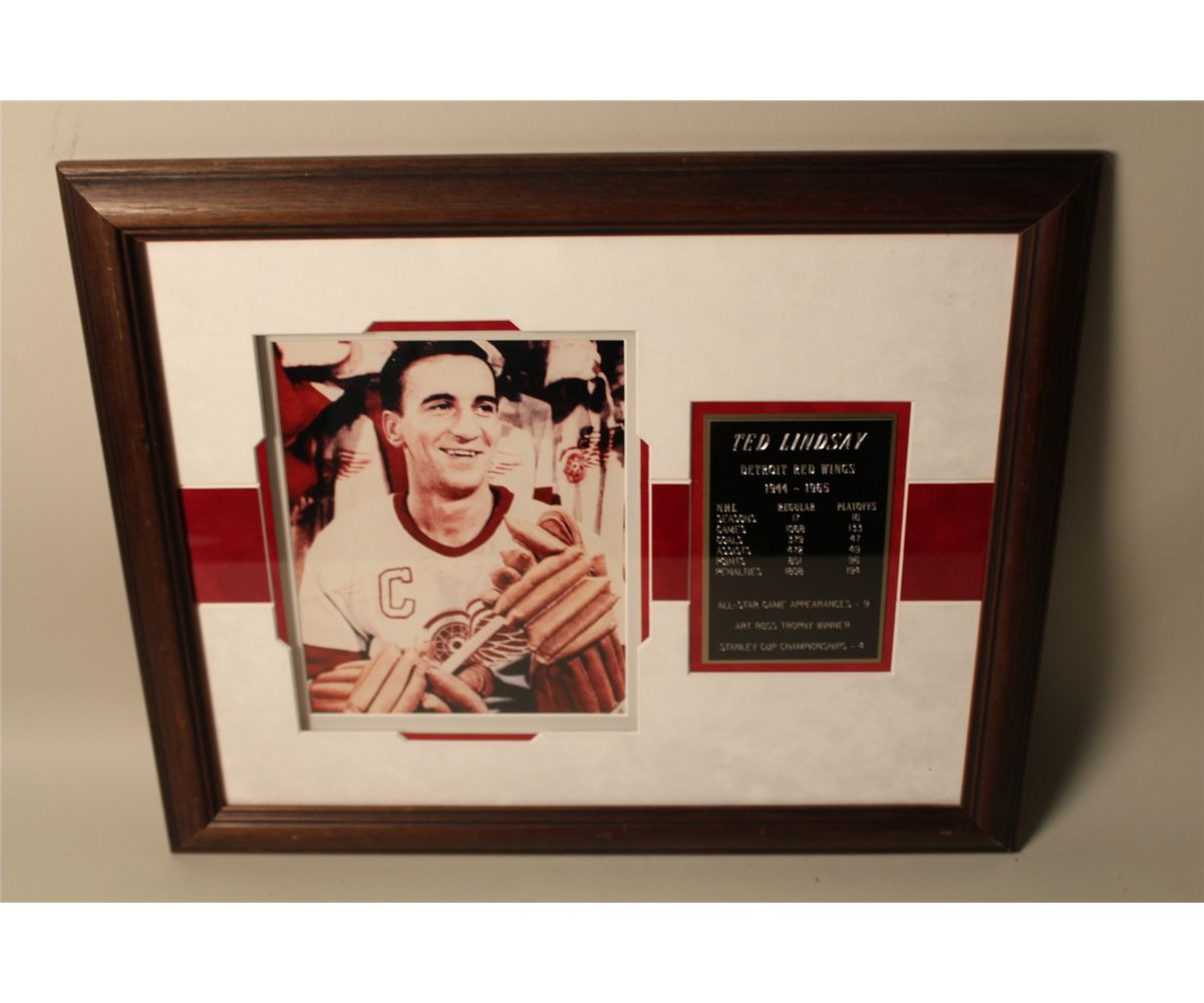 TED LINDSAY, SIGNED, FRAMED PHOTO AND FRAMED CANUCKS DRAWING