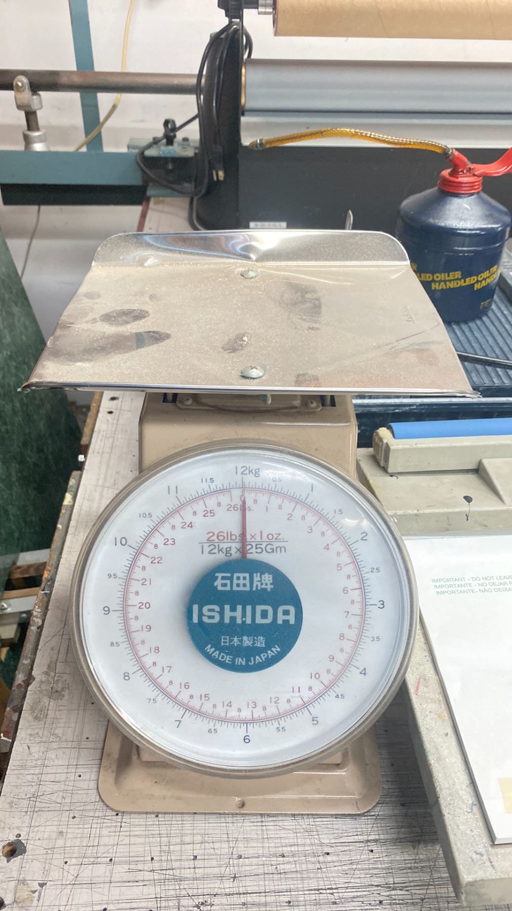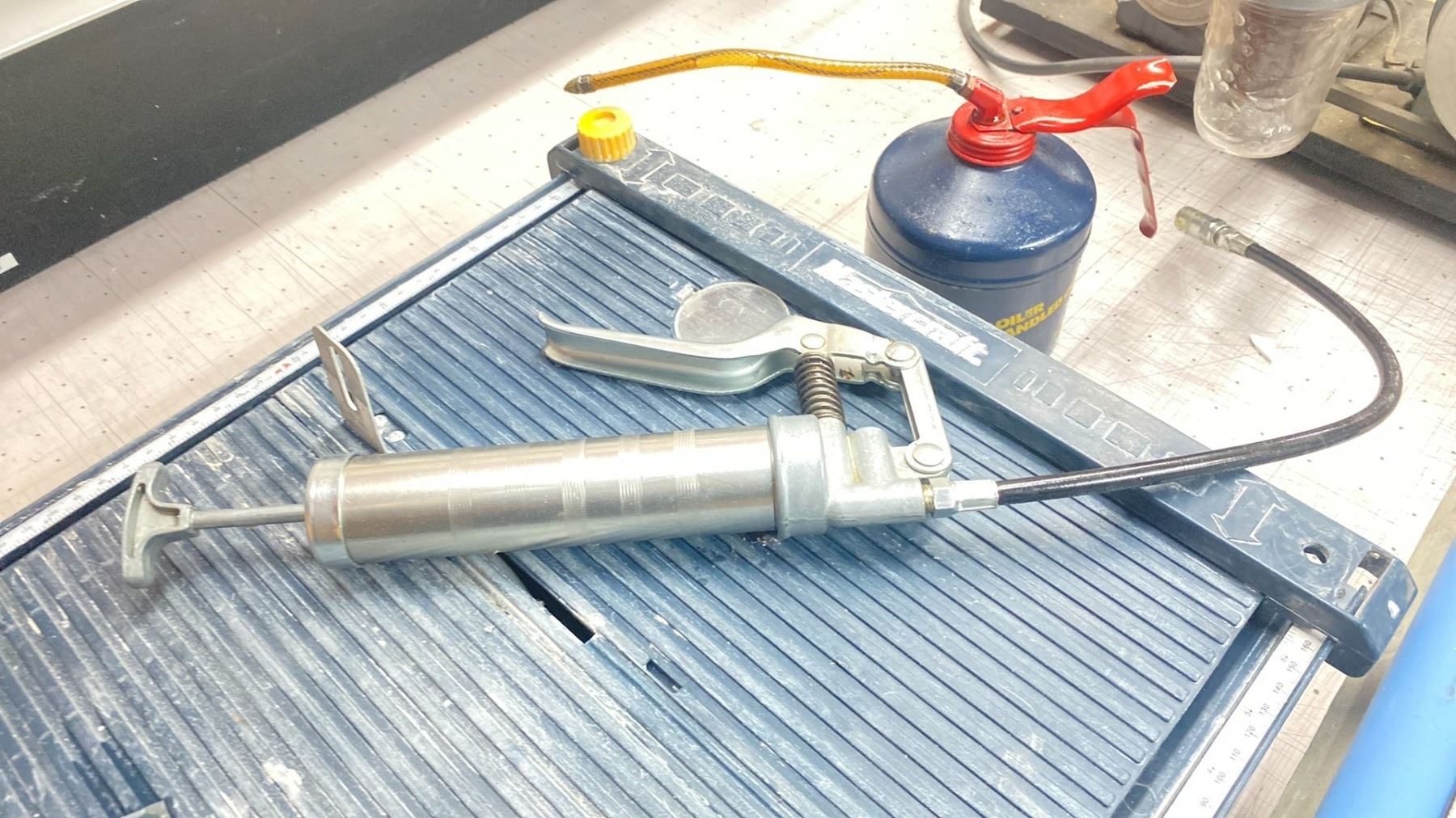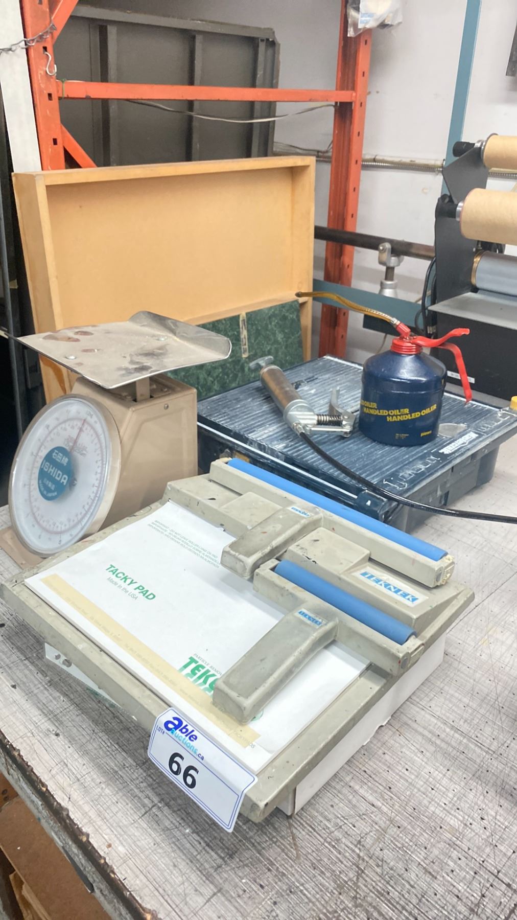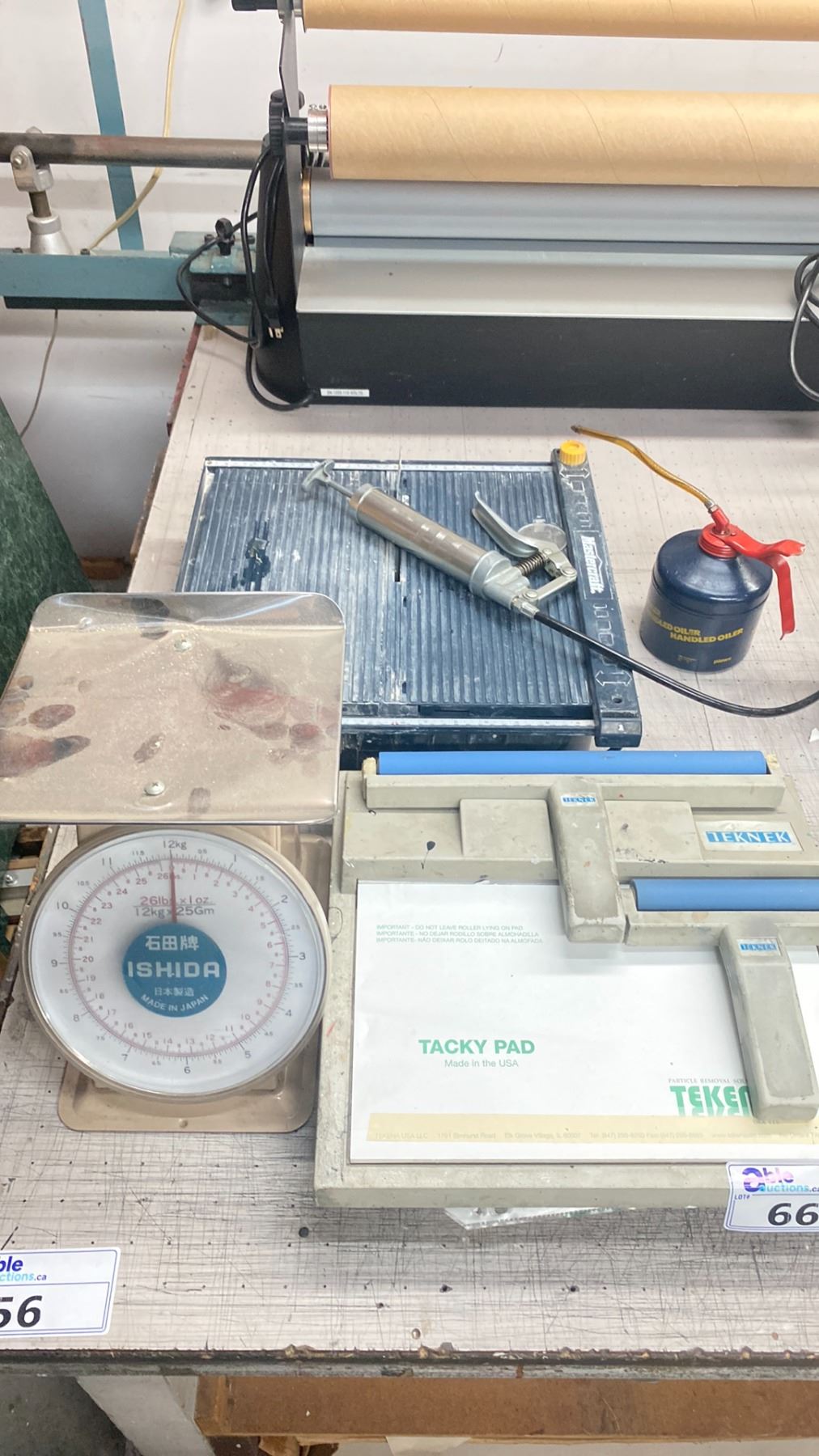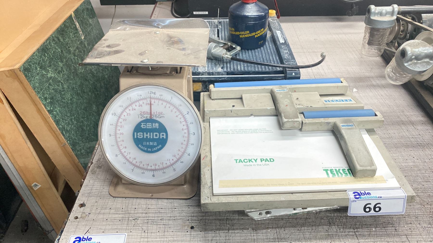 TEKNEK TACKY PAD, MASTERCRAFT 4 1/2" WET TILE SAW, AN ISHIDA SCALE, GREASE GUN & OIL CAN