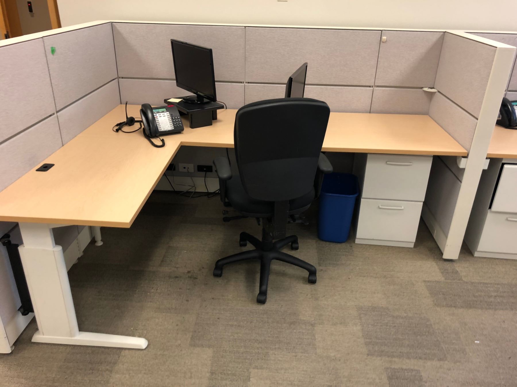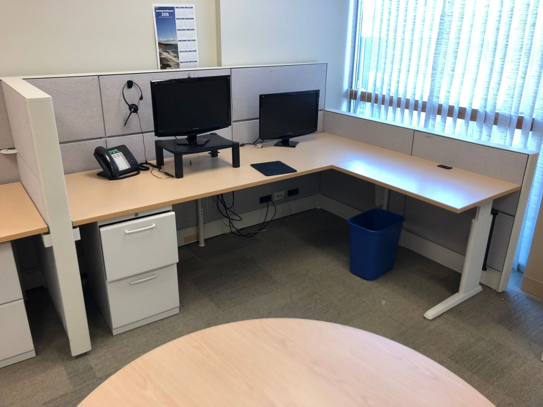 TEKNION 2 PERSON OFFICE CUBICLE STATION WITH MAPLE WORK SURFACES AND FILE PEDESTALS