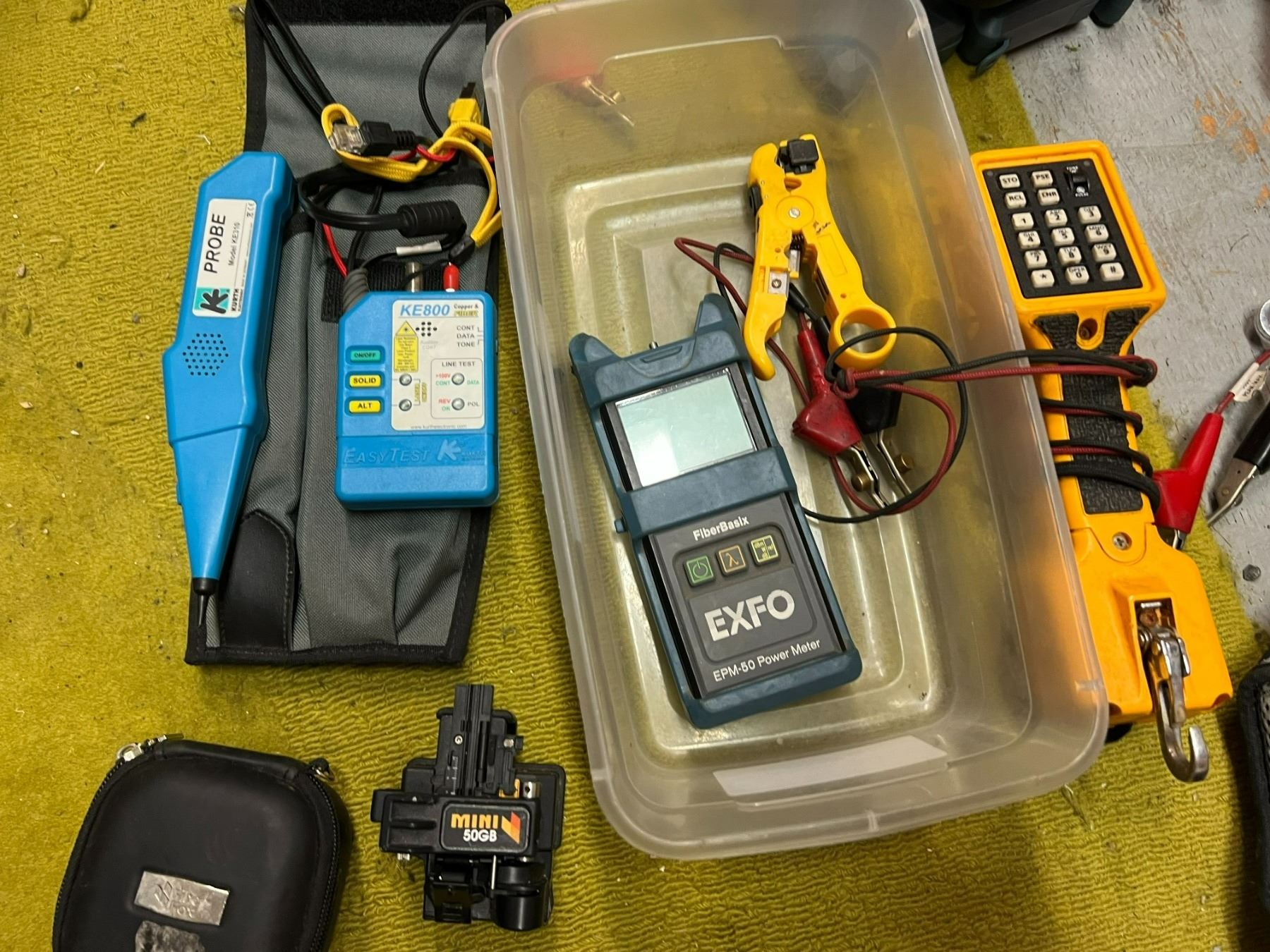 TELECOM KIT WITH EXFO EPM-50 FIBER OPTIC POWER METER, KURTH PROBE MODEL KE310, MODEL KE800 TESTER, FLUKE NETWORKS TS22A LINE TESTER, CABLE CUTTER, FIBREFOX MINI 50G FIBRE CLEAVER