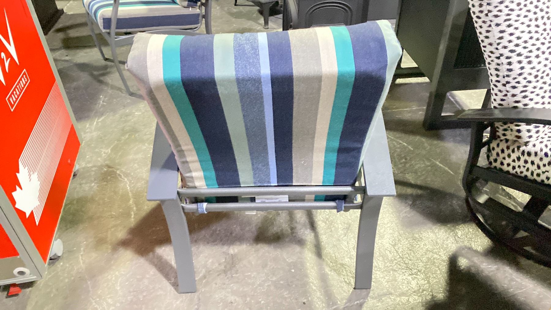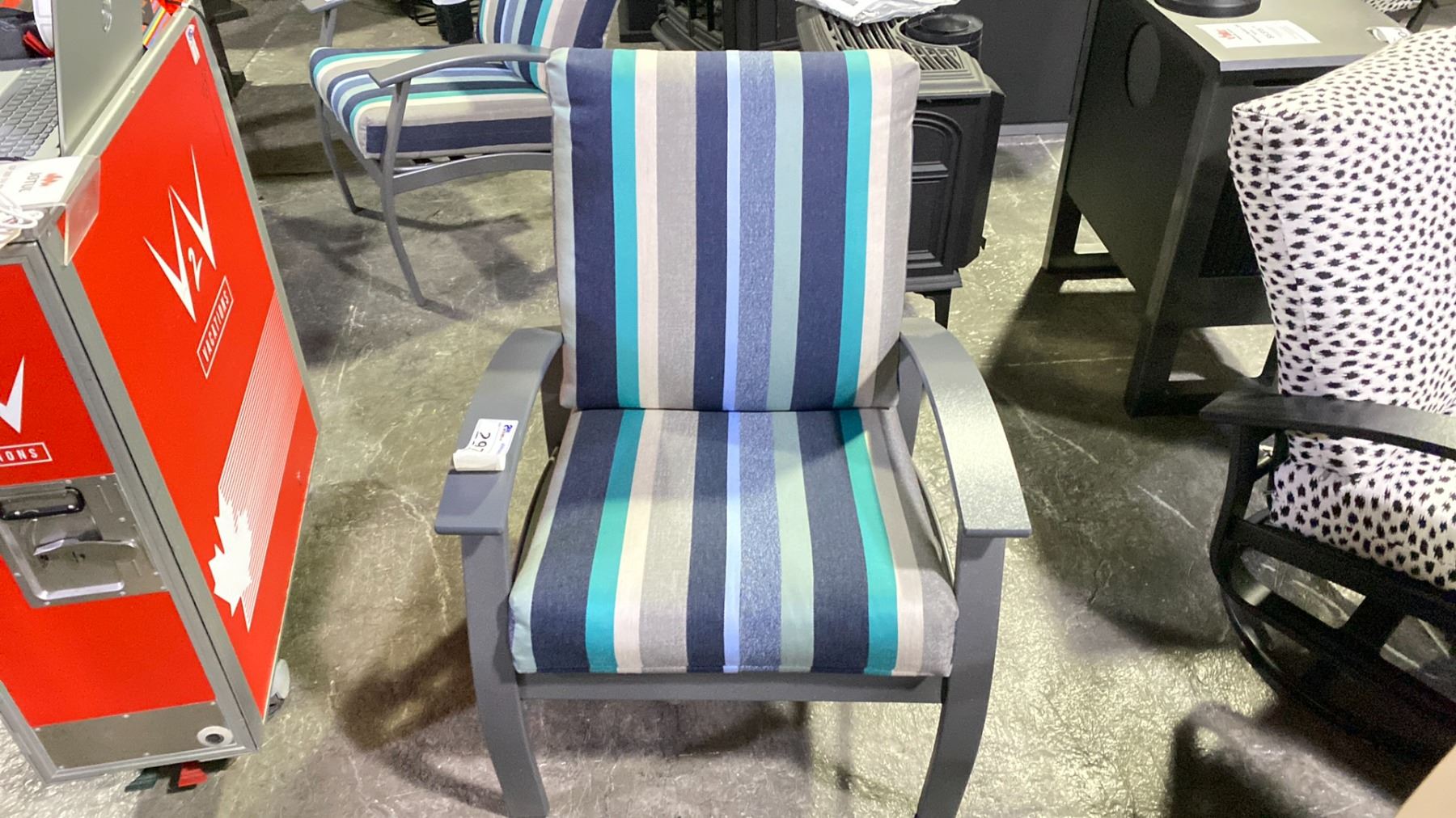 TELESCOPE CASUAL ARM CHAIR. MARINE GRADE POLYMER ARMS TEXTURED POWDER COATED ALUMINUM FRAME. COLOR AS SHOWN RETAIL $1249