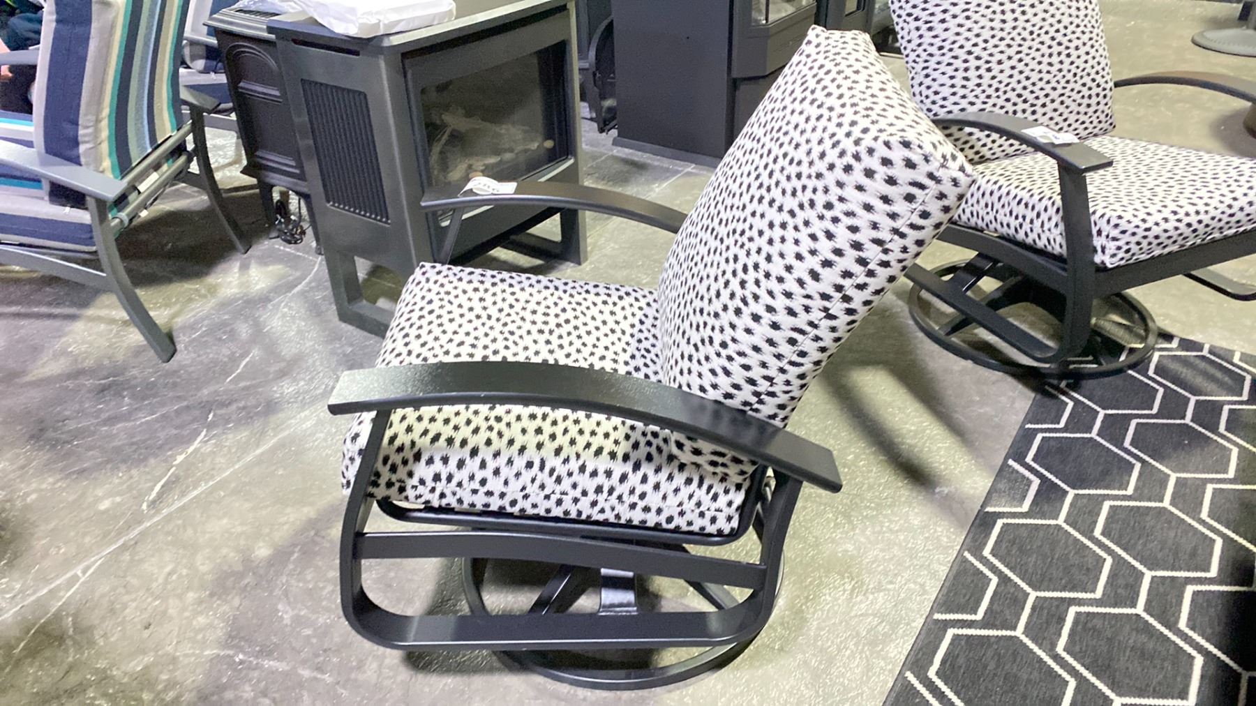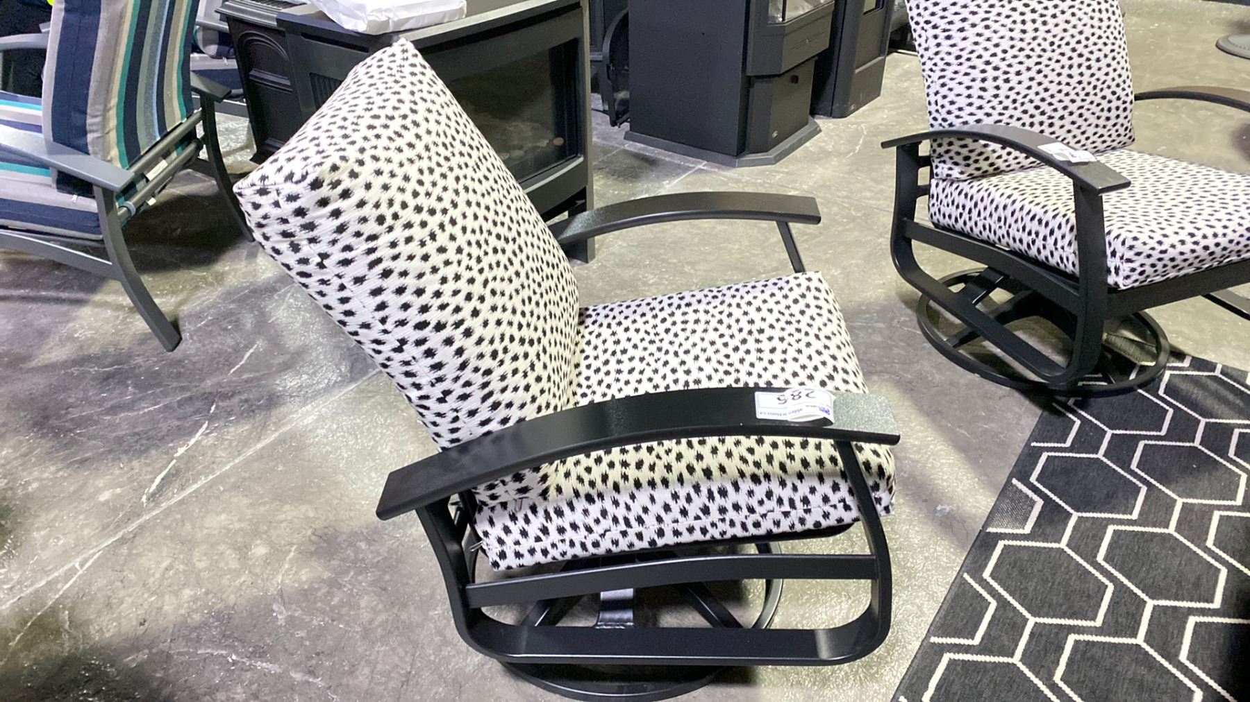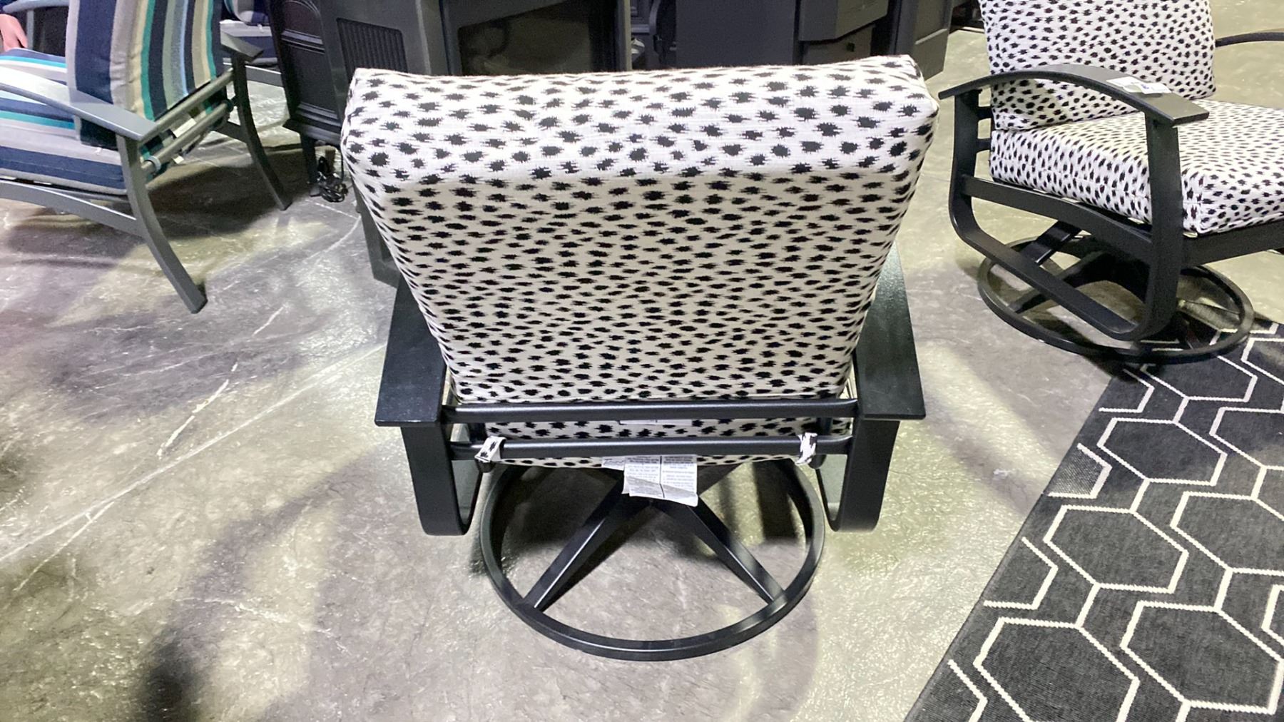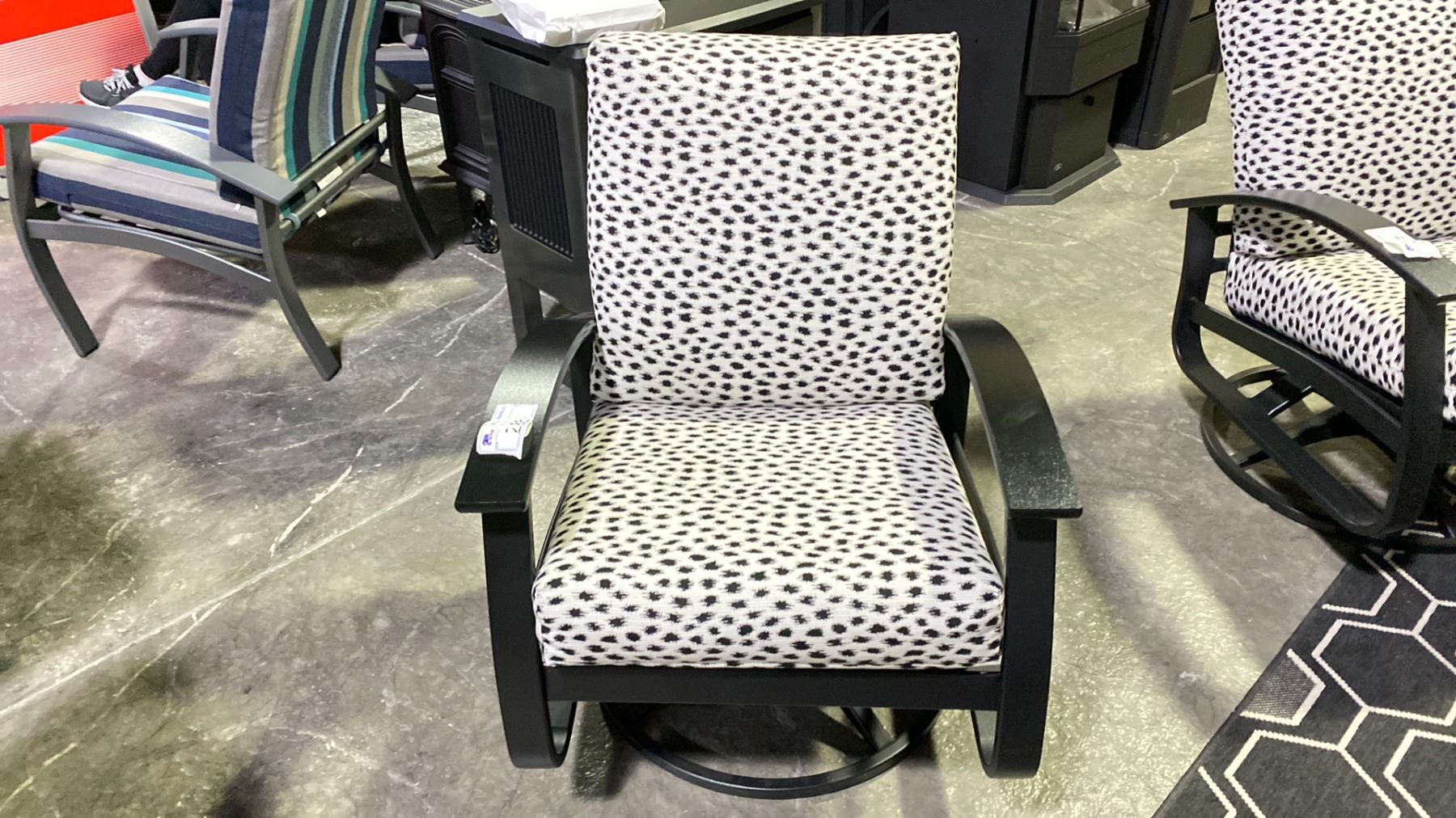 TELESCOPE CASUAL BELLE ISLE CUSHION SWIVEL ROCKER CHAIR COLOR AGRA CLASSIC FABRIC & BLACK FRAME. MARINE GRADE POLYMER ARMS & TEXTURED POWDER COATED ALUMINUM FRAME RETAIL $1249