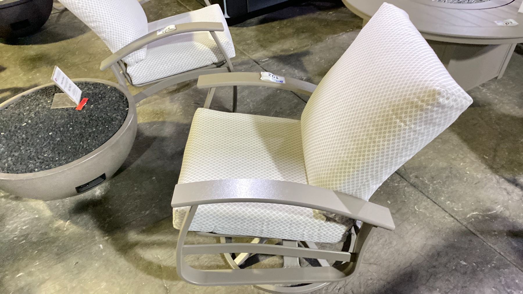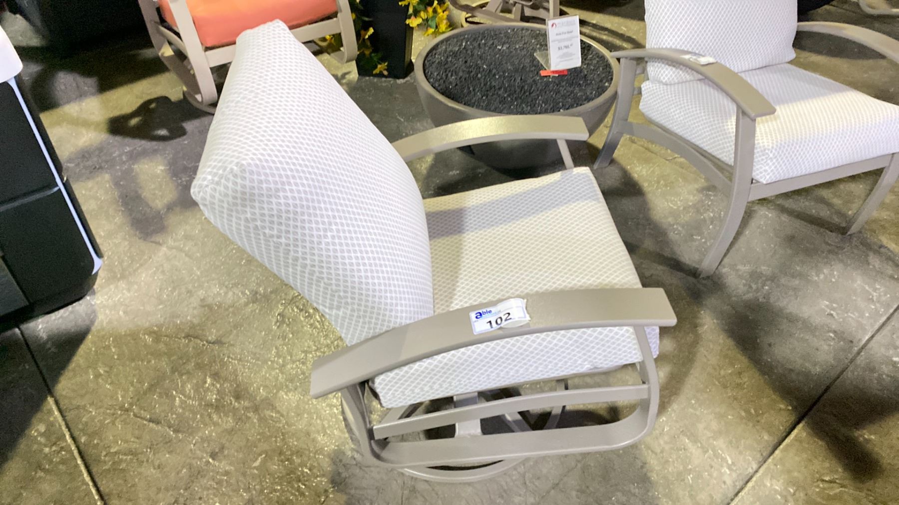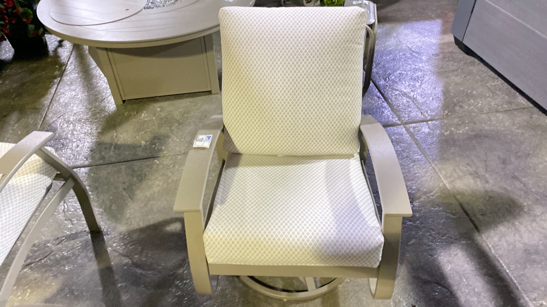 TELESCOPE CASUAL BELLE ISLE CUSHION SWIVEL ROCKER WITH DETAIL LINEN FABRIC AND STORM FRAME. MARINE GRADE POLYMER ARMS AND TEXTURED POWDER COATED ALUMINUM FRAME