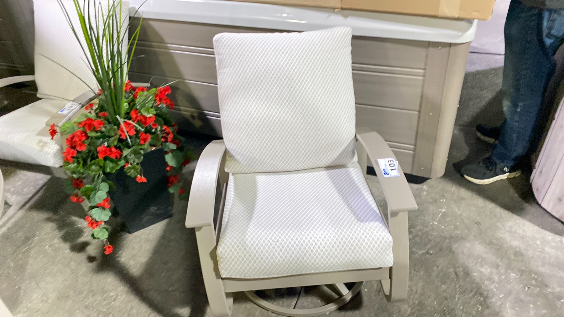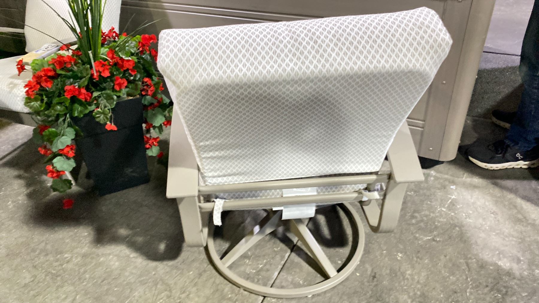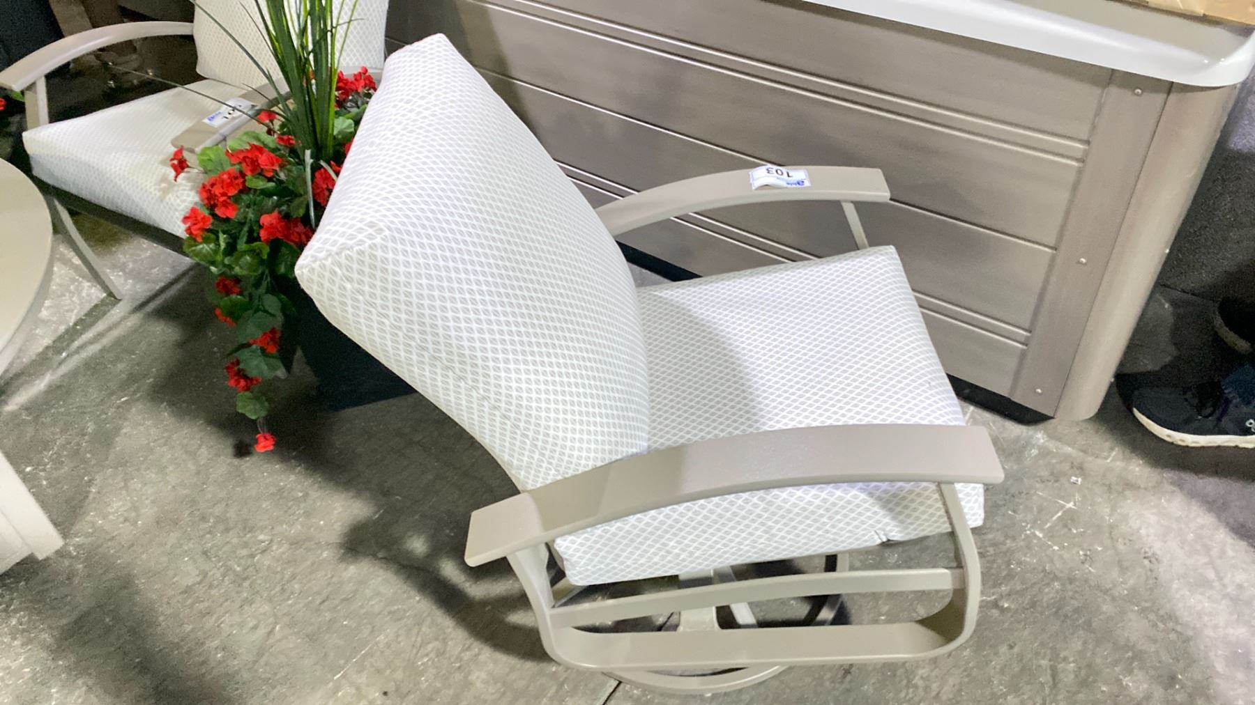 TELESCOPE CASUAL BELLE ISLE CUSHION SWIVEL ROCKER WITH DETAIL LINEN FABRIC AND STORM FRAME. MARINE GRADE POLYMER ARMS AND TEXTURED POWDER COATED ALUMINUM FRAME