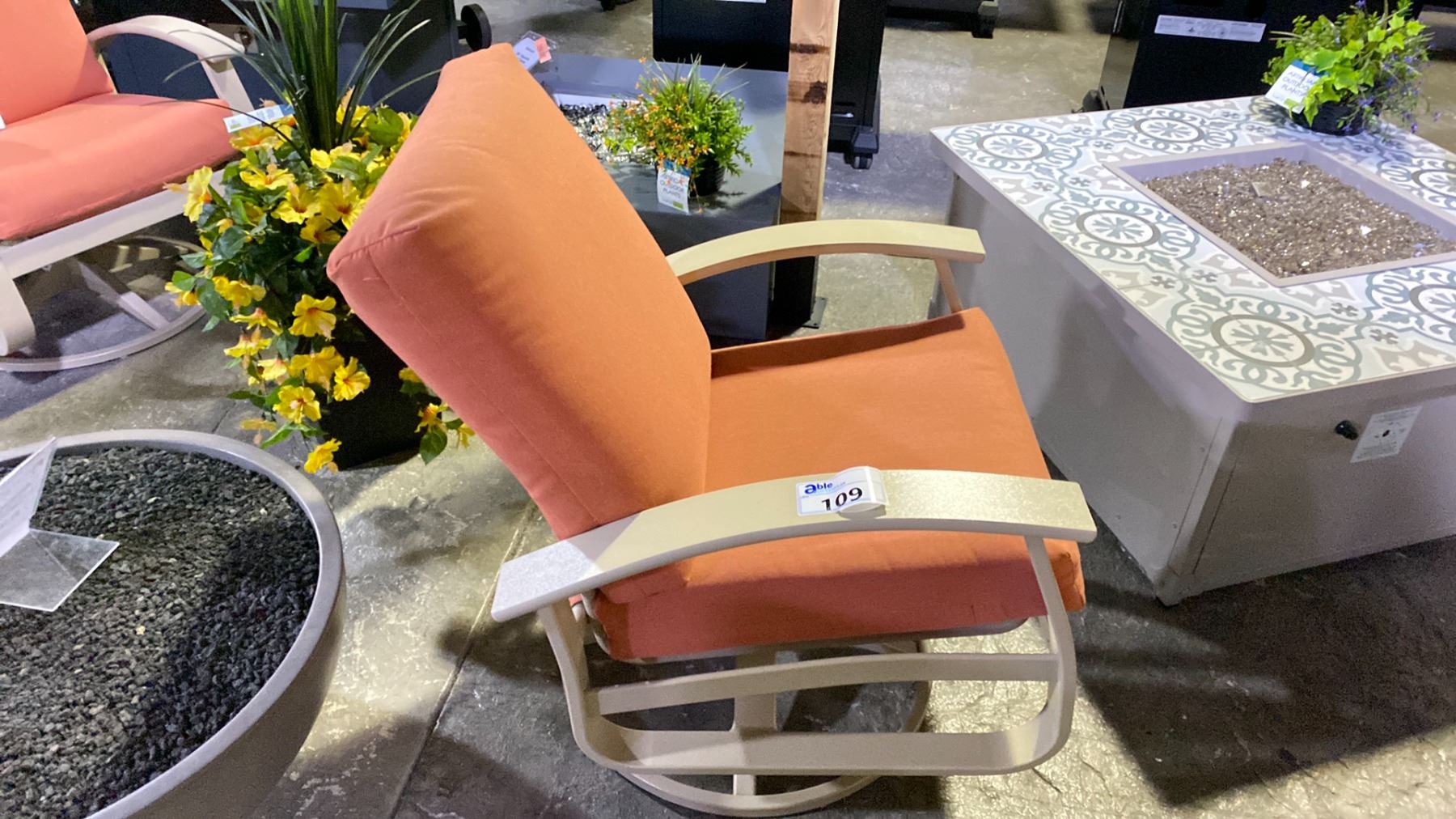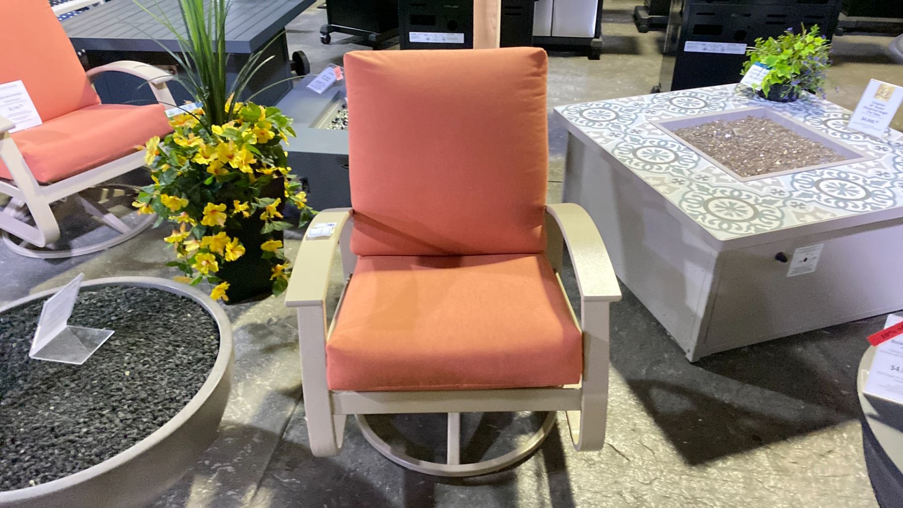 TELESCOPE CASUAL BELLE ISLE CUSHION SWIVEL ROCKER WITH PERSIMMON FABRIC AND DESERT FRAME. MARINE GRADE POLYMER ARMS AND TEXTURED POWDER COATED ALUMINUM FRAME
