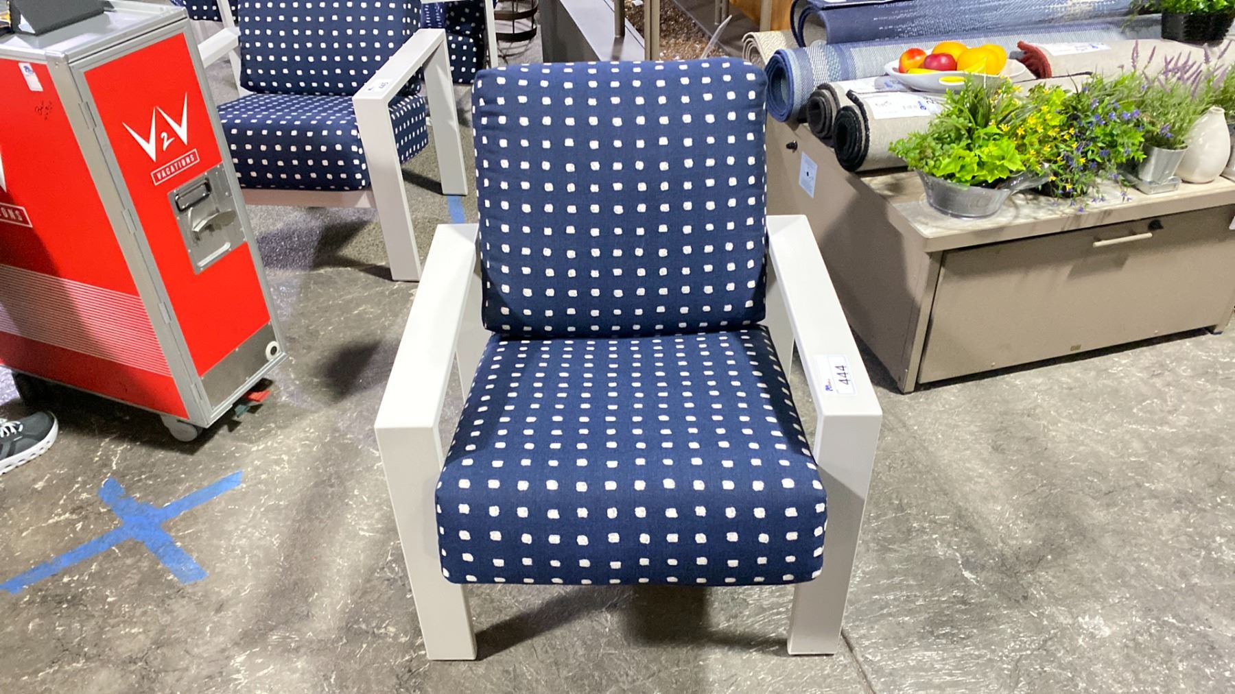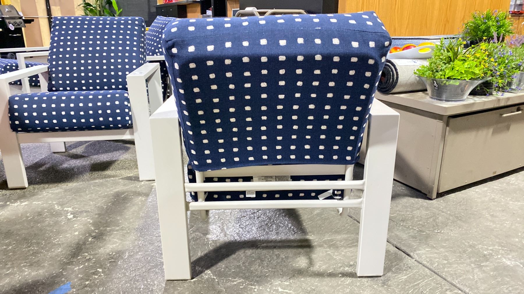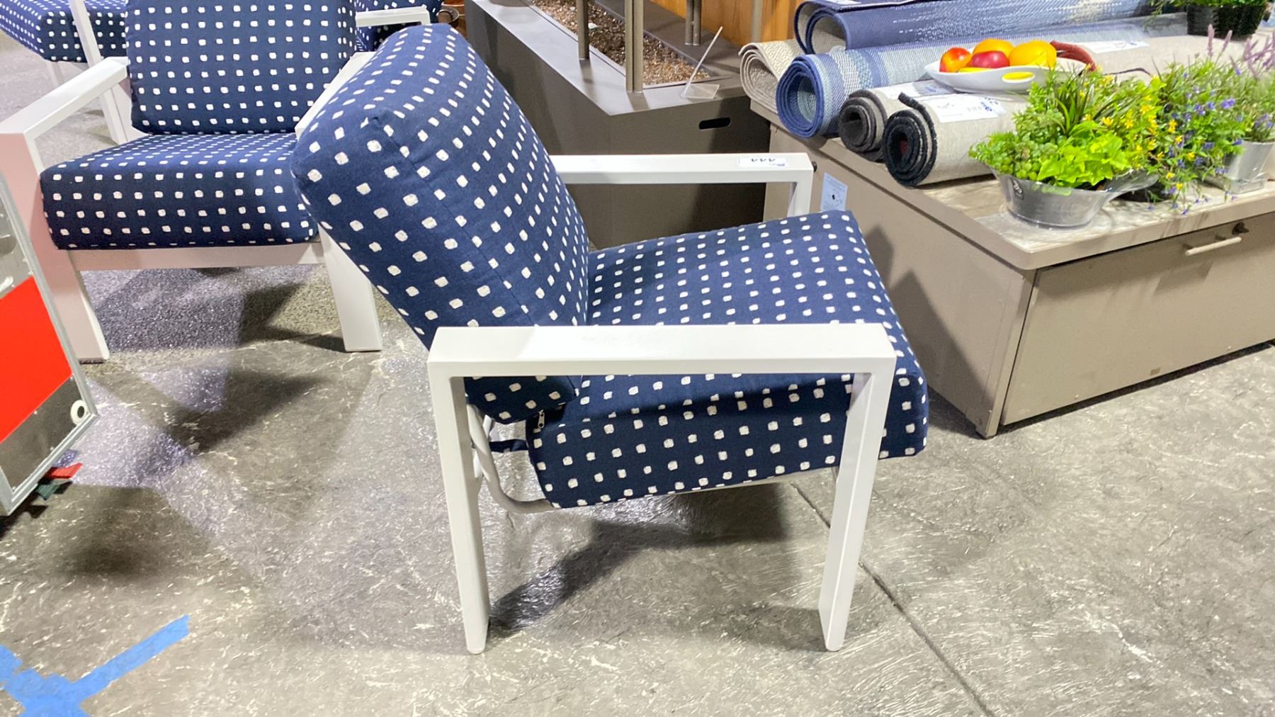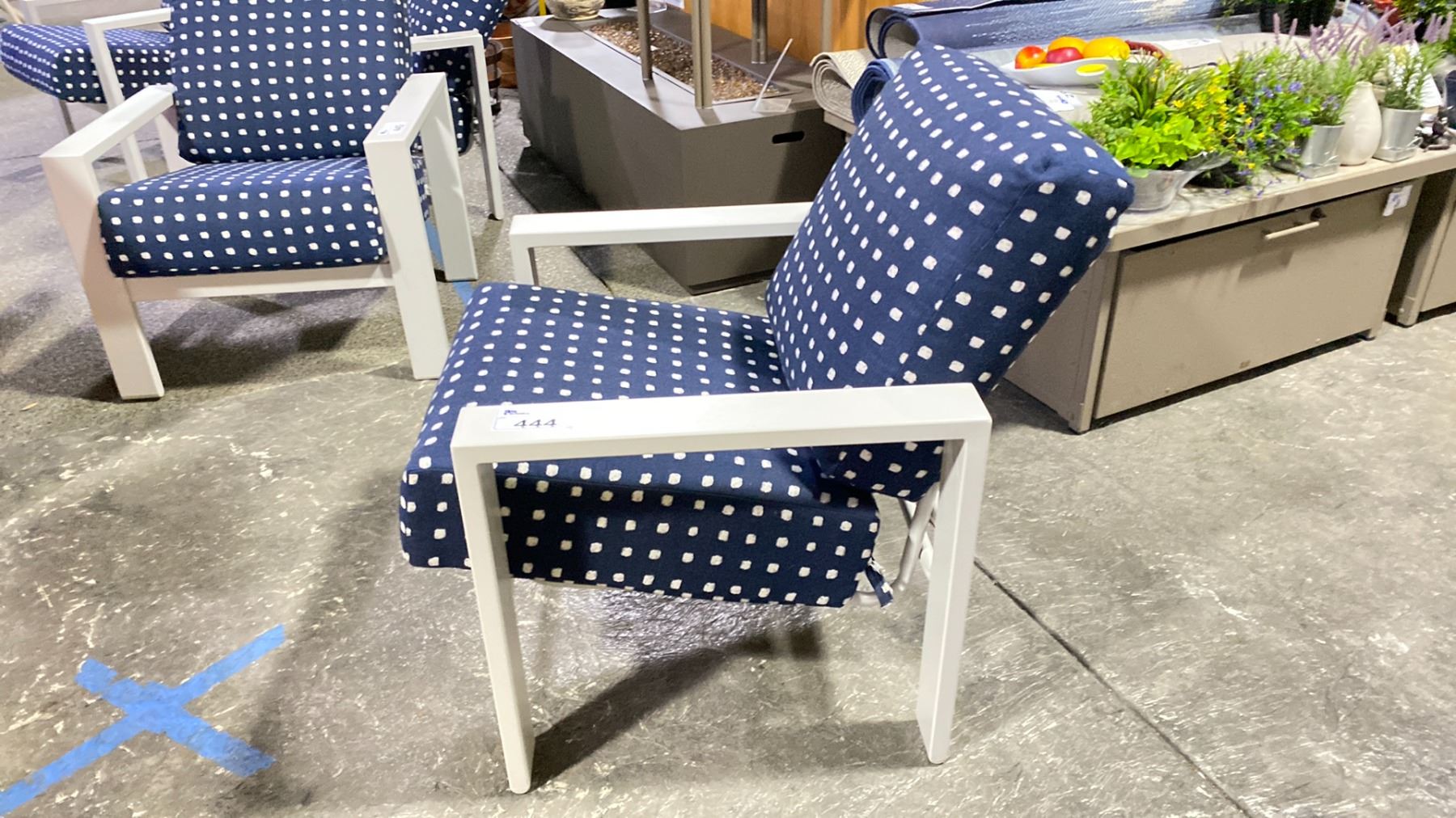 TELESCOPE CASUAL CUSHIONED ARM CHAIR. BLUE/WHITE WITH WARM GREY POLYMER COATED ARMS, MARINE GRADE TEXTURED POWDER COATED ALUMINUM FRAME. RETAIL PRICE $1550