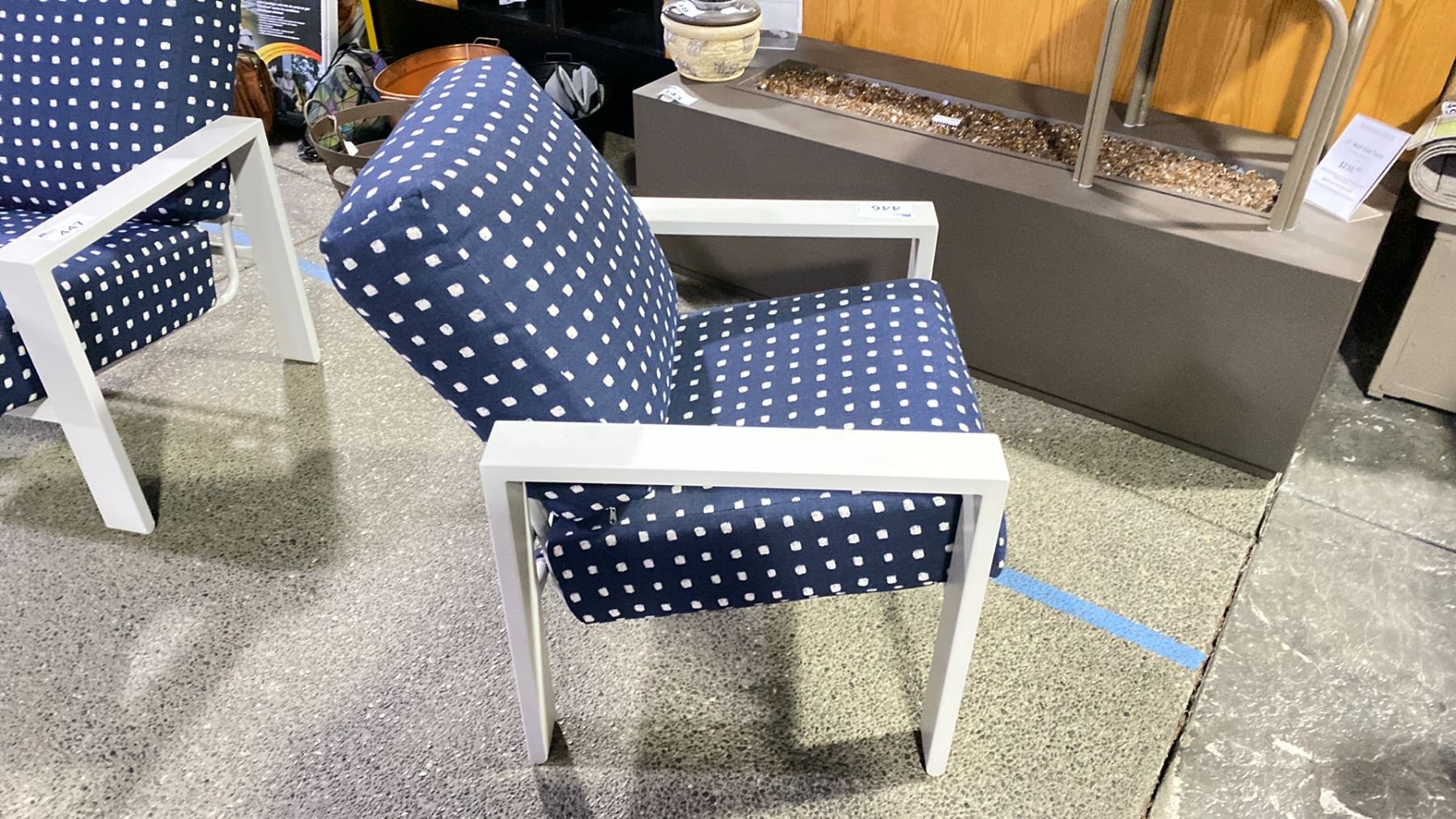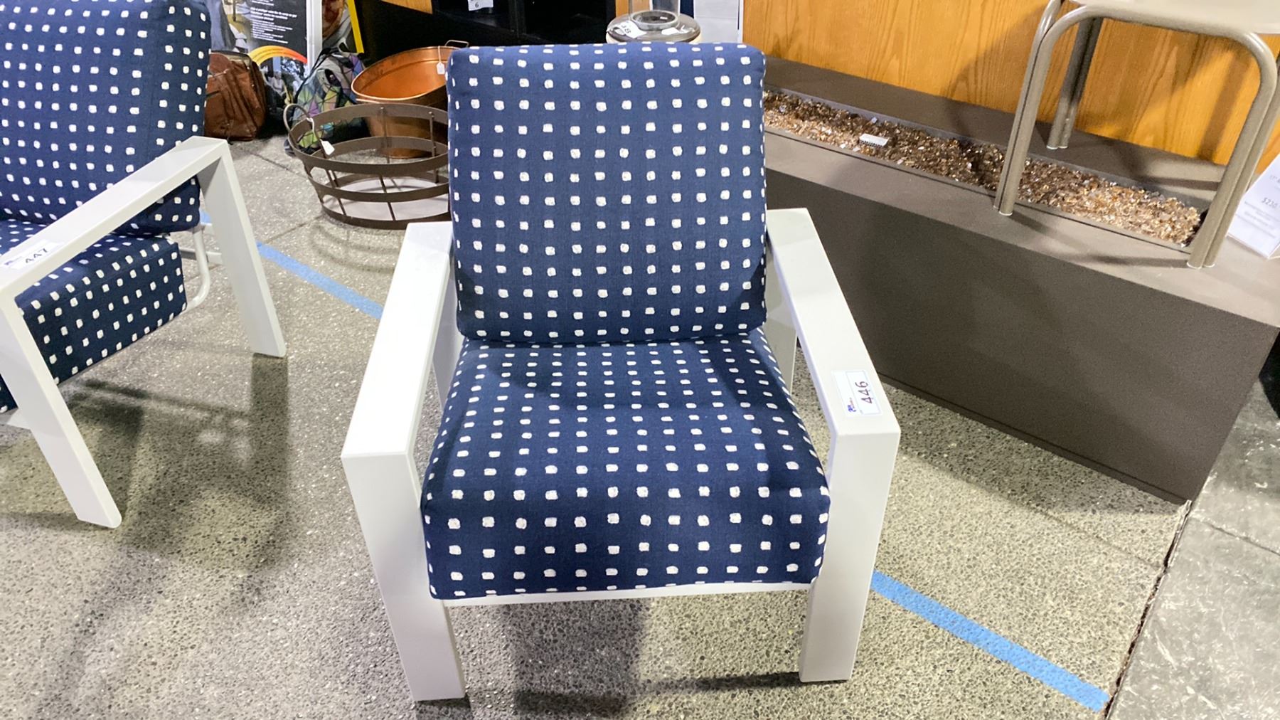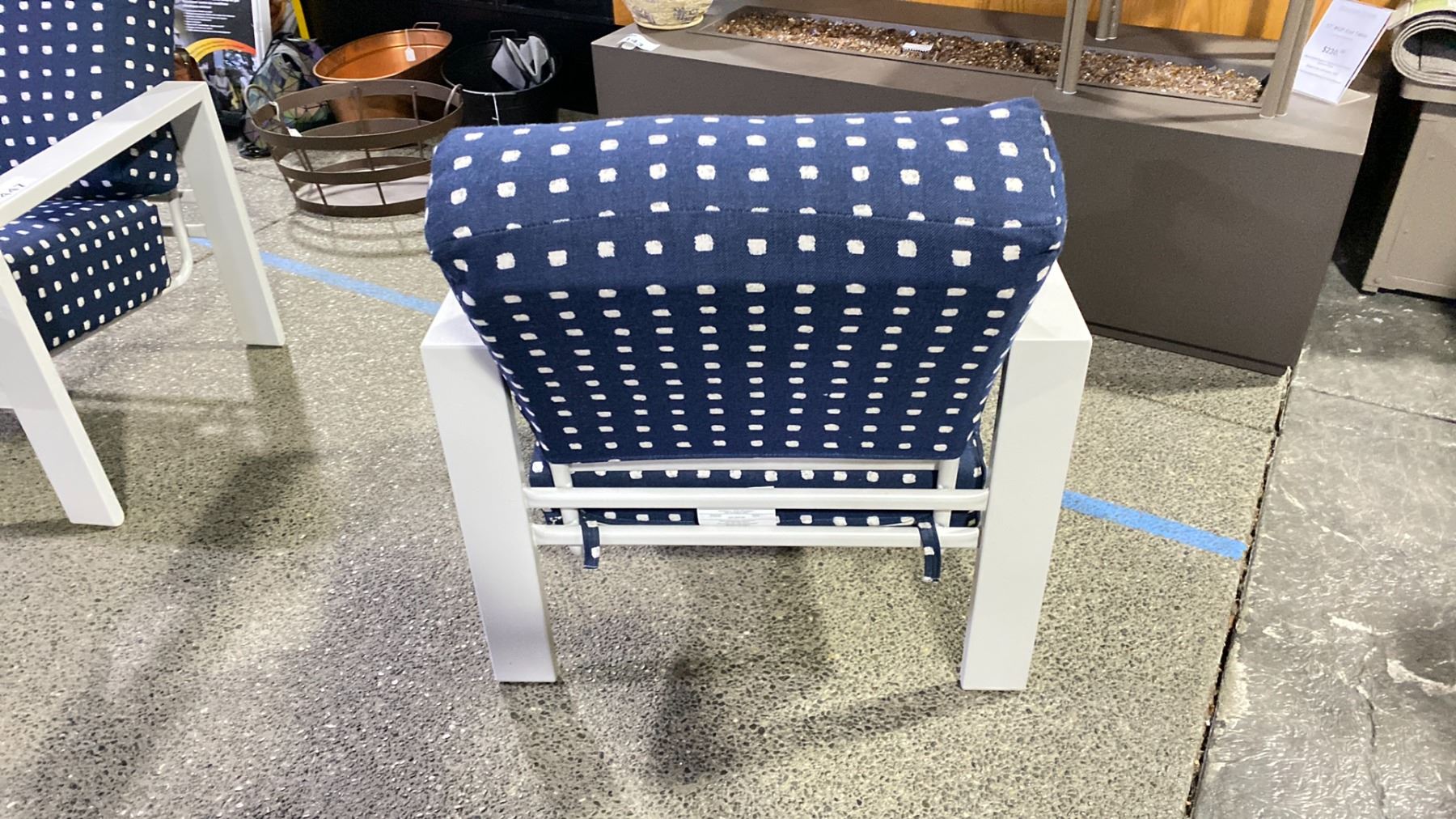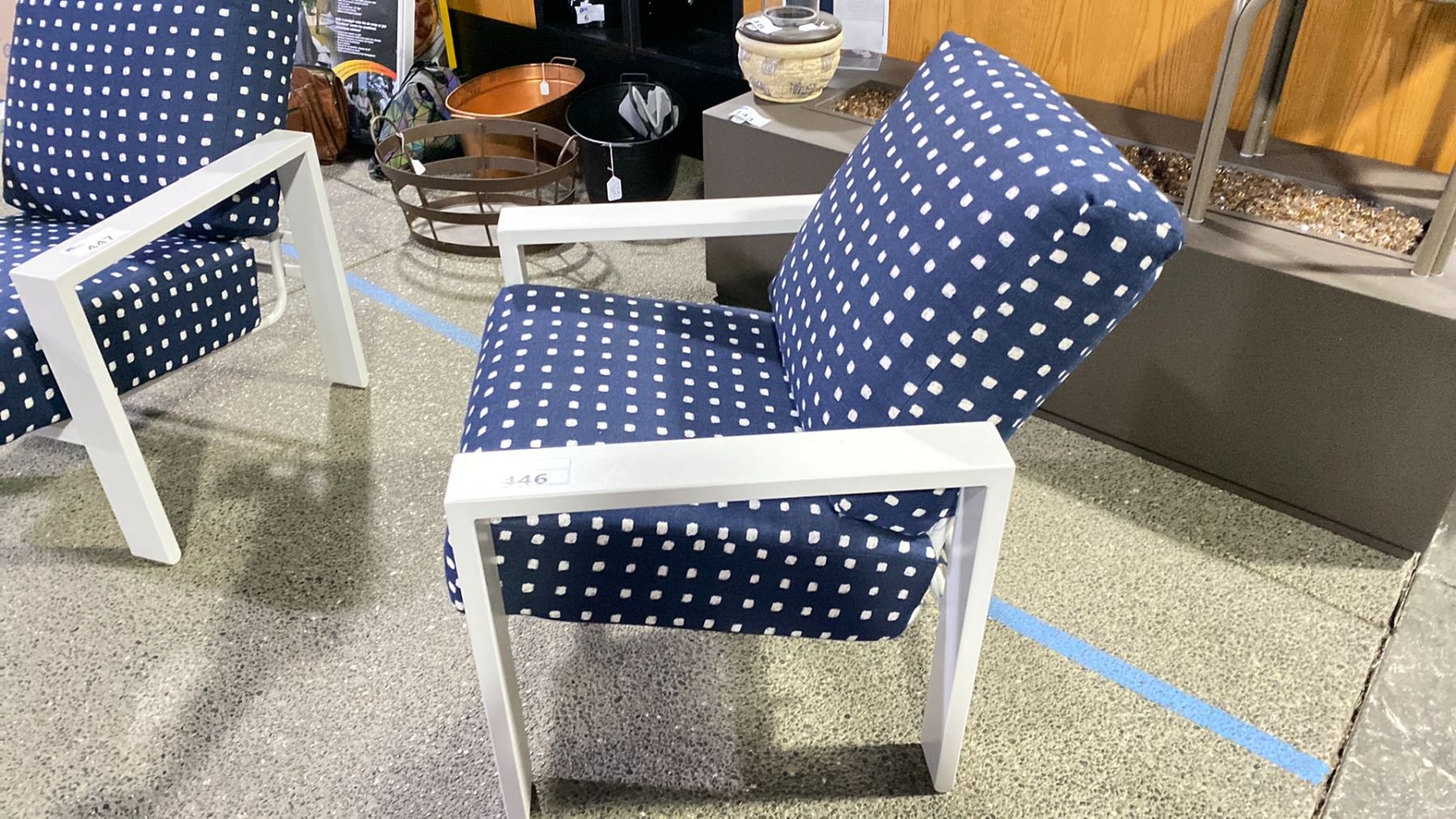 TELESCOPE CASUAL CUSHIONED ARM CHAIR. BLUE/WHITE WITH WARM GREY POLYMER COATED ARMS, MARINE GRADE TEXTURED POWDER COATED ALUMINUM FRAME. RETAIL PRICE $1550