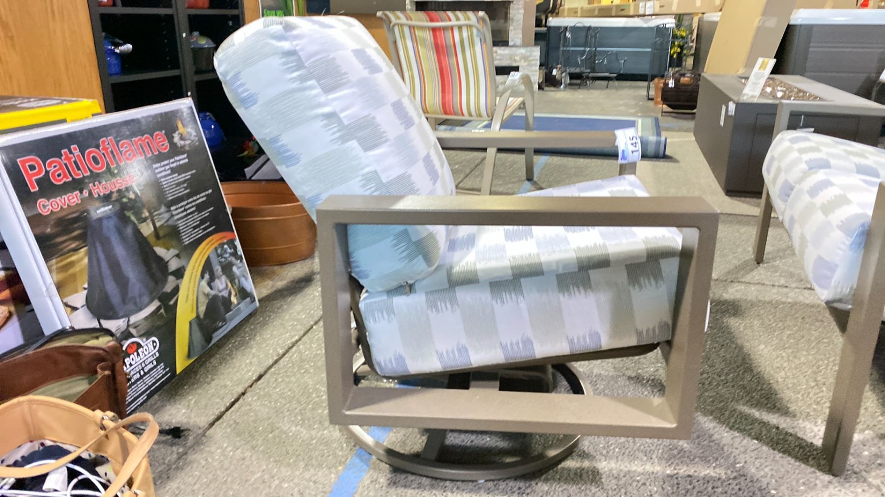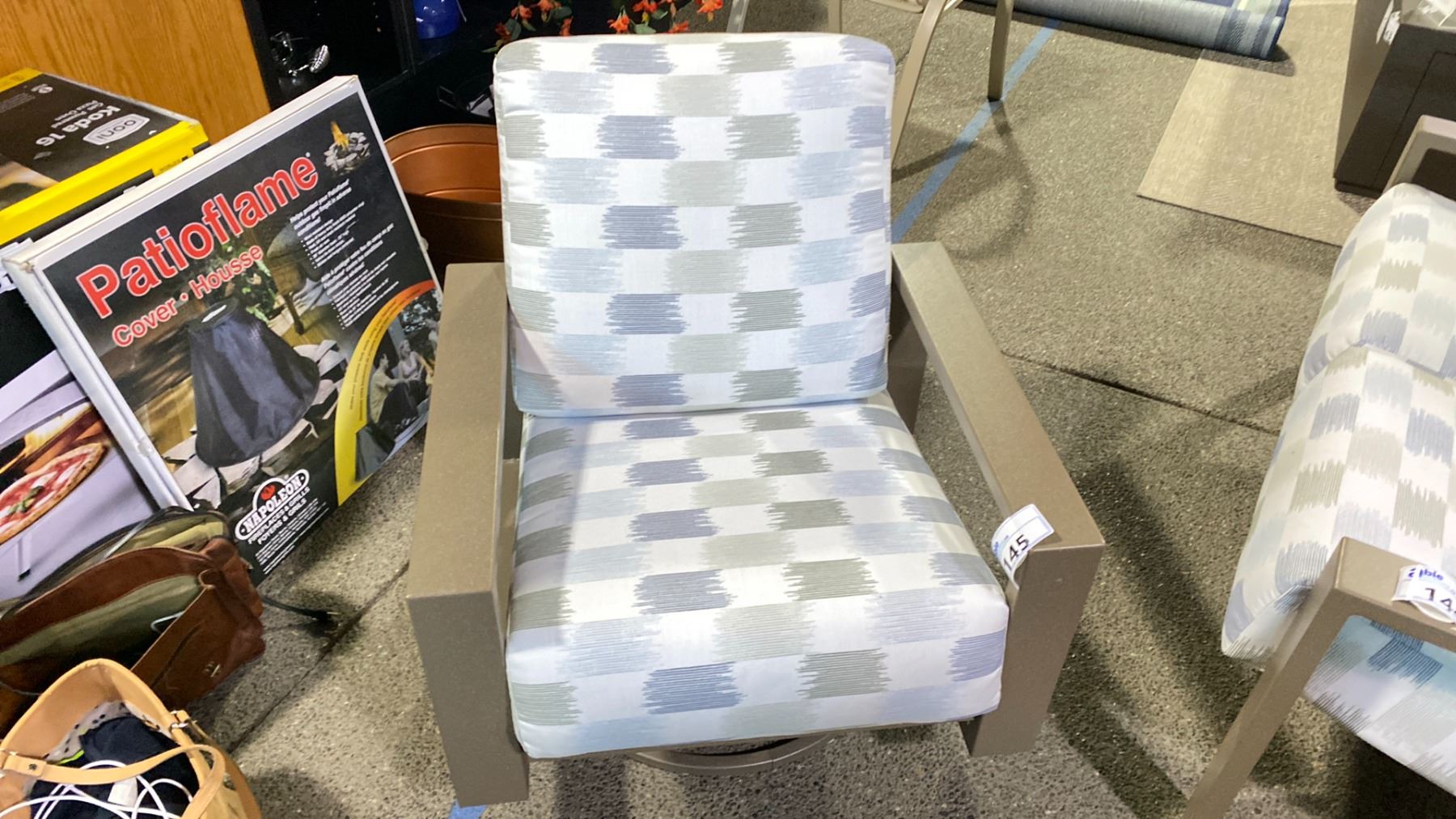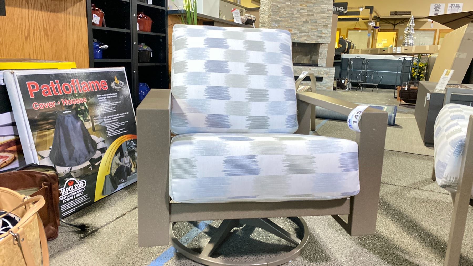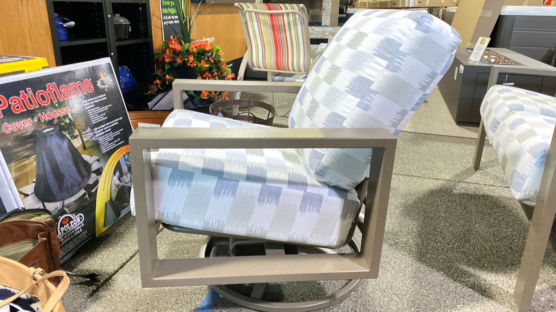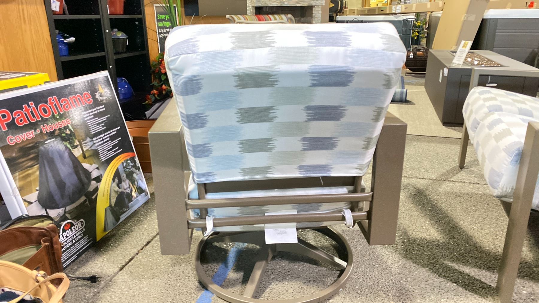 TELESCOPE CASUAL LARSSEN CUSHION SWIVEL ROCKER. BEACHWOOD COLOR FRAME AND DREAM MIST FABRIC. TEXTURED POWDER COATED ALUMINUM FRAME. RETAILS APPROX $1900