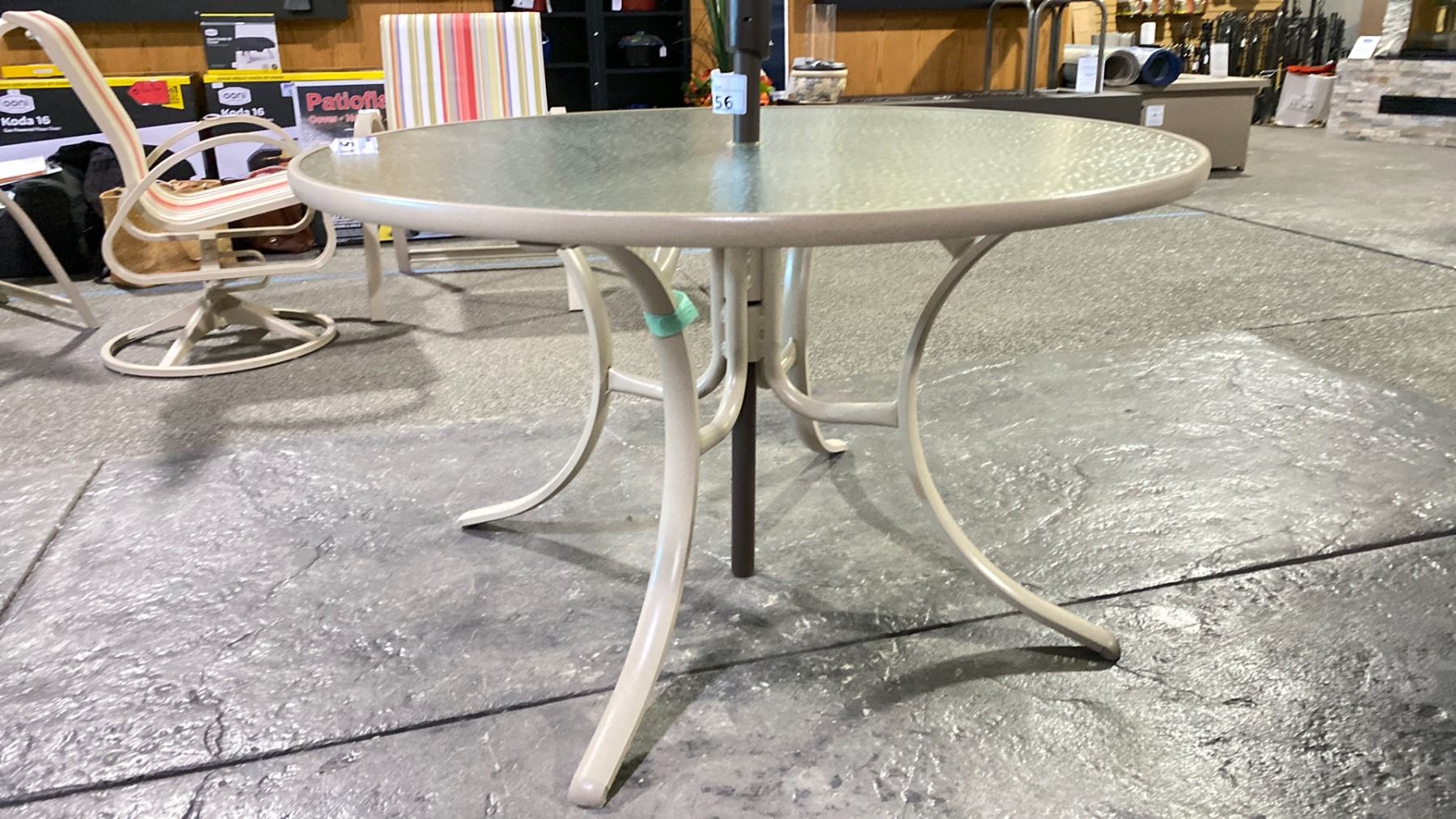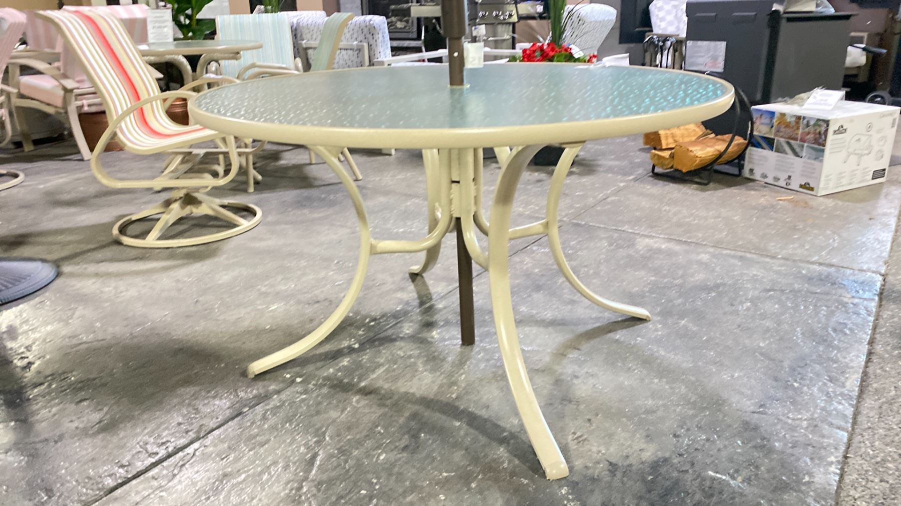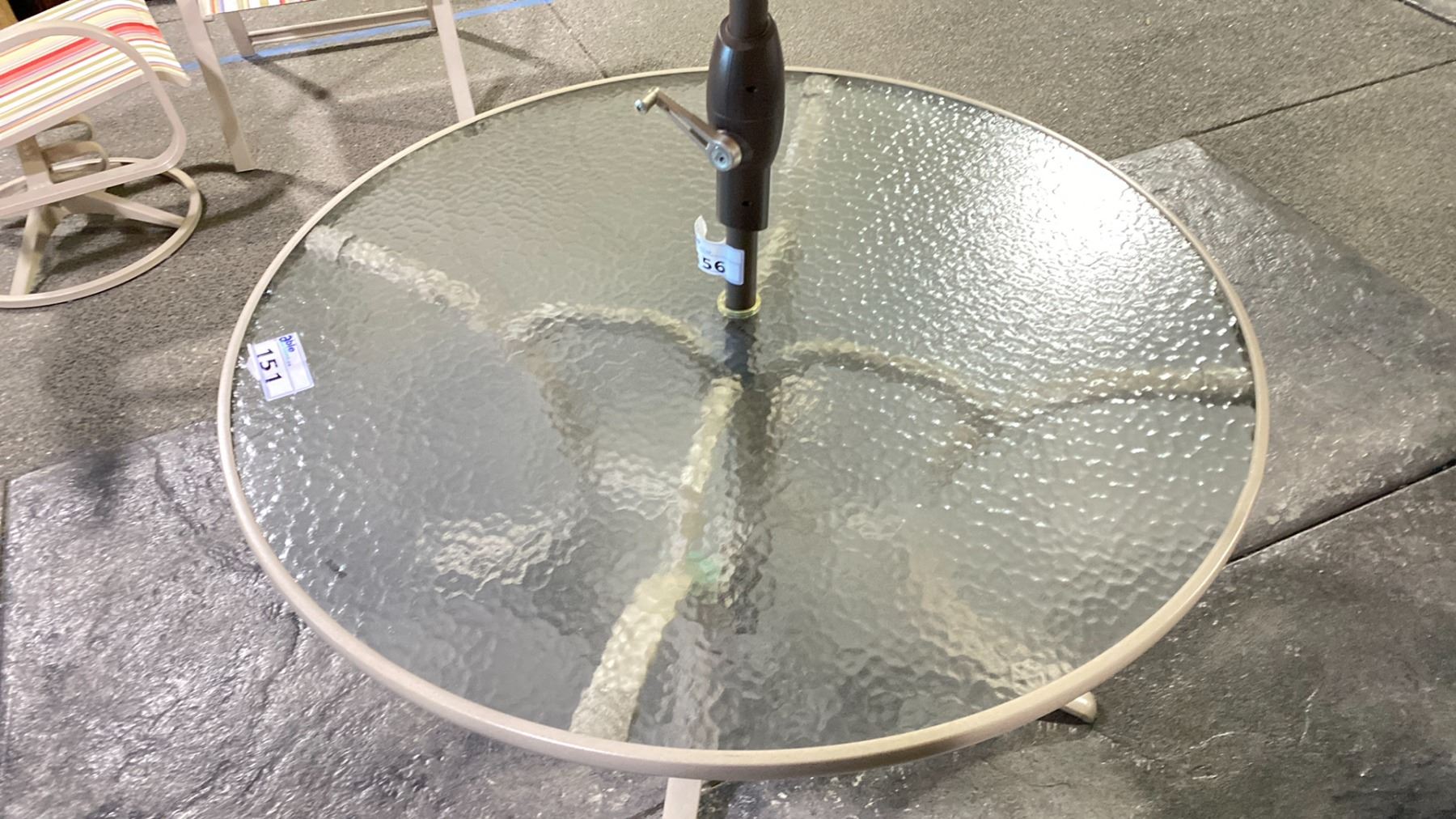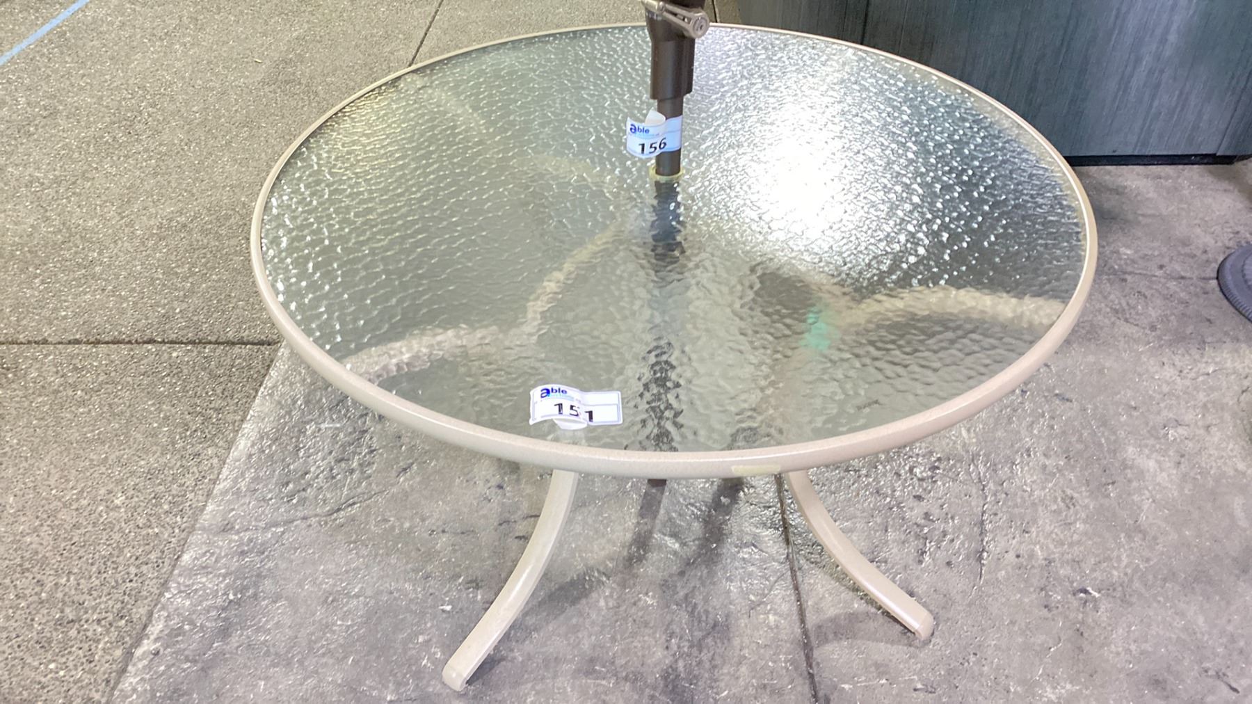 TELESCOPE GARDEN GLASS TOPPED 48" DIAMETER PATIO TABLE WITH POWDER COATED ALUMINUM FRAME