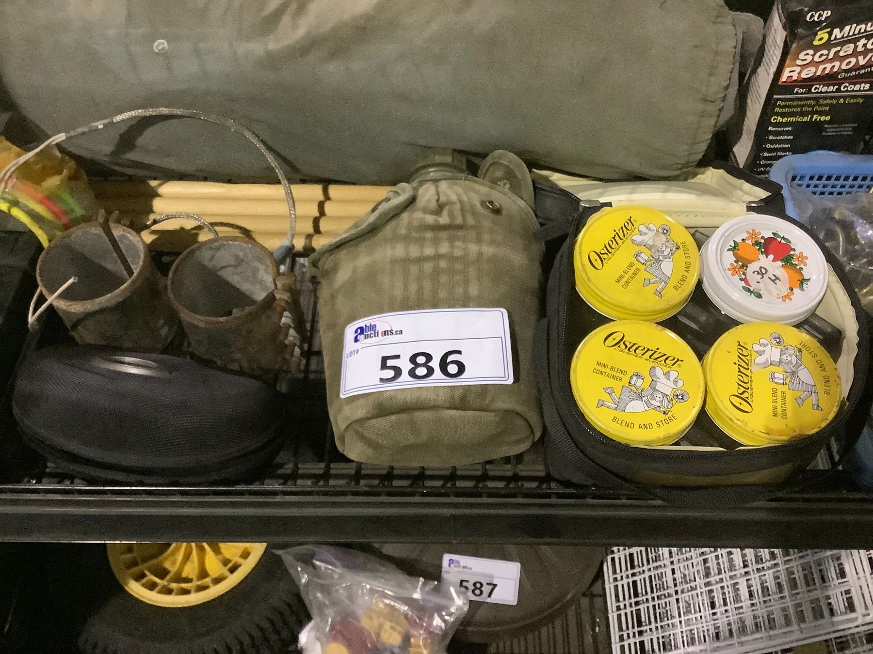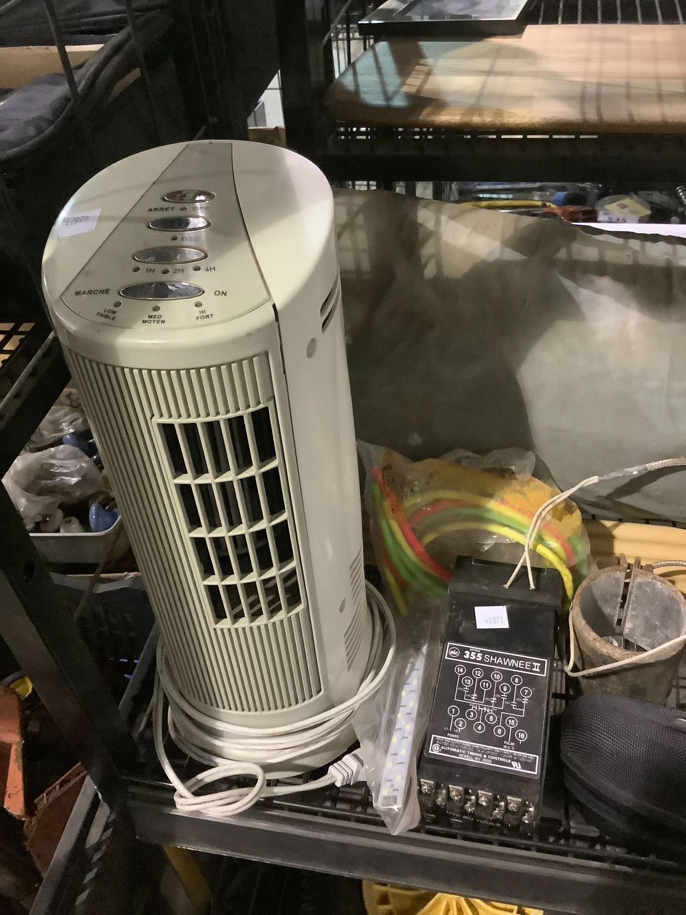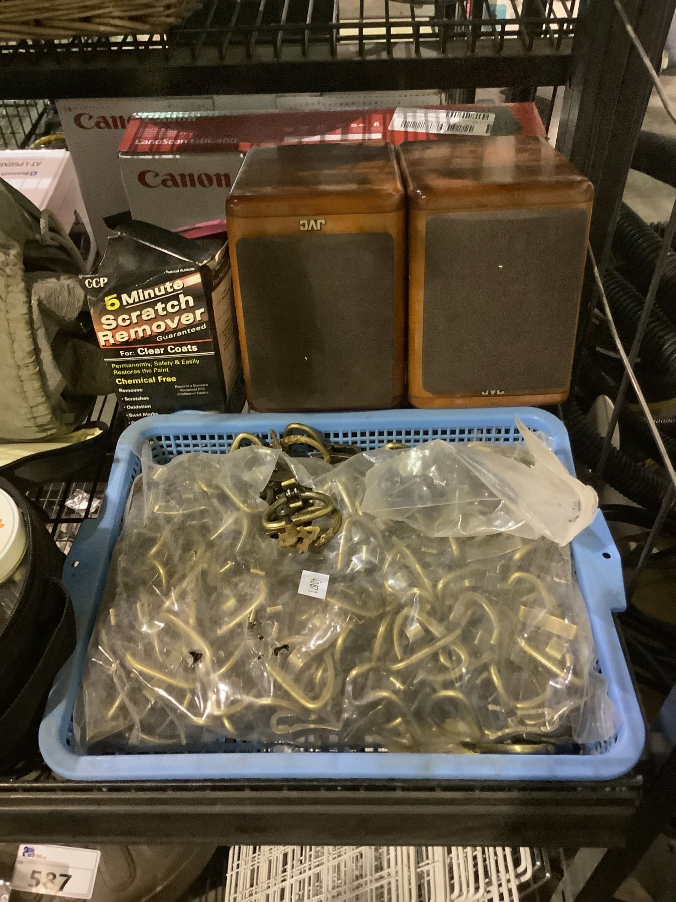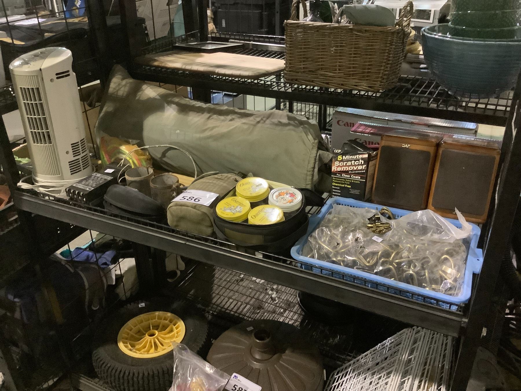 TENT, HEATER, BASKET OF METAL BAG STRAP CLIPS, 2 JVC SPEAKERS, HEATER BANDS AND CONTROLLER, AND MORE