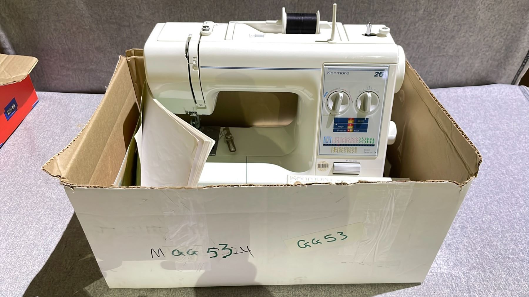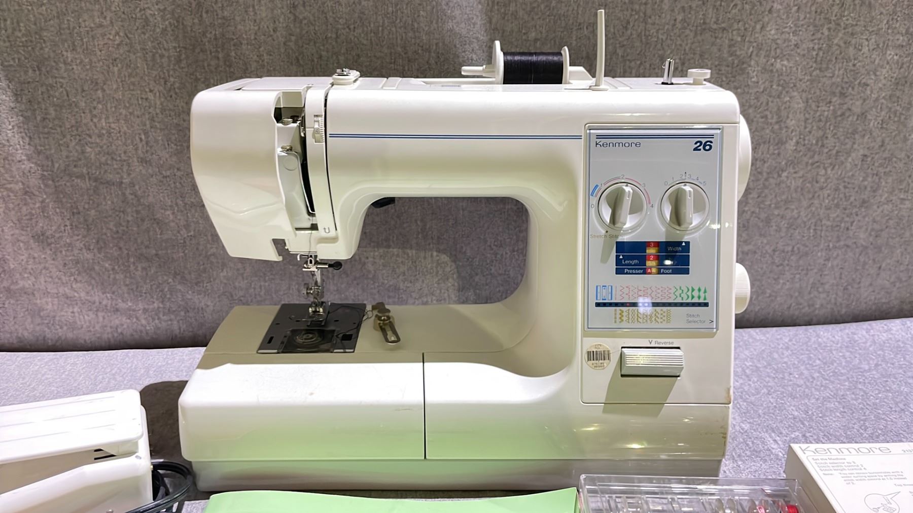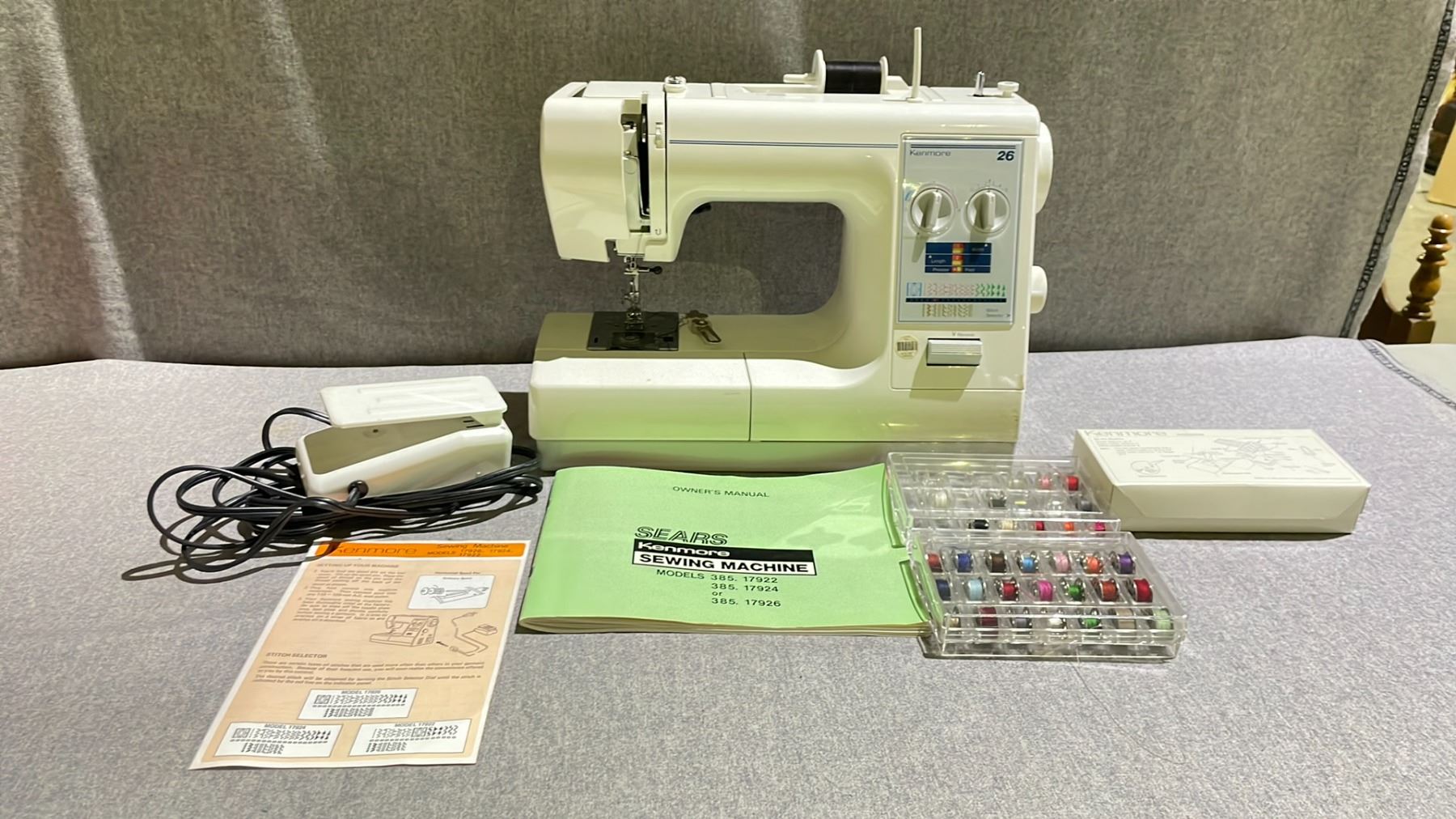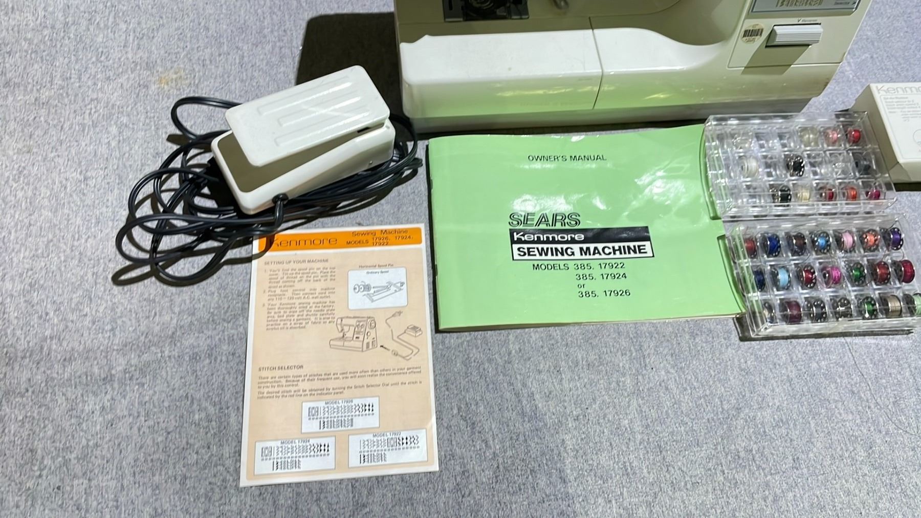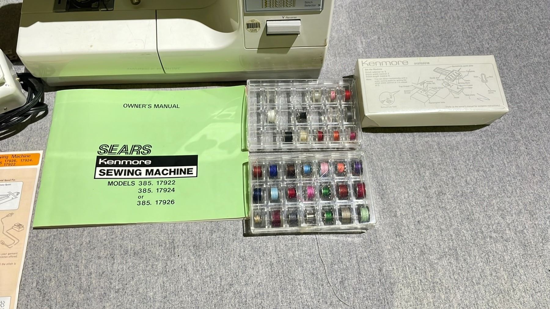 *TESTED WORKING* KENMORE MODEL 385.17926 SEWING MACHINE WITH ACCESSORIES & MANUALS, *NEW IN BOX* BUTTON HOLE ATTACHMENT & 2 CONTAINERS OF ASSORTED BOBBINS