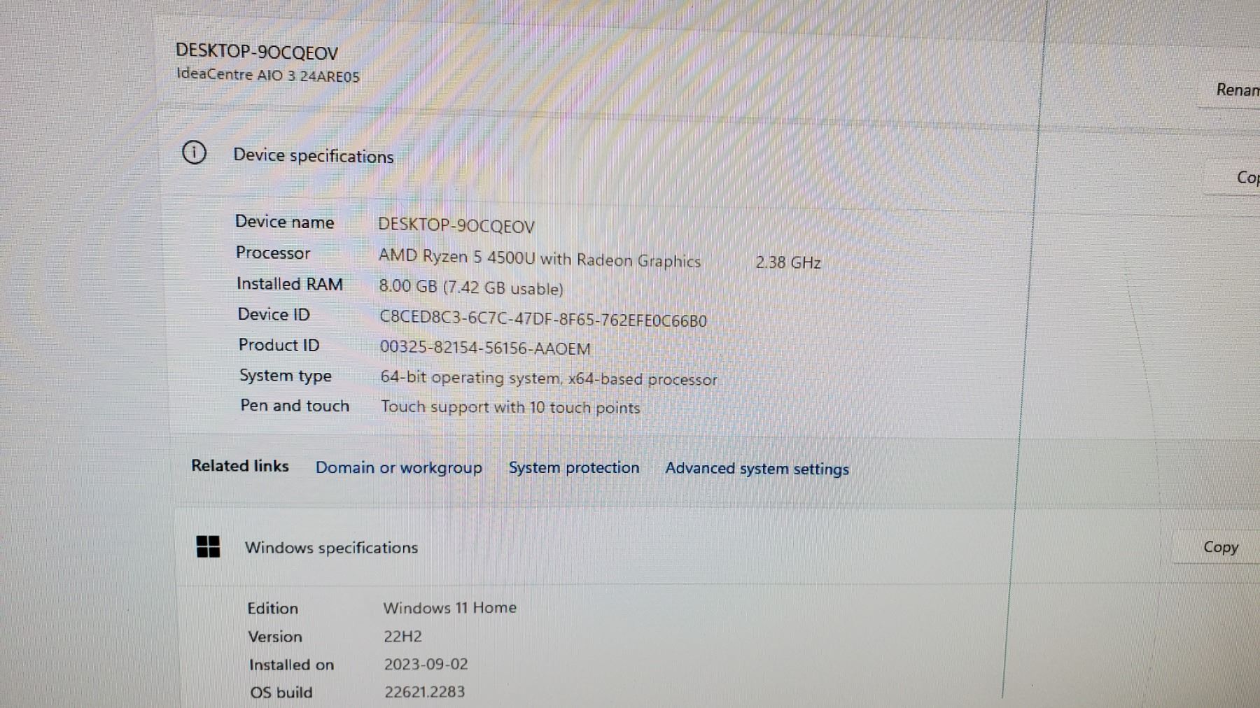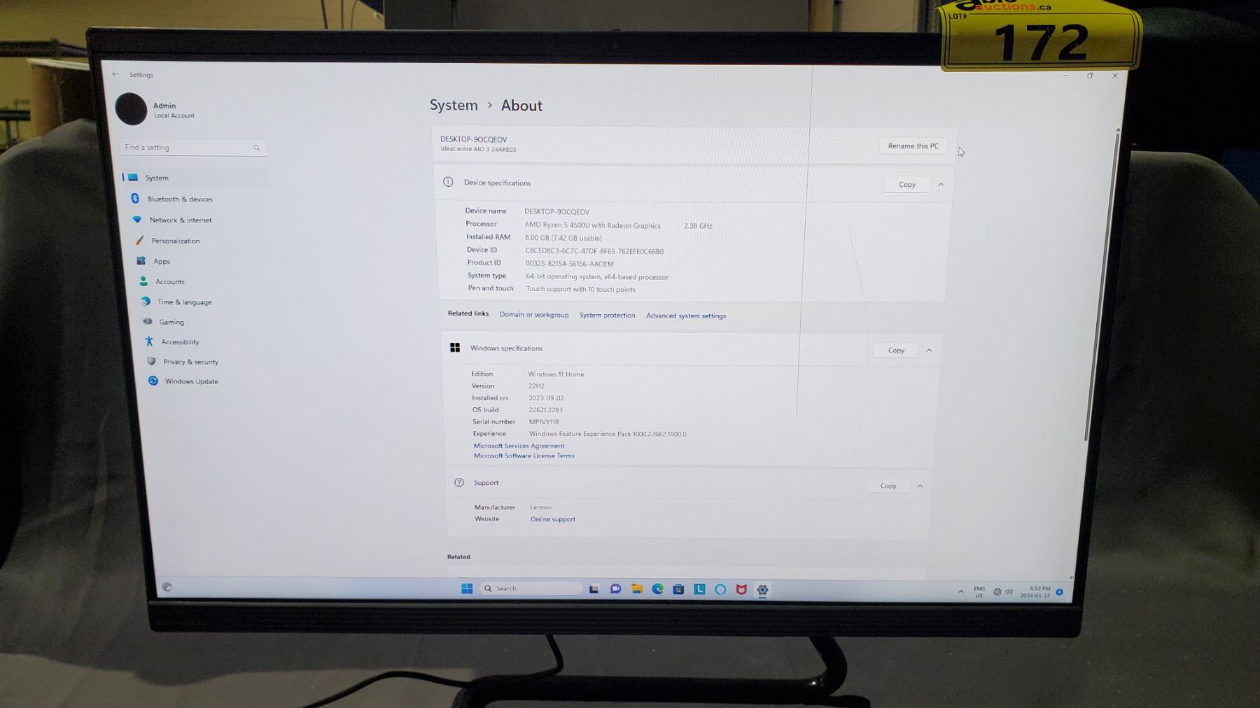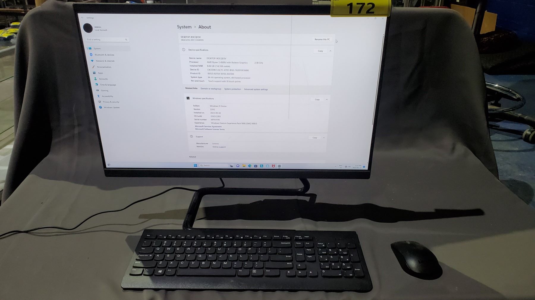 *TESTED WORKING* LENOVO ALL IN ONE COMPUTER WITH RYZEN 5 4500U CPU, RADEON 2.38 GHZ GPU, 8 GB RAM, WINDOWS 11 64 BIT OS WITH WIRELESS KEYBOARD & MOUSE (MISSING WIRELESS DONGLES, 1 LINE OF DEAD PIXELS IN SCREEN) TOUCHSCREEN