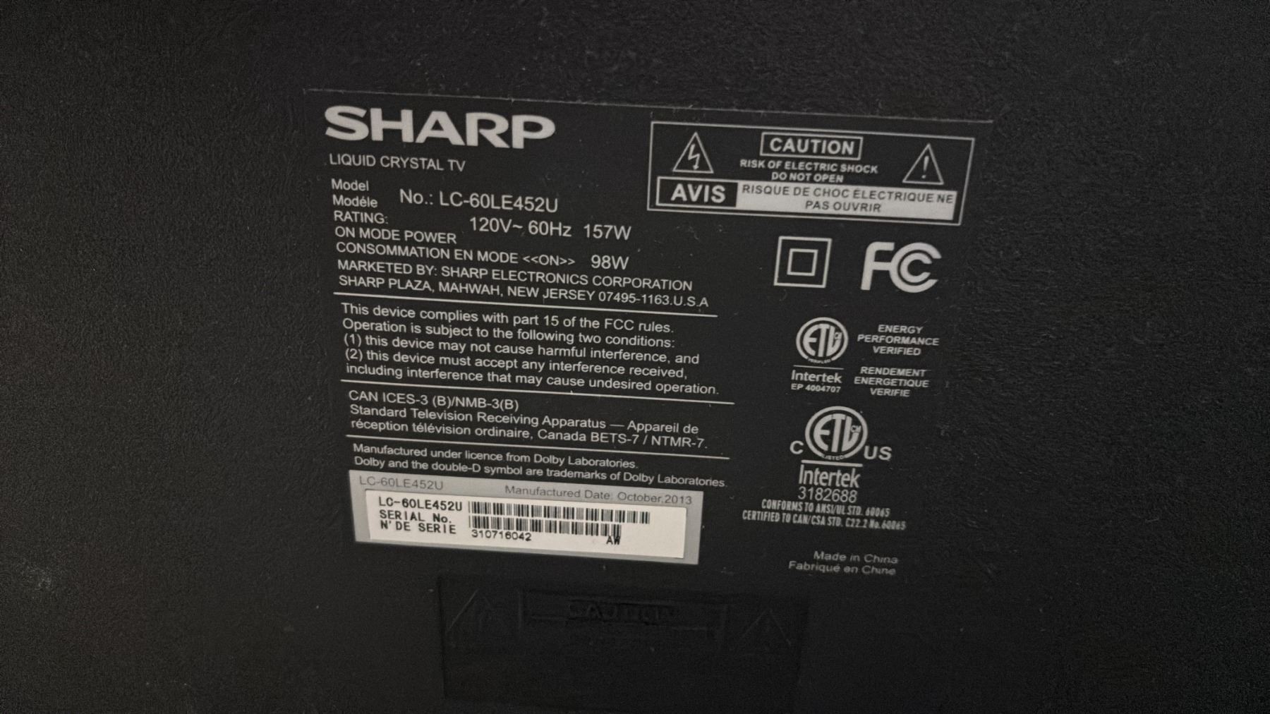 *TESTED WORKING* SHARP 60" TV WITH POWER CORD & STAND (NO REMOTE)