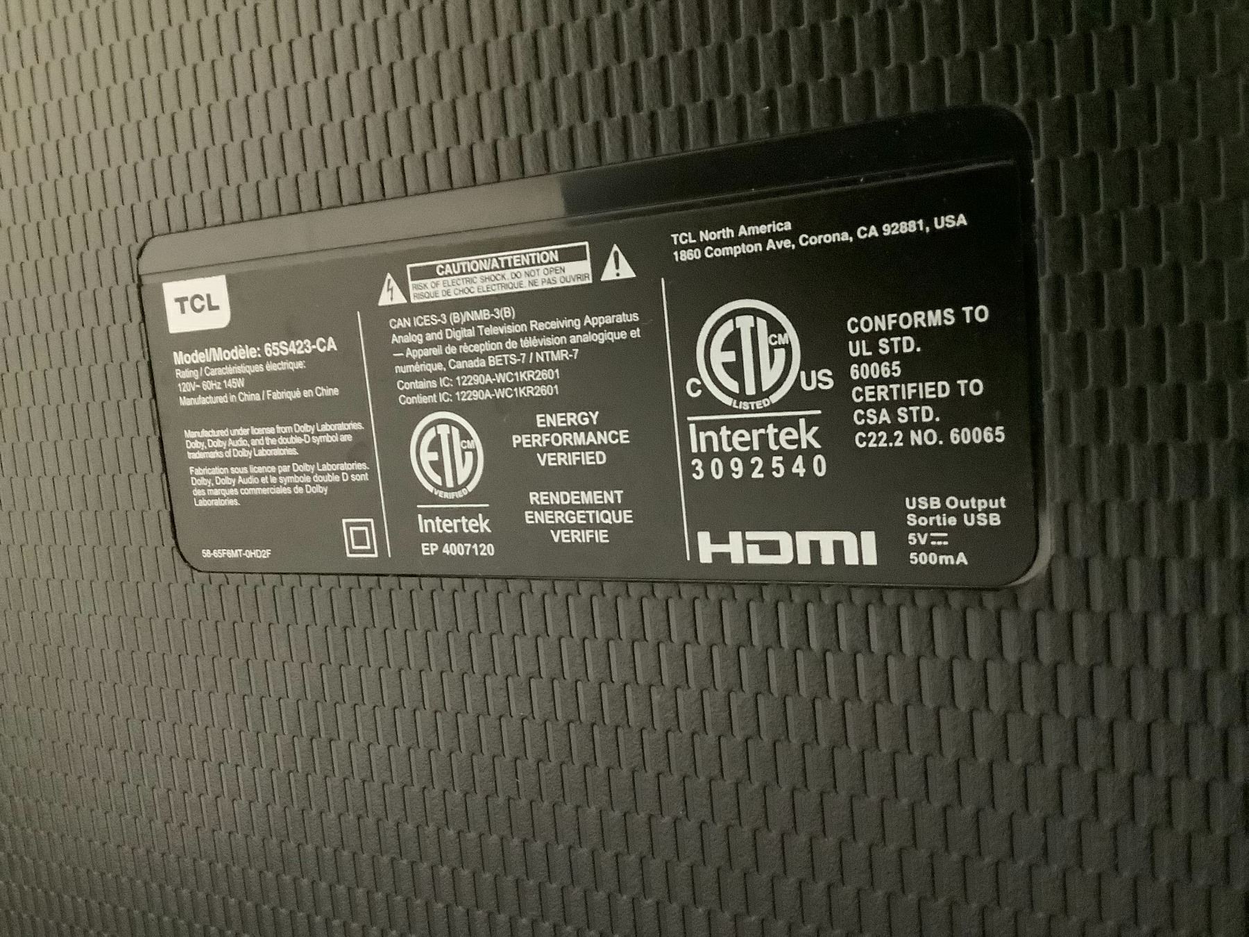 *TESTED WORKING* TCL 65" TV WITH POWER CORD (NO STAND, NO REMOTE)