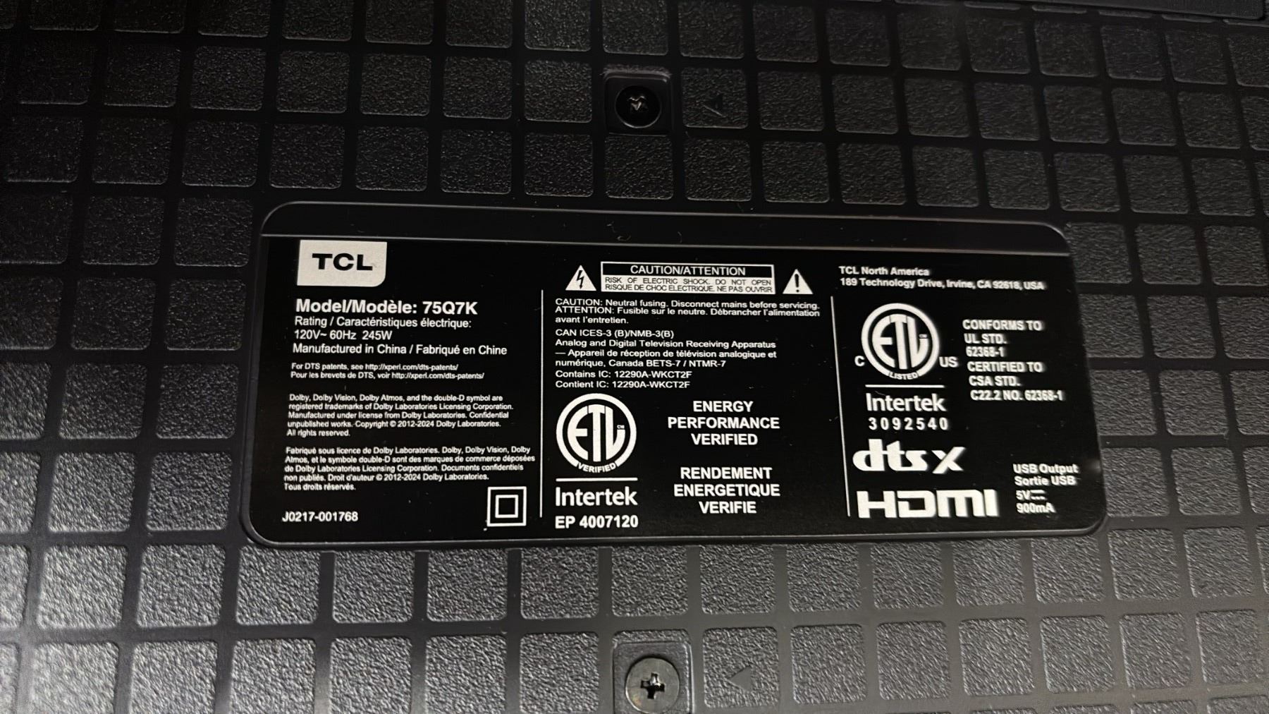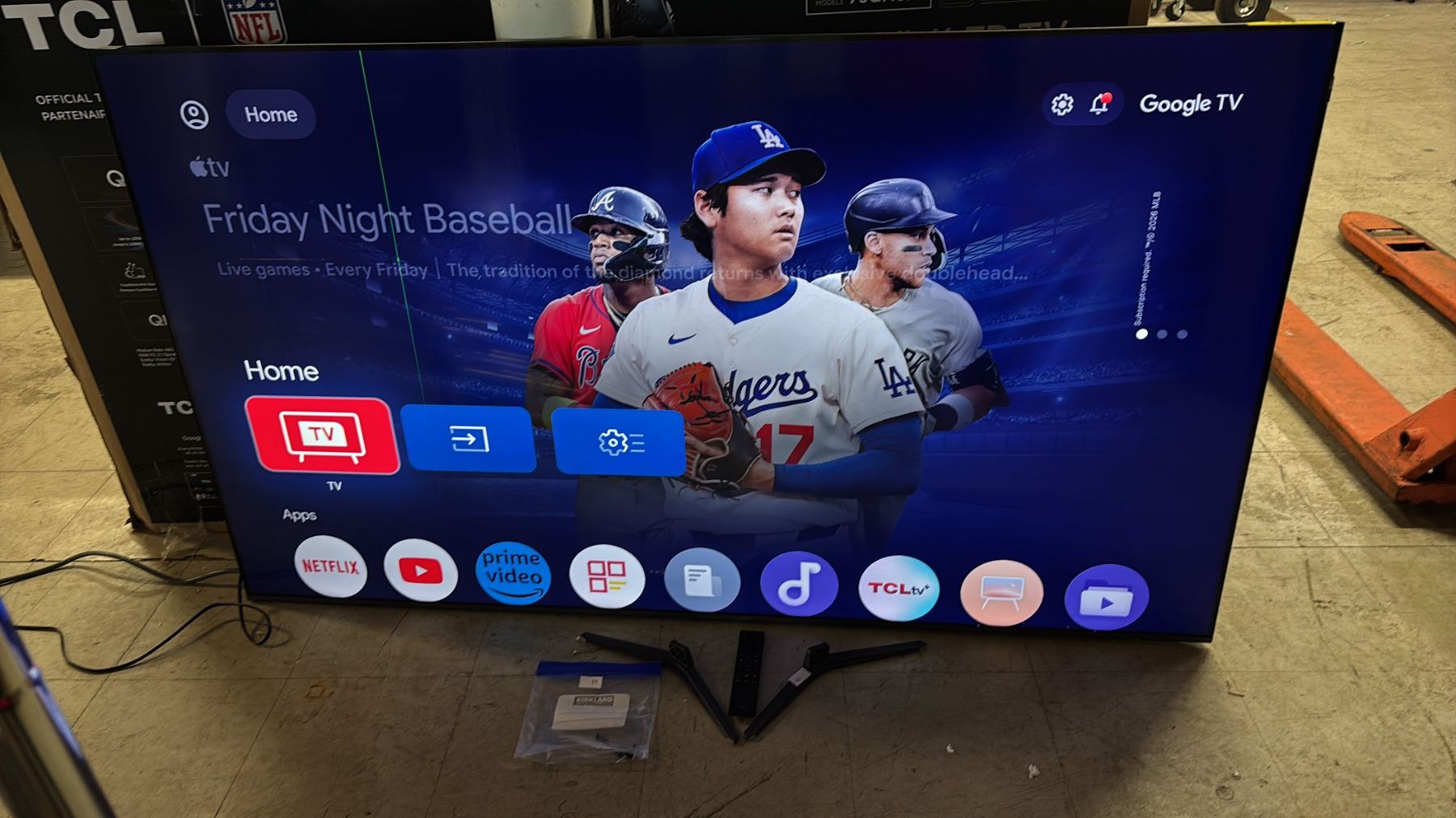 *TESTED WORKING* TCL GOOGLE 75" TV WITH POWER CORD, STAND & REMOTE (2 DEAD PIXEL LINES ON SCREEN)